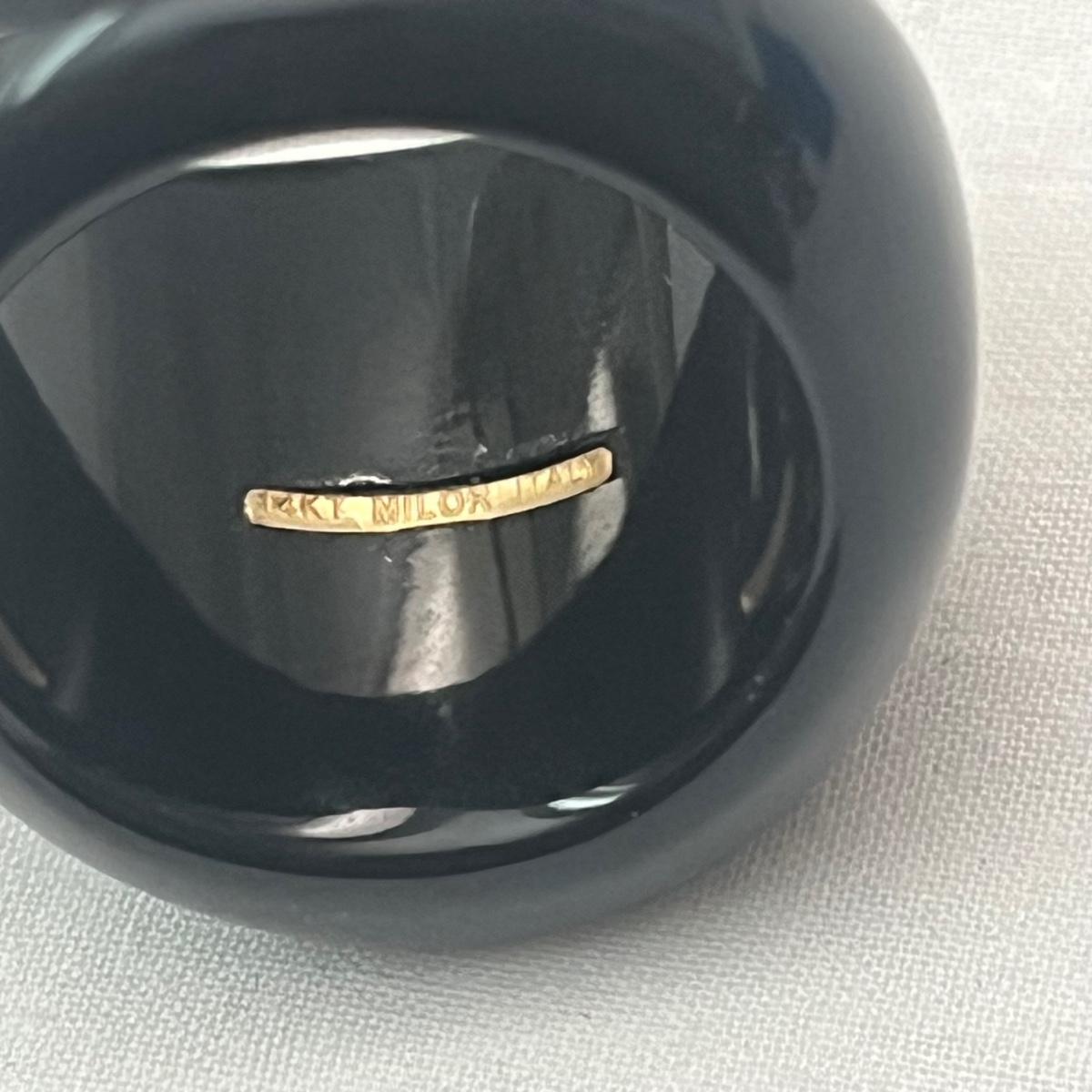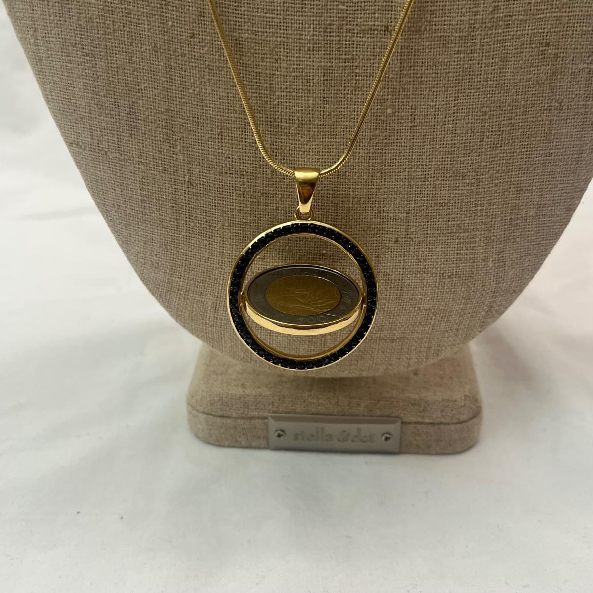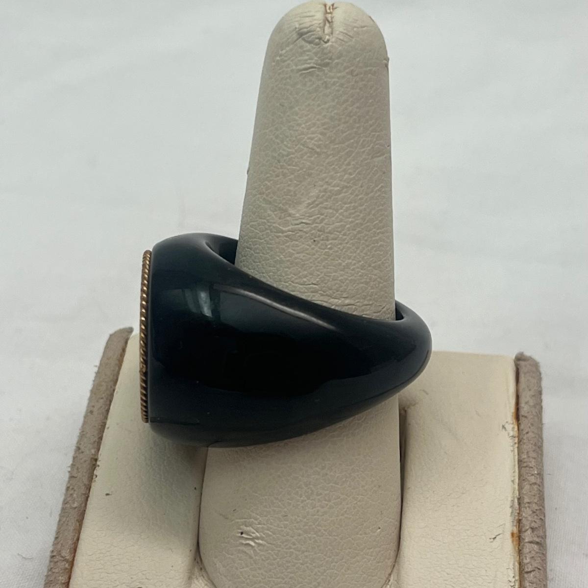 Lot includes a size 11 black resin like ring with Italian coin that is marked 14k and an Italian gold colored coin necklace that is marked Belleezza, Italy that measures 24” long. Coin rotates In pendant, see pictures
