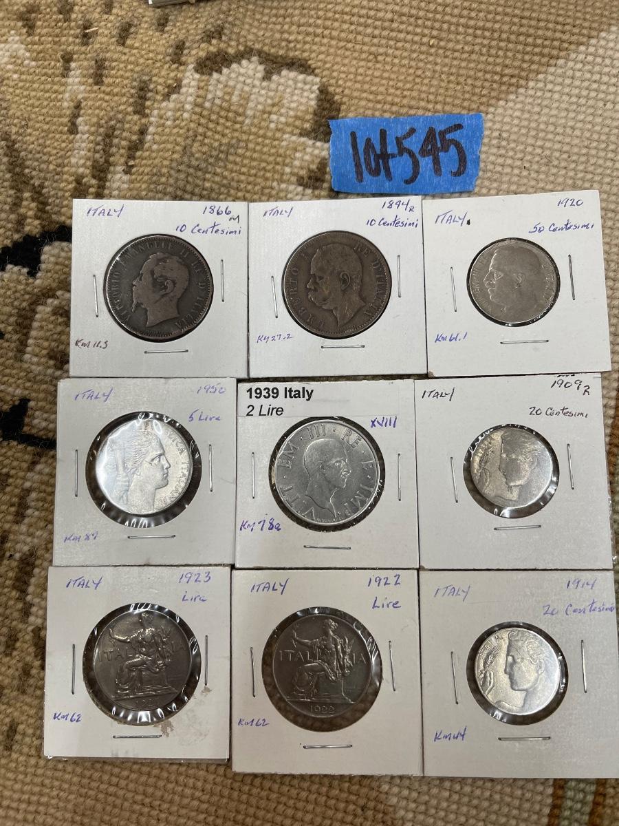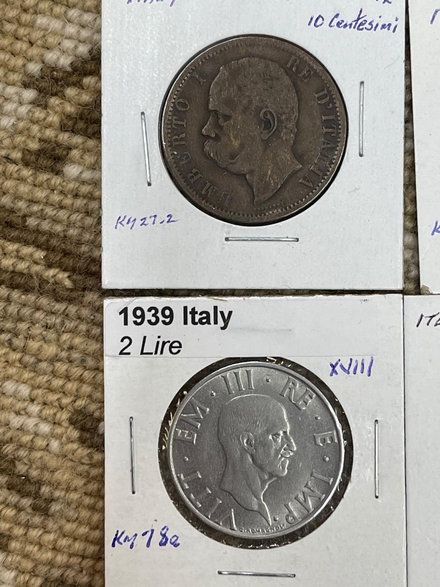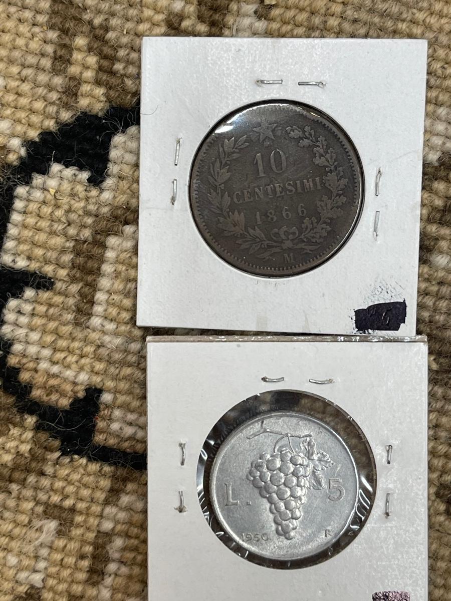 (9) vintage Italian coins - 1866M 10 centensimo, 1894R 10 centensimo, 1920 50 centensimo, 1950 5 lira, 1939 2 lira, 1909R 20 centensimo, 1923 lira, 1922 lira, 1914 20 centensimo.