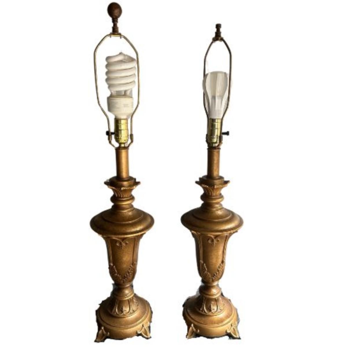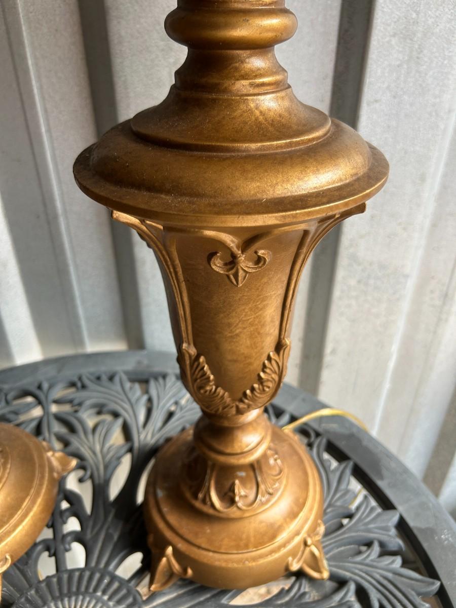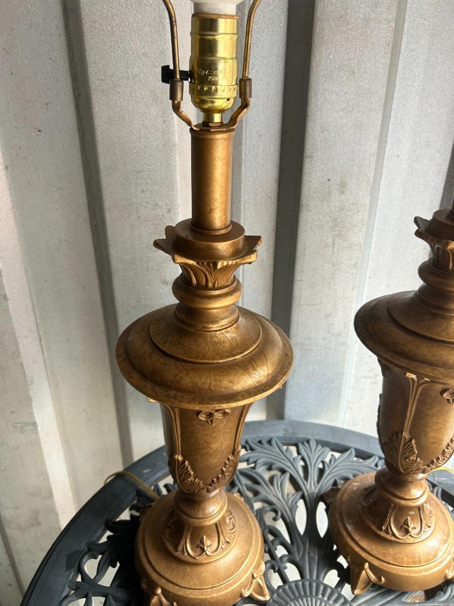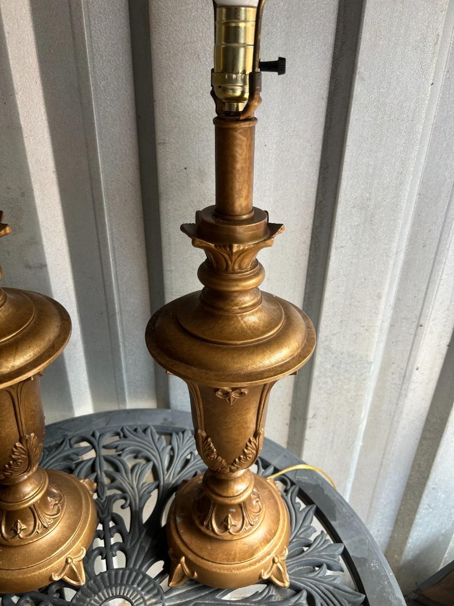 This pair of heavy, Italian Gilt-style lamps are both in excellent condition. This set came from a defunct movie prop house.