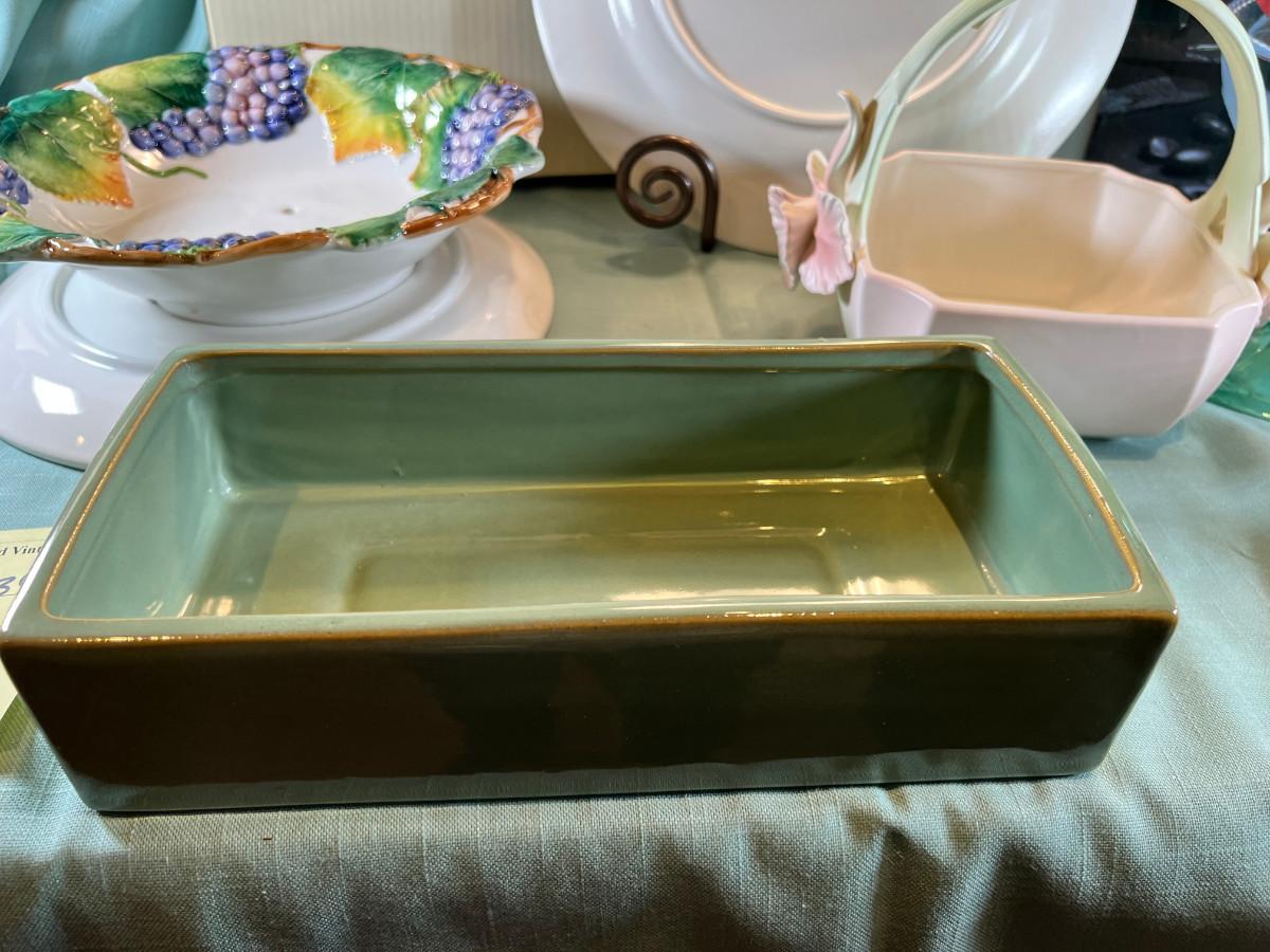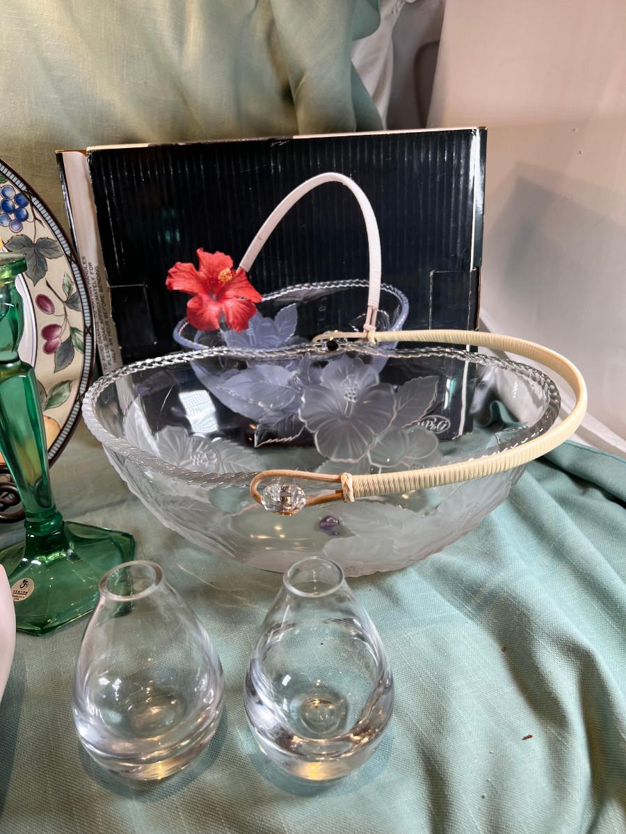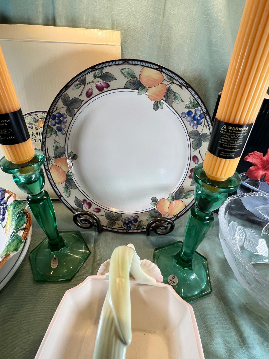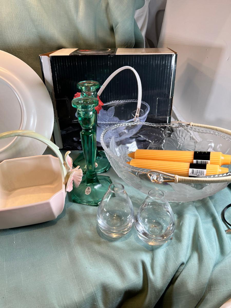 Italian Grape bowl, with bottom plate, New Mikasa plate, New Aroco French glass basket, Vintage green Fenton candle sticks, with new tapers. Ceramic Orchid basket, glass vases, small bud holders. Green rectangular floral display or serving vessel.
