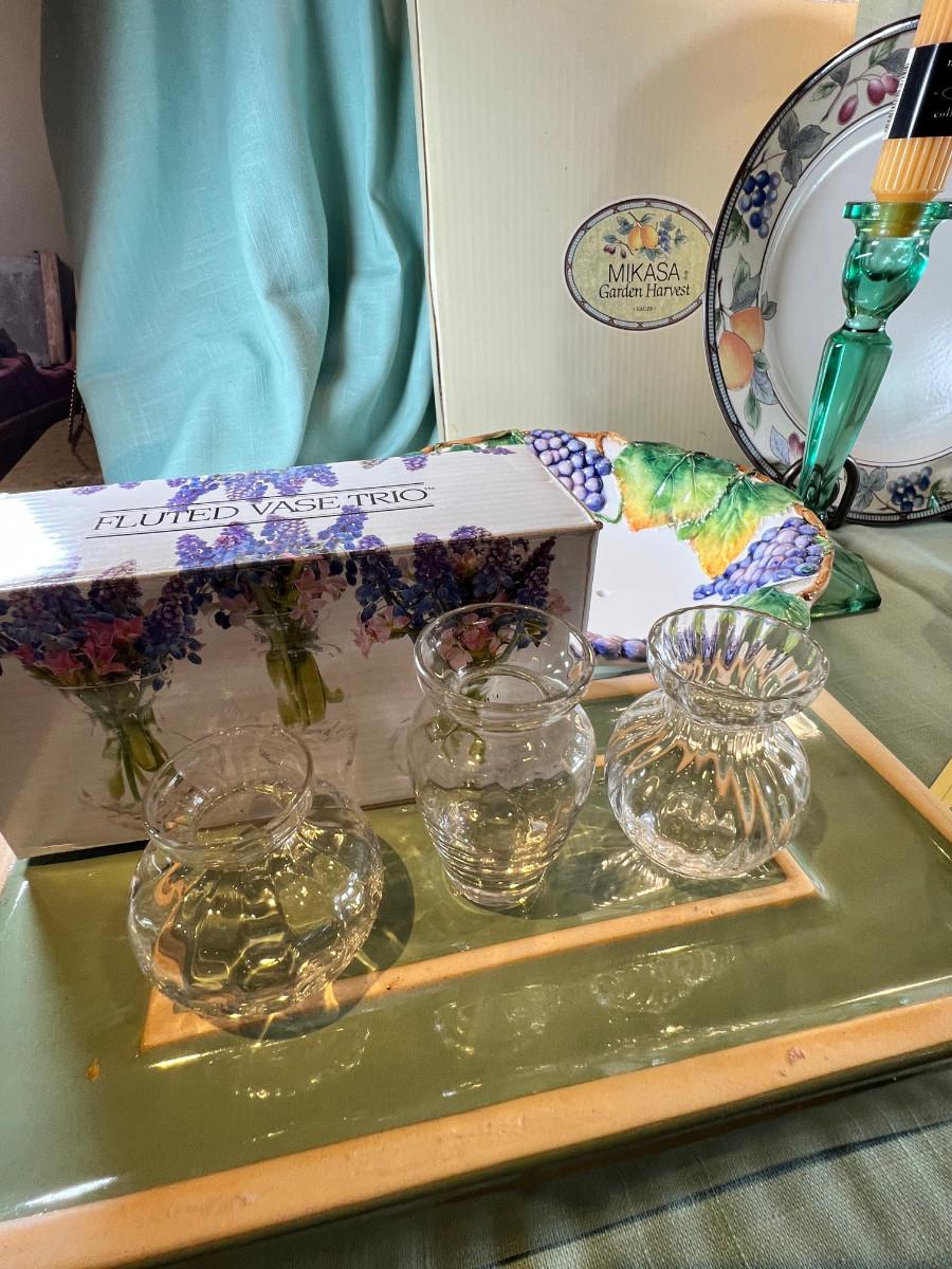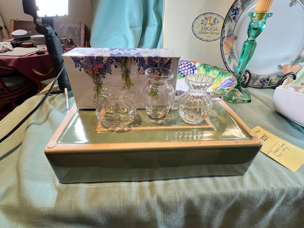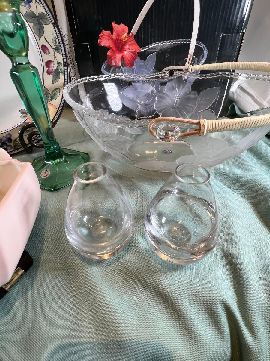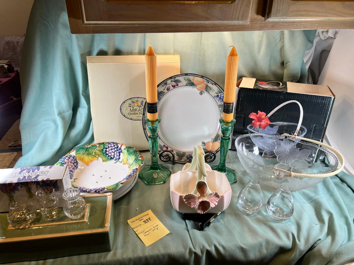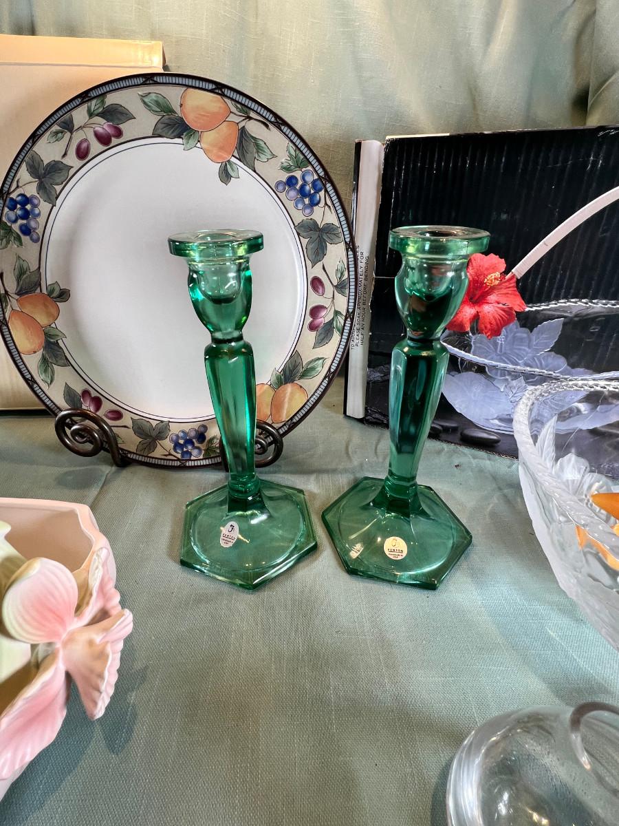 Italian Grape bowl, with bottom plate, New Mikasa plate, New Aroco French glass basket, Vintage green Fenton candle sticks, with new tapers. Ceramic Orchid basket, glass vases, small bud holders. Green rectangular floral display or serving vessel.