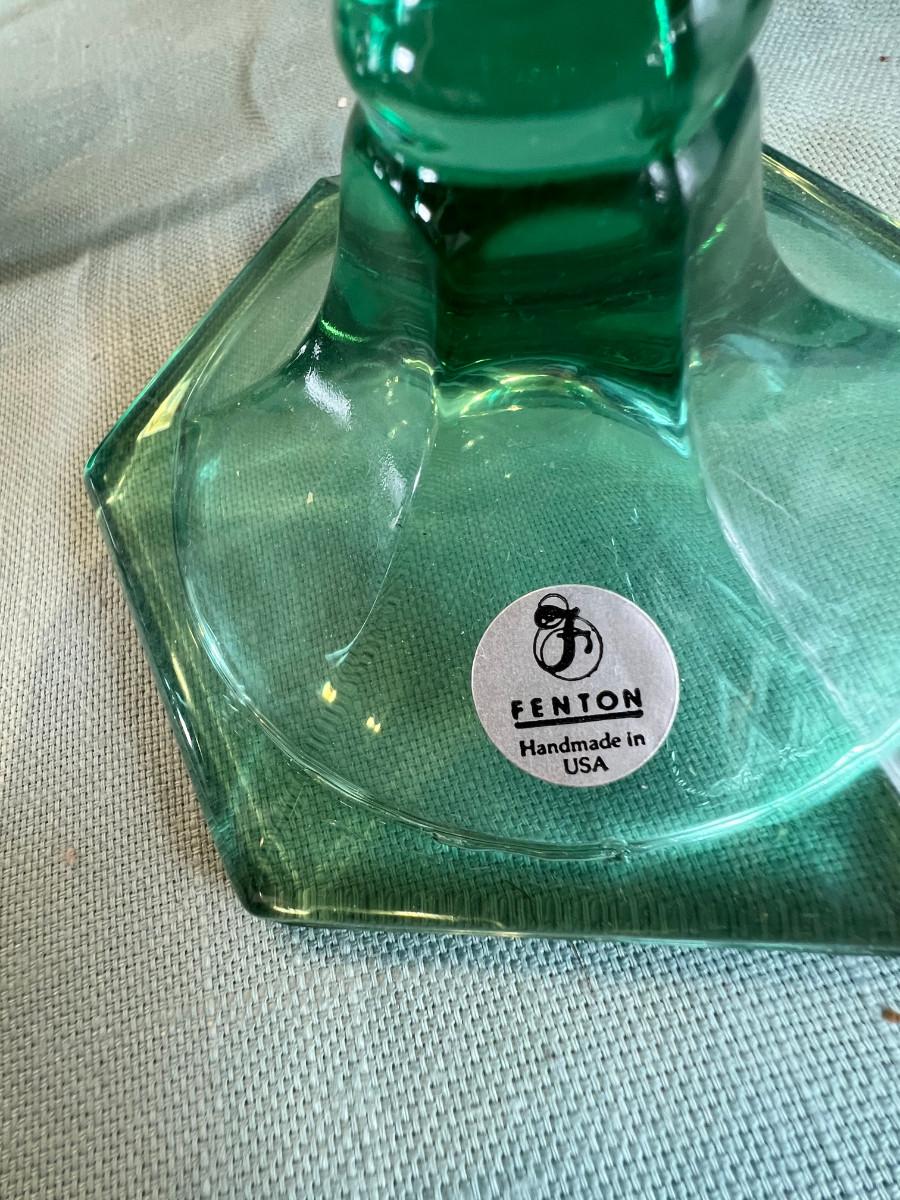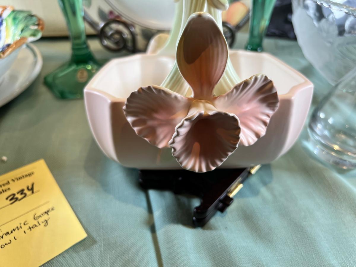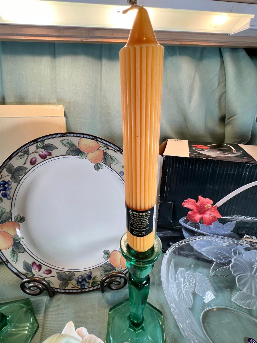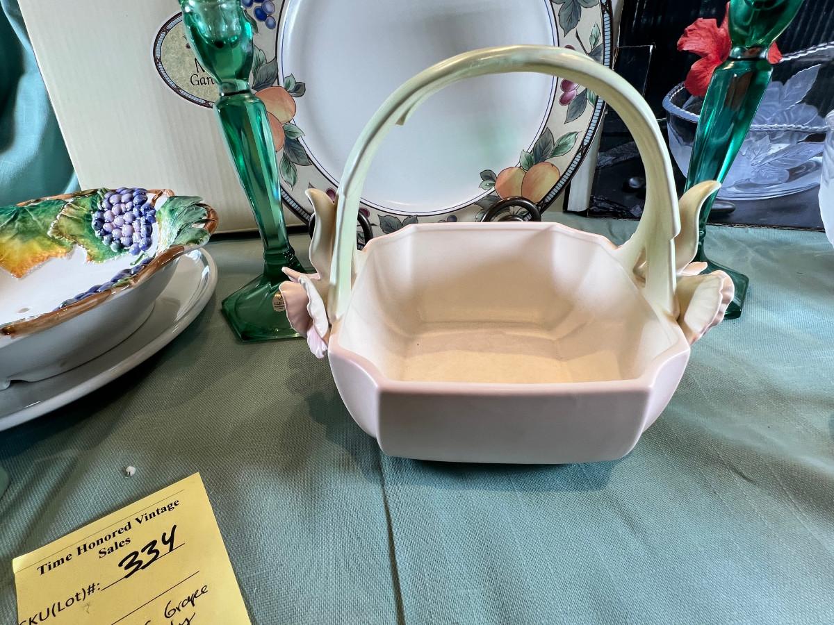 Italian Grape bowl, with bottom plate, New Mikasa plate, New Aroco French glass basket, Vintage green Fenton candle sticks, with new tapers. Ceramic Orchid basket, glass vases, small bud holders. Green rectangular floral display or serving vessel.