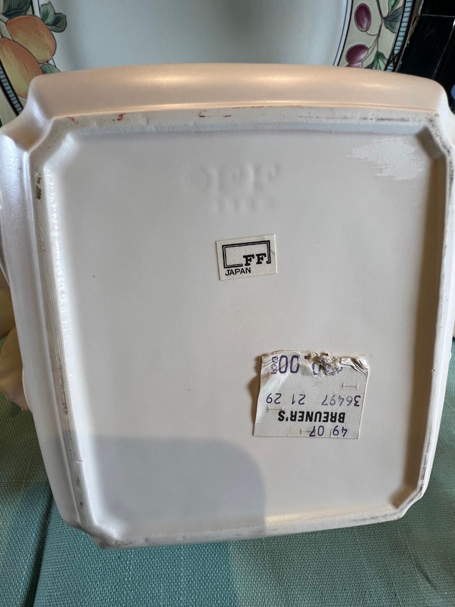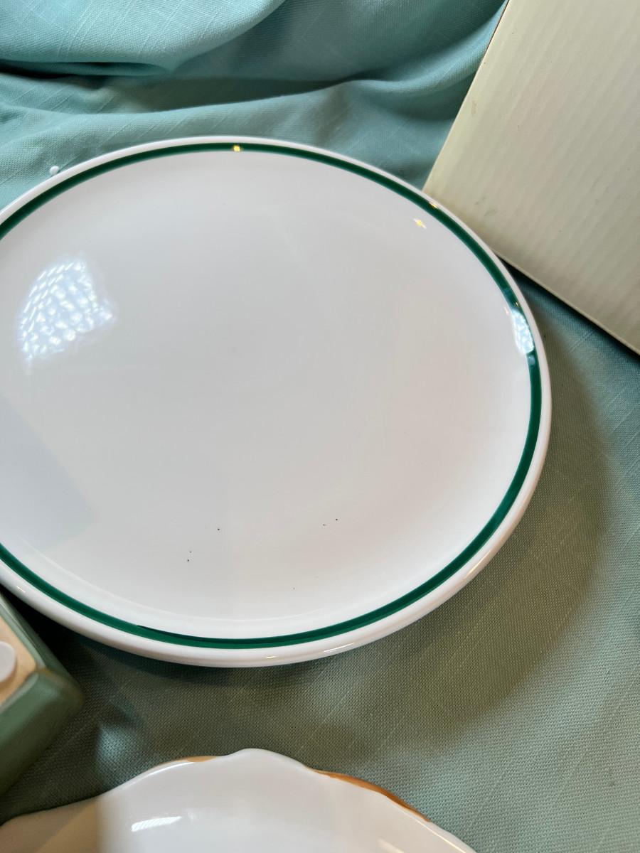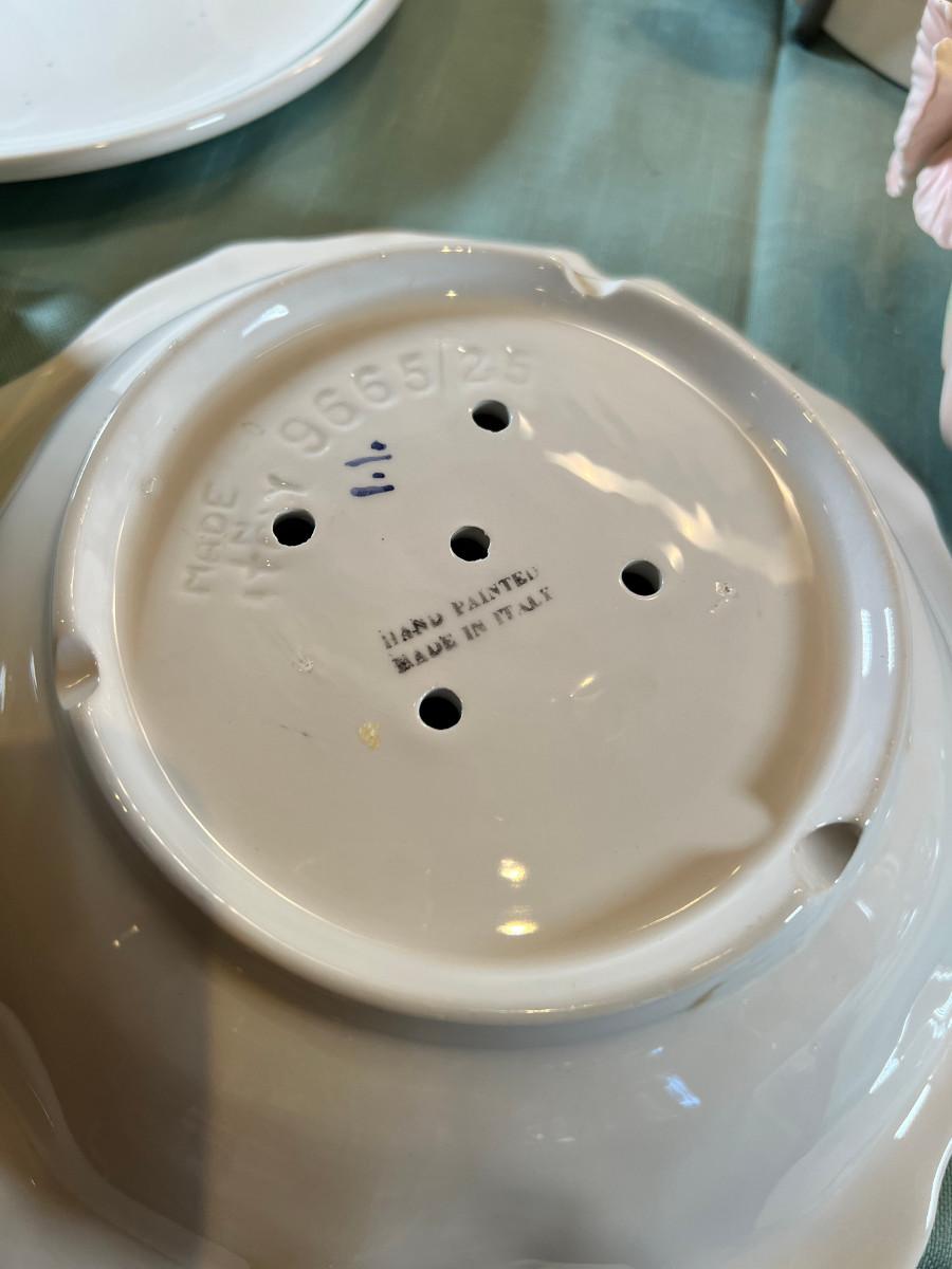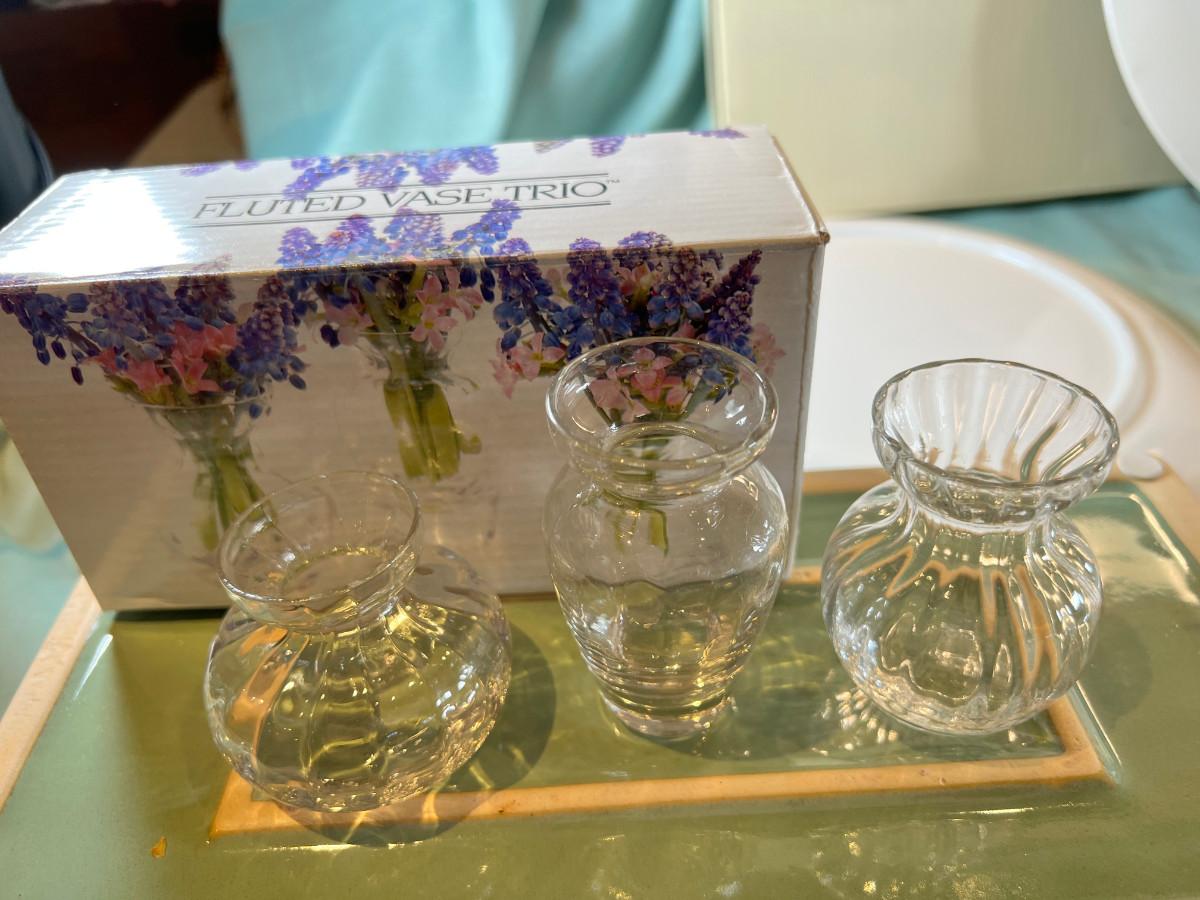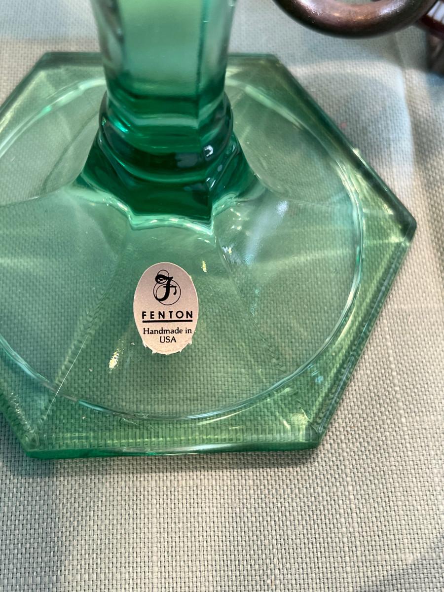 Italian Grape bowl, with bottom plate, New Mikasa plate, New Aroco French glass basket, Vintage green Fenton candle sticks, with new tapers. Ceramic Orchid basket, glass vases, small bud holders. Green rectangular floral display or serving vessel.