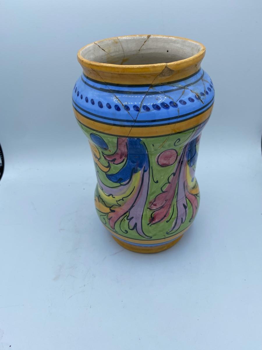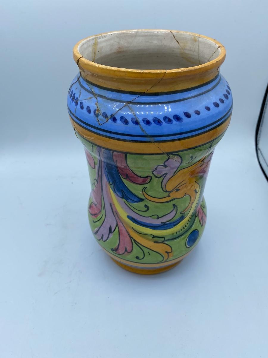 Colorful Italian vase, very pretty as a display piece. Has been repaired. Height 8"