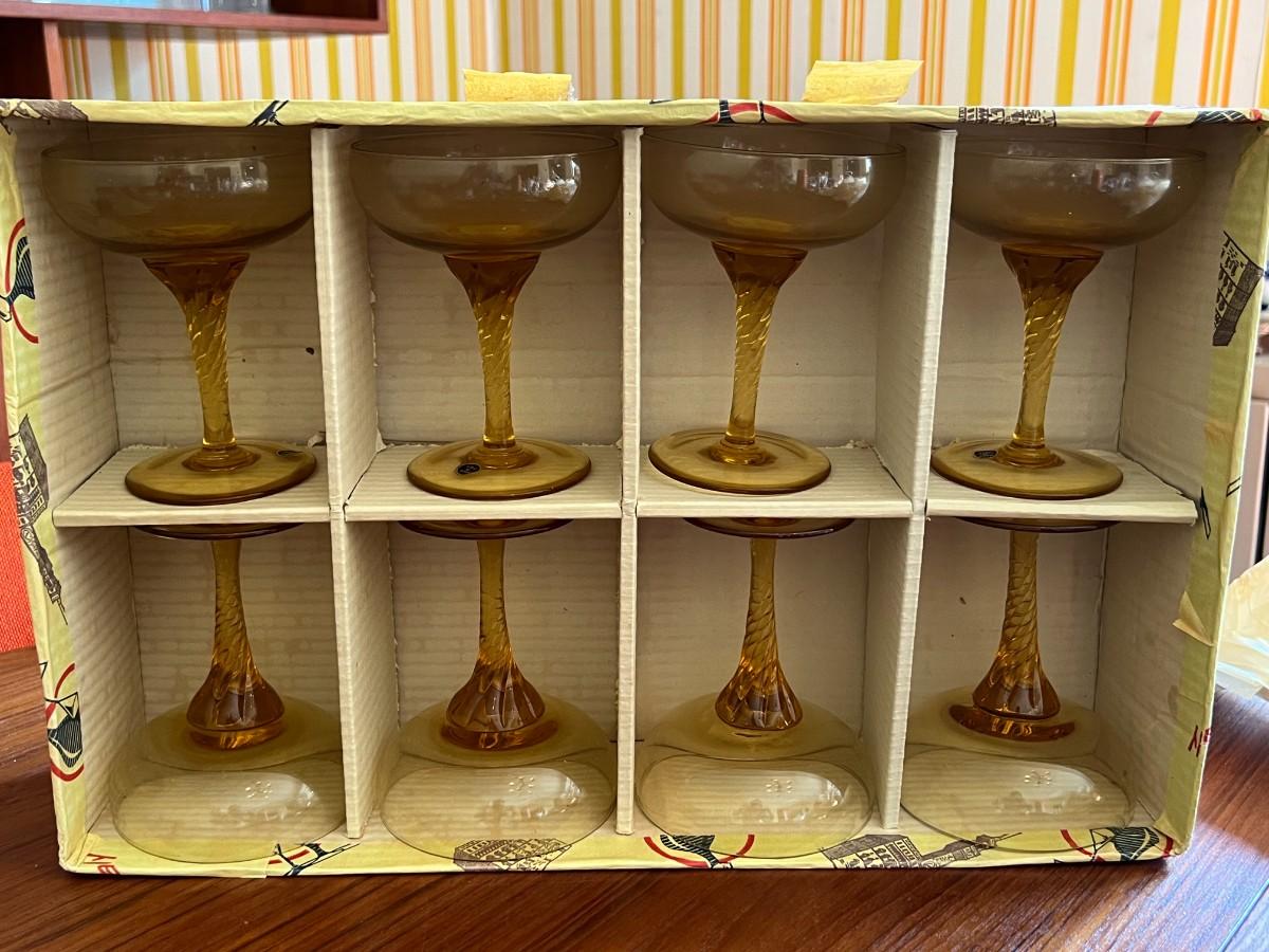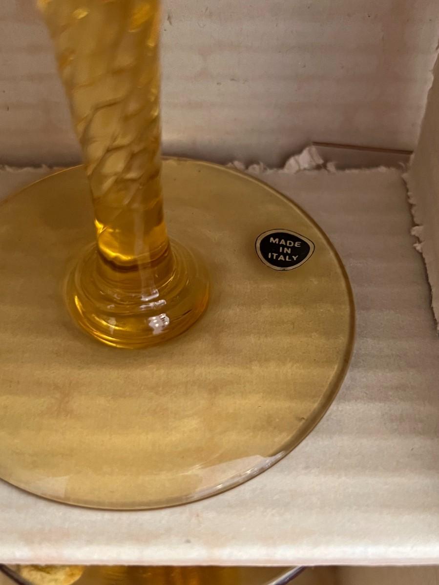 Italian Handblown Amber Glass Champagne Coupes w/ Twisted Stem- Set of 8 in original box