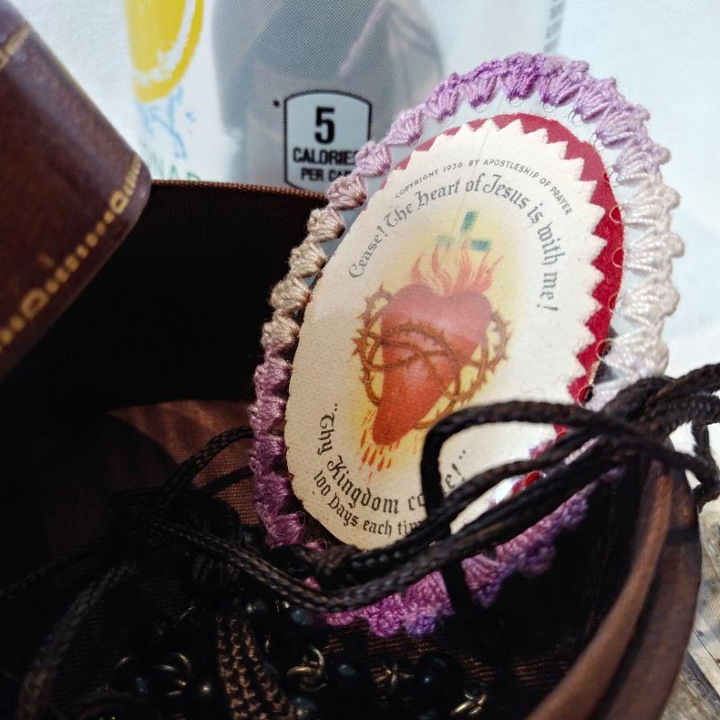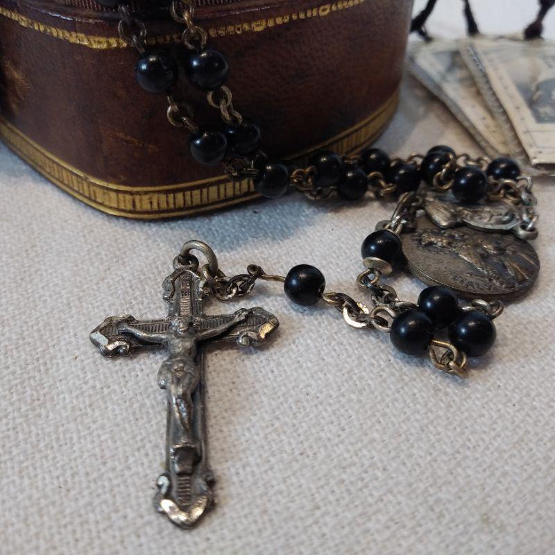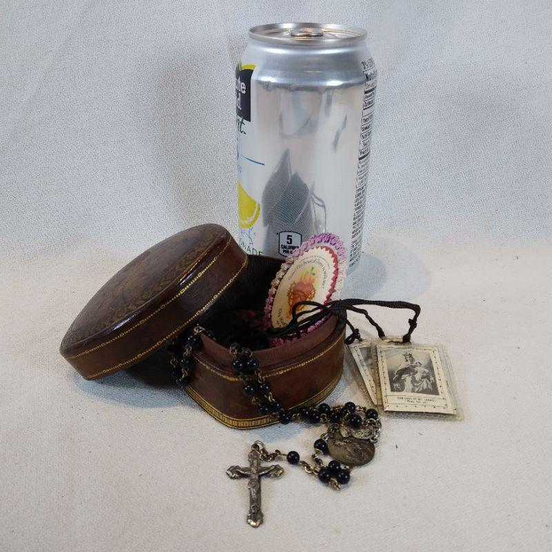 The Italian leather box was made in Florence and is full of Catholic religious items - Scapulars and a black small-beaded sterling silver Rosary also made in Italy. Box is 3 1/2-inches wide X 3-inches in diameter X 2-inches tall. Box shows some wear and scratches but still a nice keepsake. A little leather polish would go far,