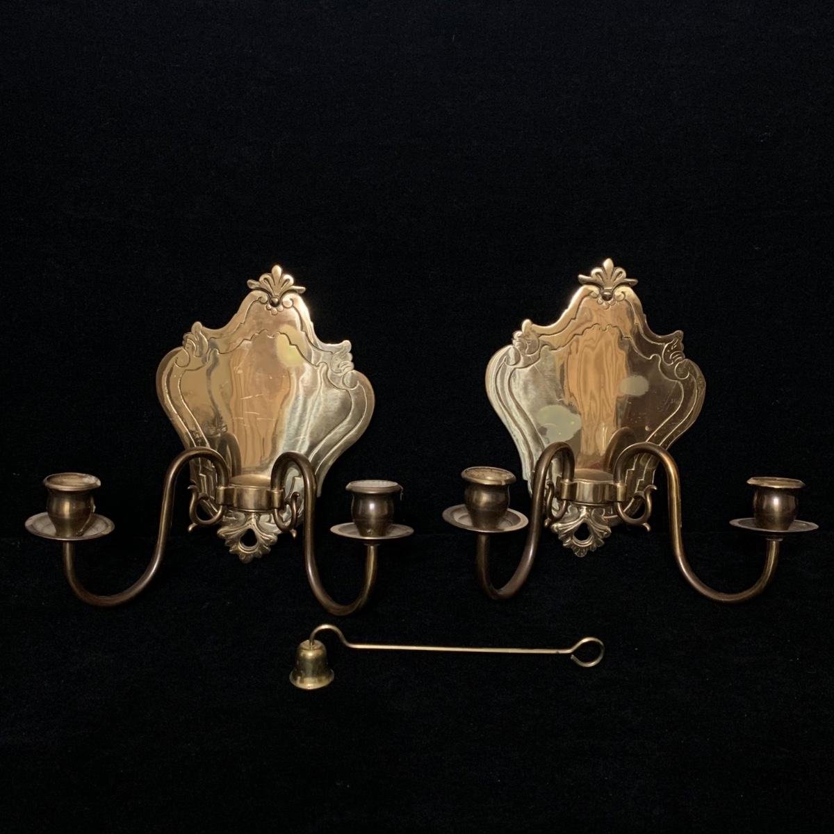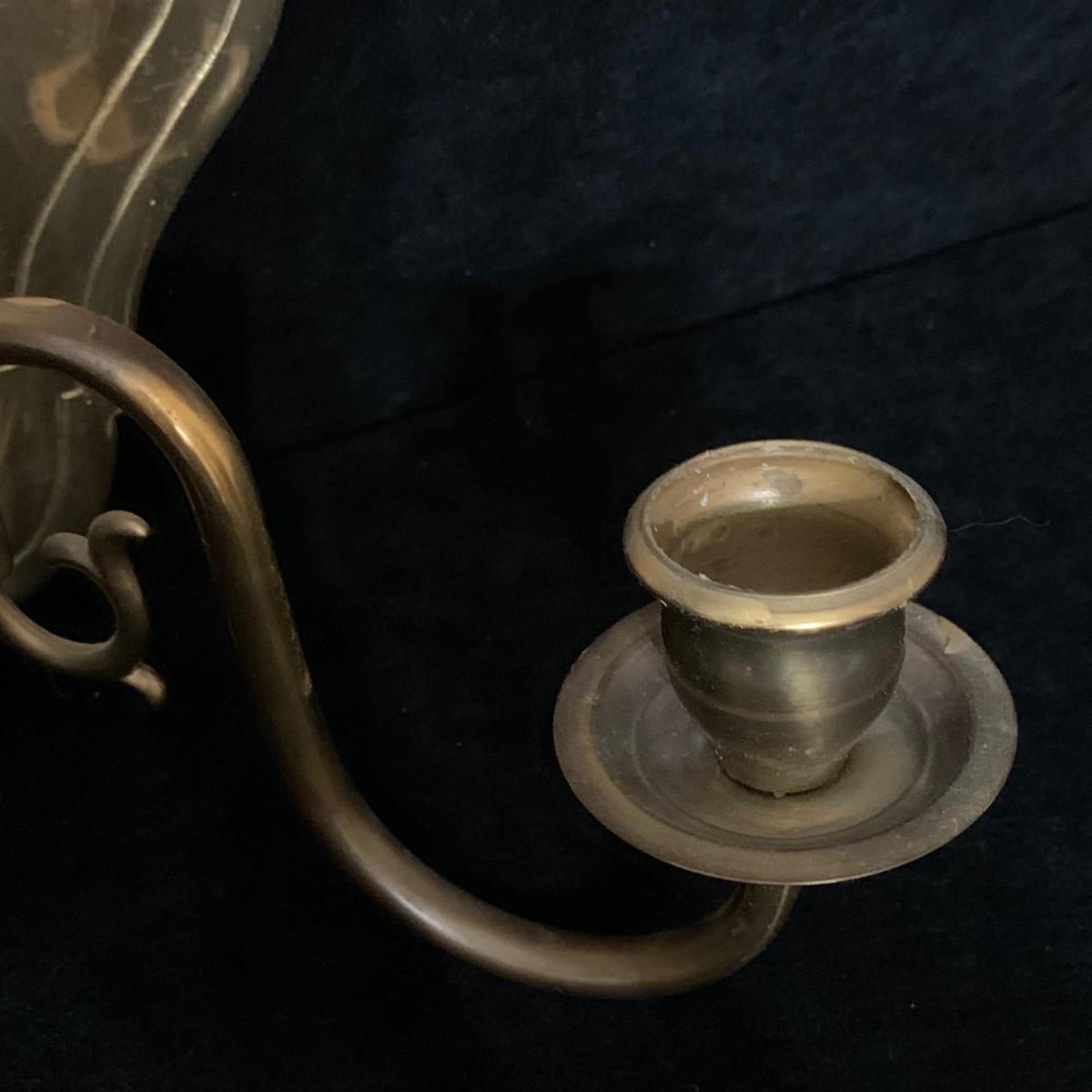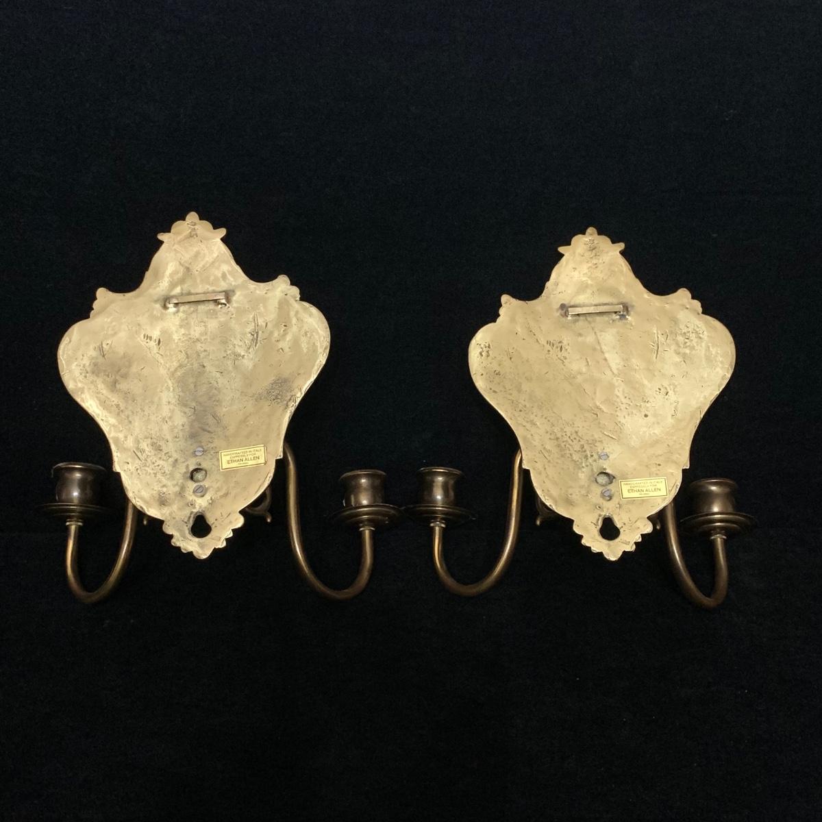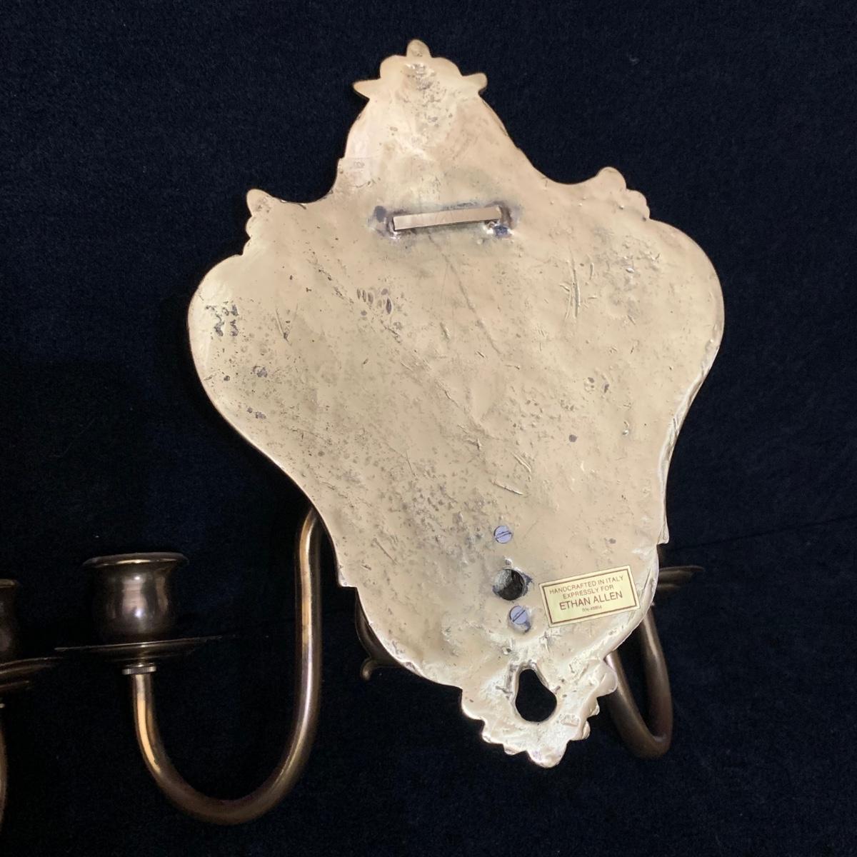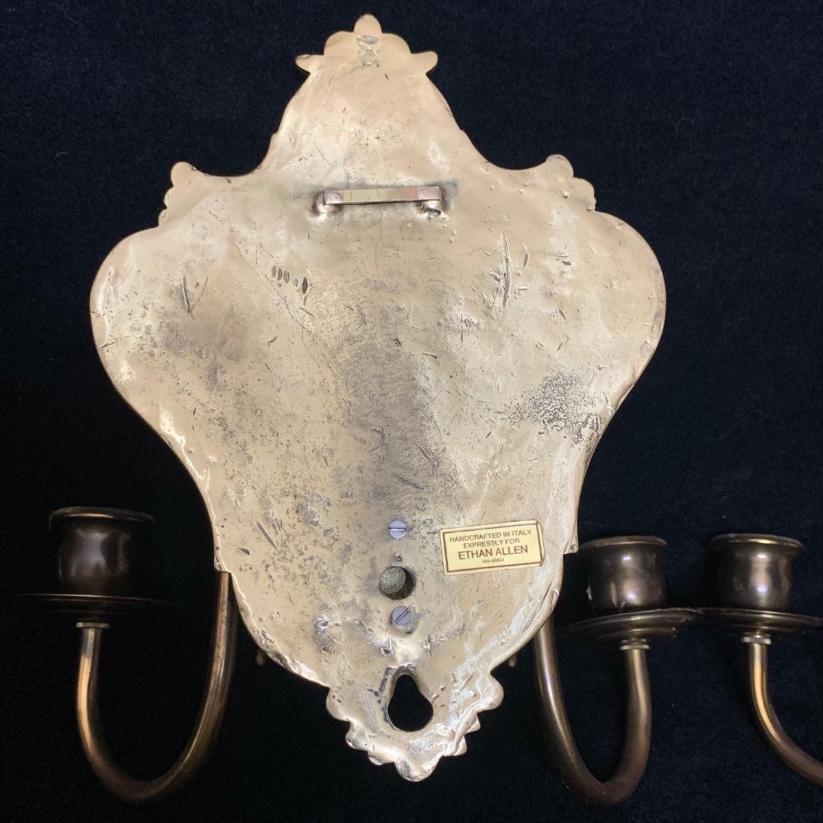 A beautiful Italian made pair of metal wall mounted candle sconces with a brass finish, by Ethan Allen. Each sconce holds two candles. The mount measures 7.5” x 10.5”. The are structurally in good condition, though some of the finish has rubbed off on both of them. Also included is a brass candle snuffer.