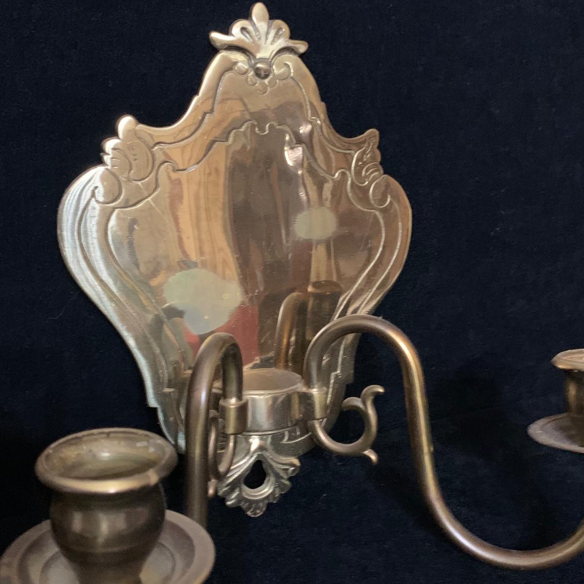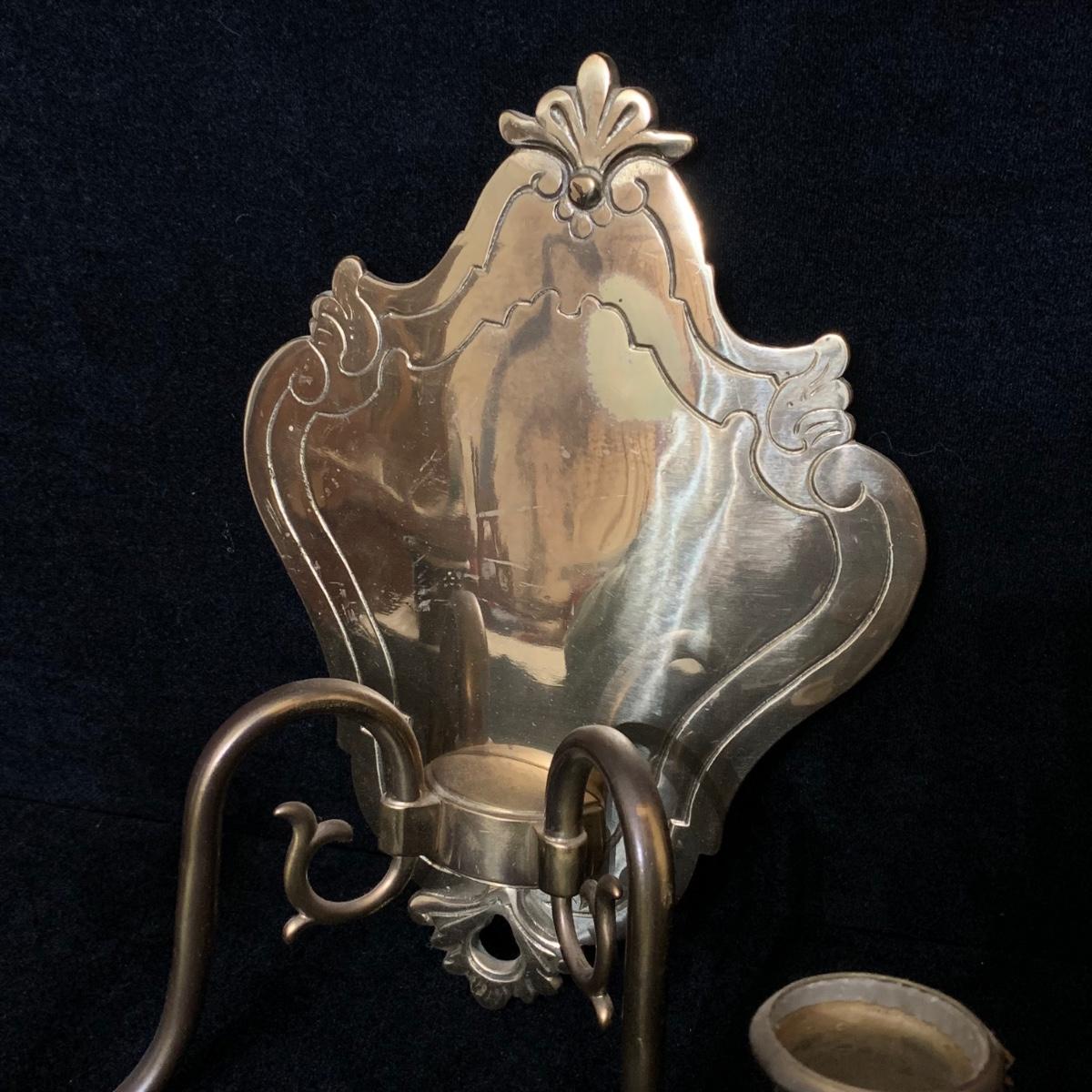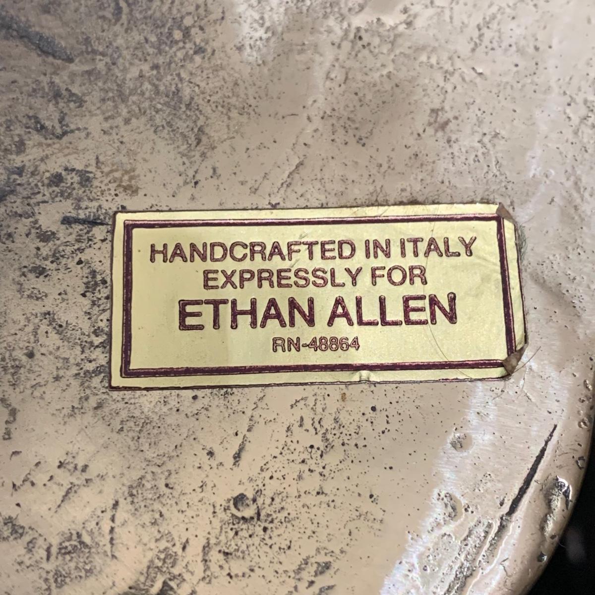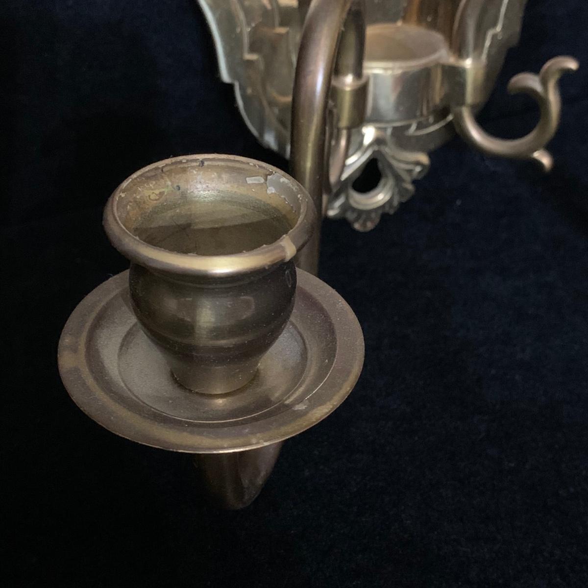 A beautiful Italian made pair of metal wall mounted candle sconces with a brass finish, by Ethan Allen. Each sconce holds two candles. The mount measures 7.5” x 10.5”. The are structurally in good condition, though some of the finish has rubbed off on both of them. Also included is a brass candle snuffer.