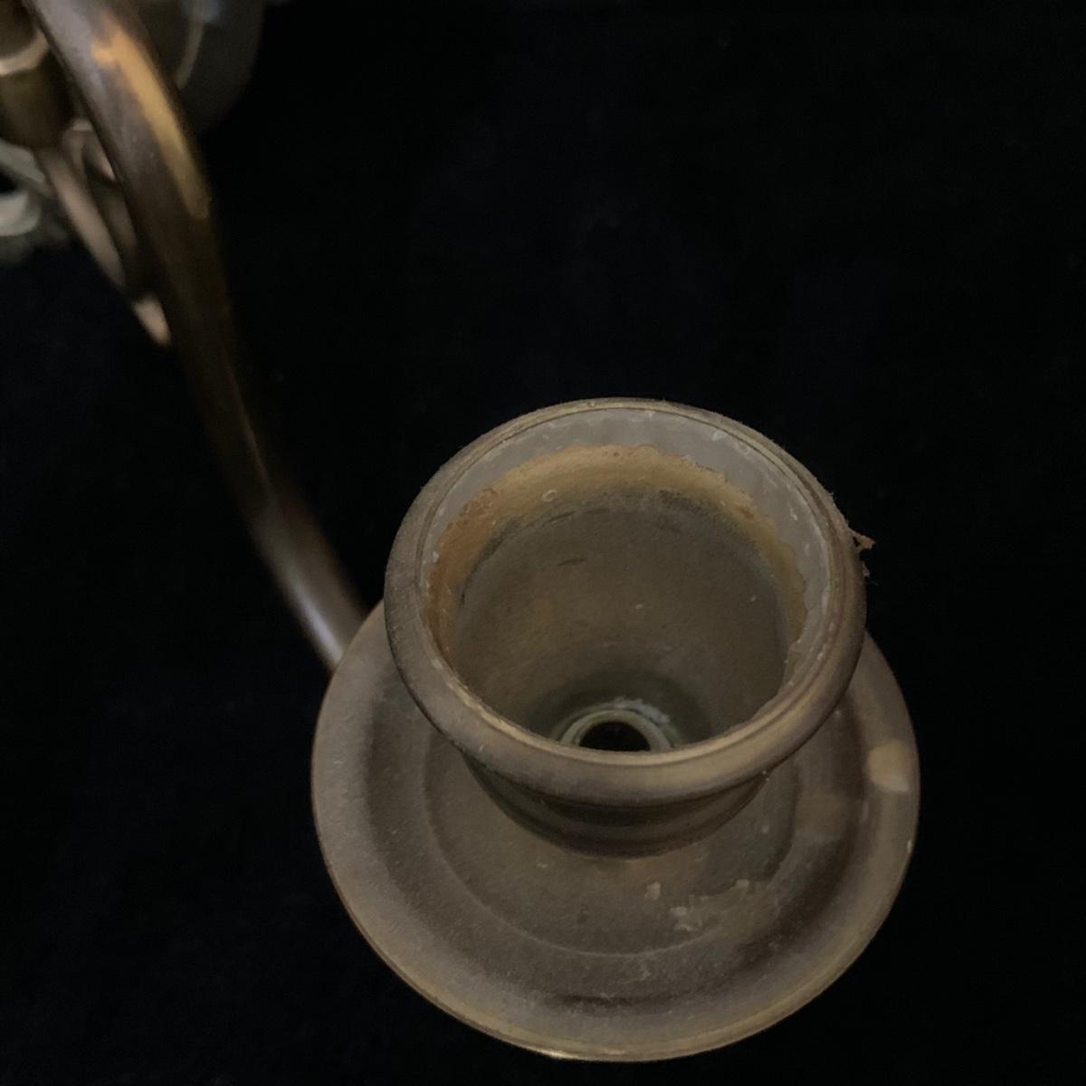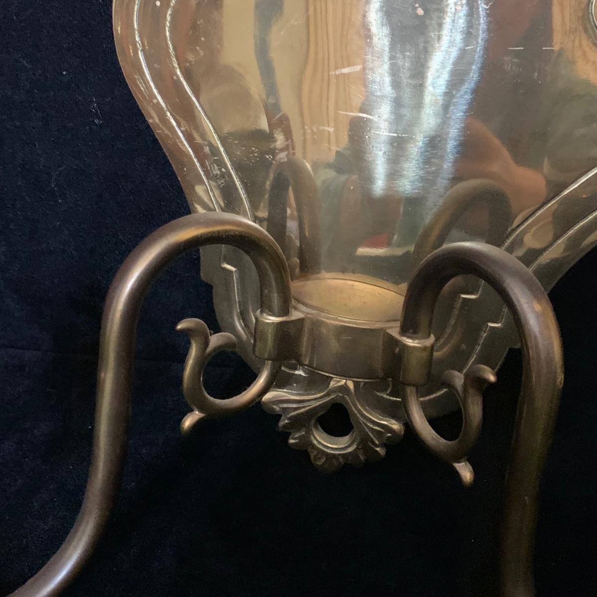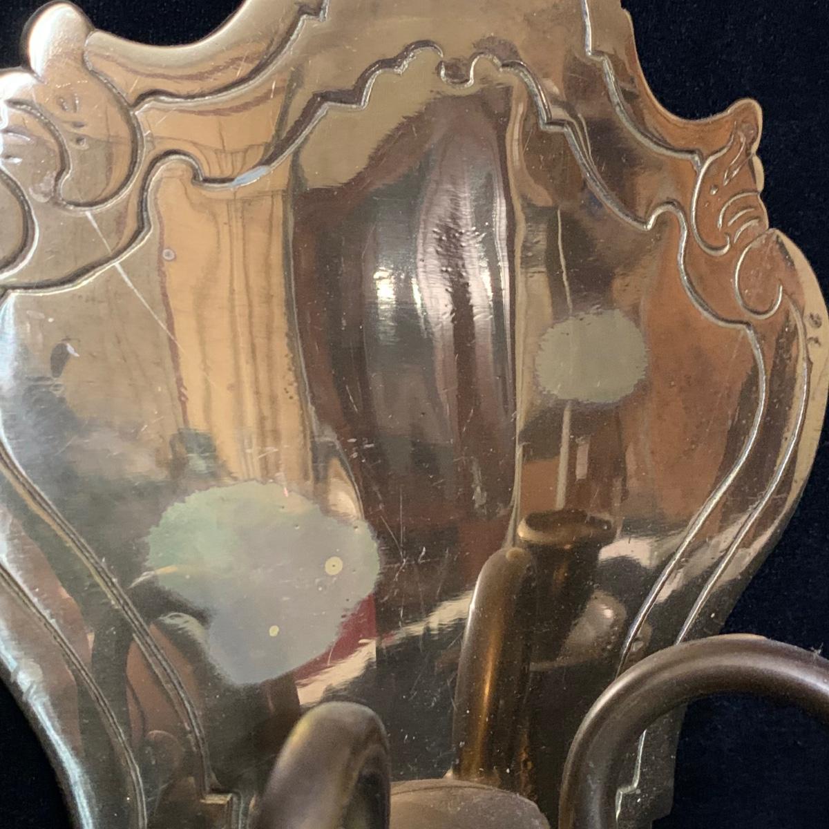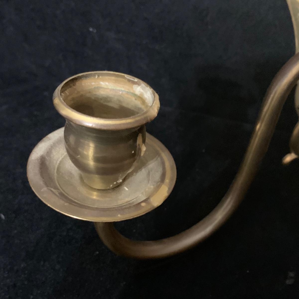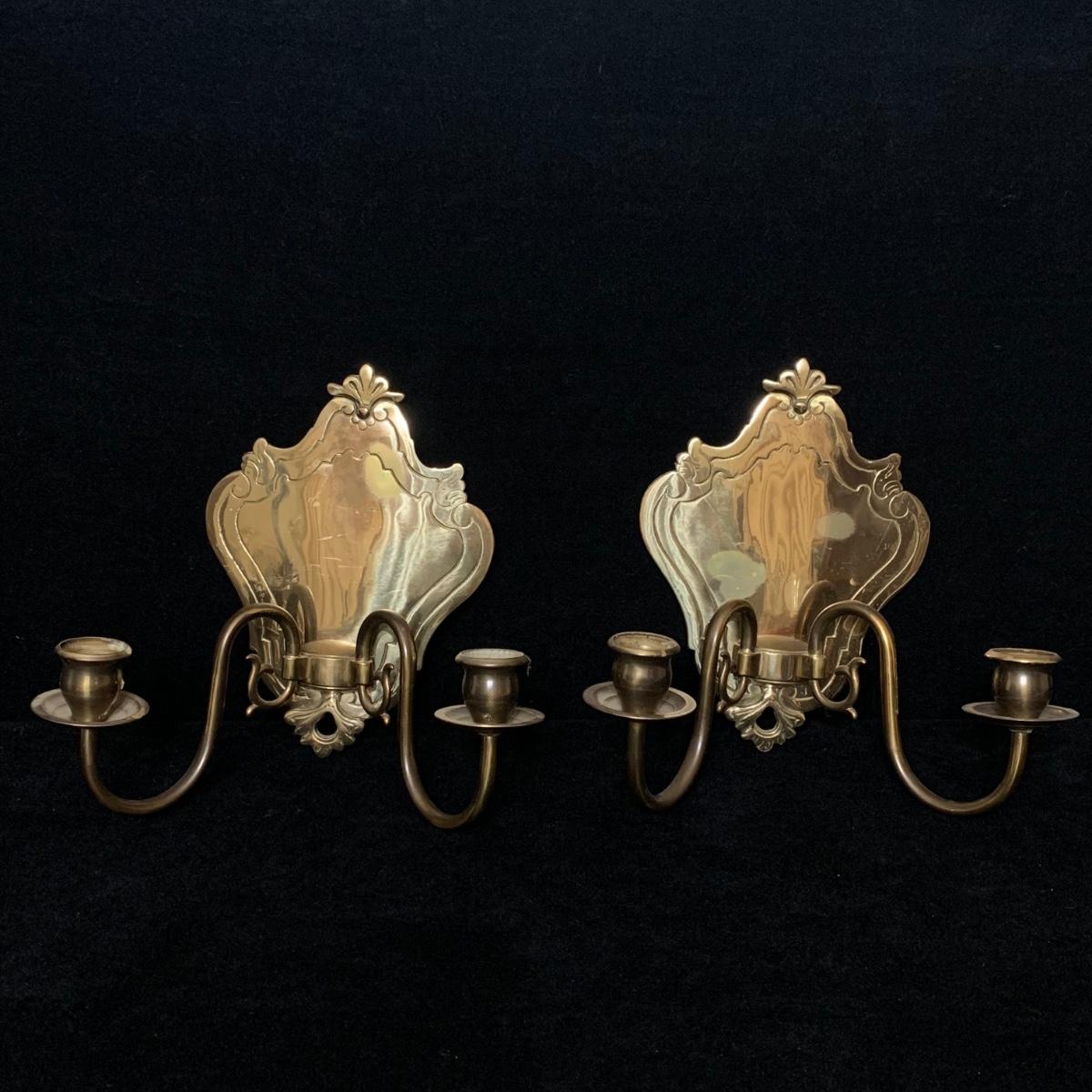 A beautiful Italian made pair of metal wall mounted candle sconces with a brass finish, by Ethan Allen. Each sconce holds two candles. The mount measures 7.5” x 10.5”. The are structurally in good condition, though some of the finish has rubbed off on both of them. Also included is a brass candle snuffer.