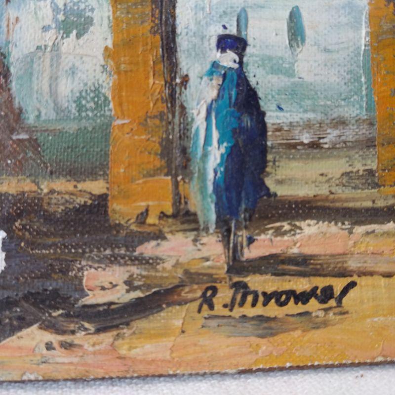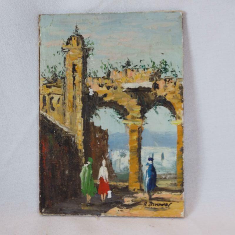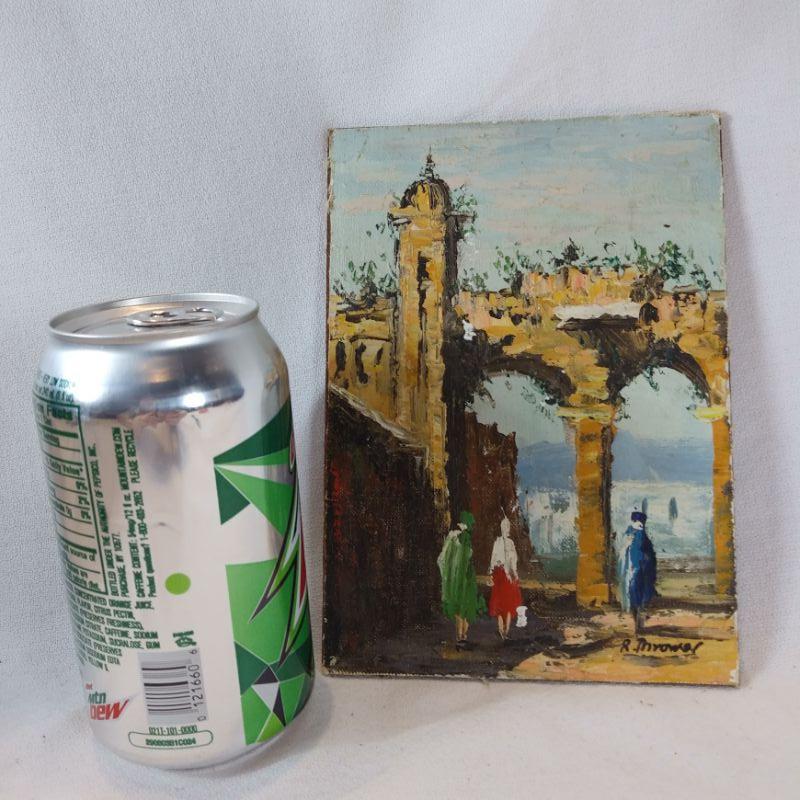 This is a very nice, miniature oil painting on canvas board. Looks to be Italian from the late 50's or early 60's. Signed by R. Tnromel? The paining measures 5-inches wide X 7-inches tall. Standard frame size. In very good shape - ready to frame and hang.