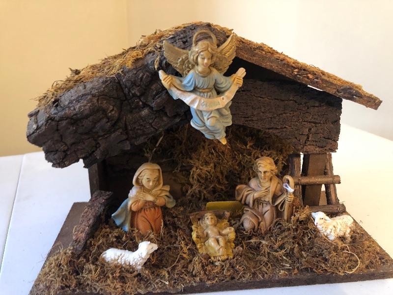 This natuvity is made in a Italy and has a $50 price tag on it. The figures are attached and made of plastic or resin. The crèche is wooden and moss covered. It is 12” wide, 8” tall and 5 12” deep.