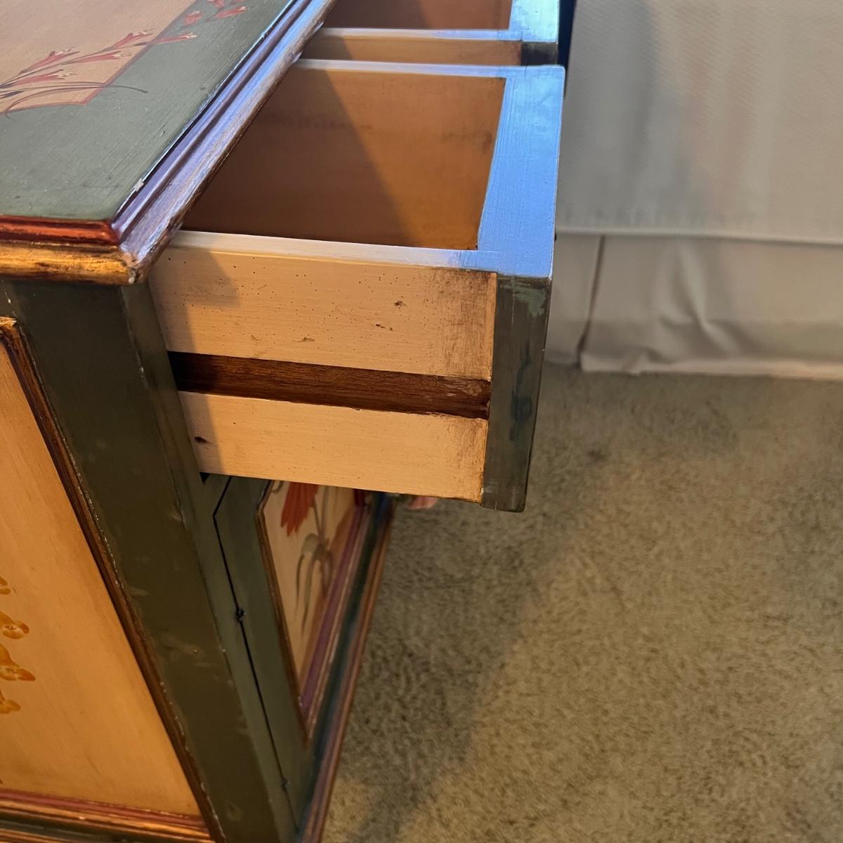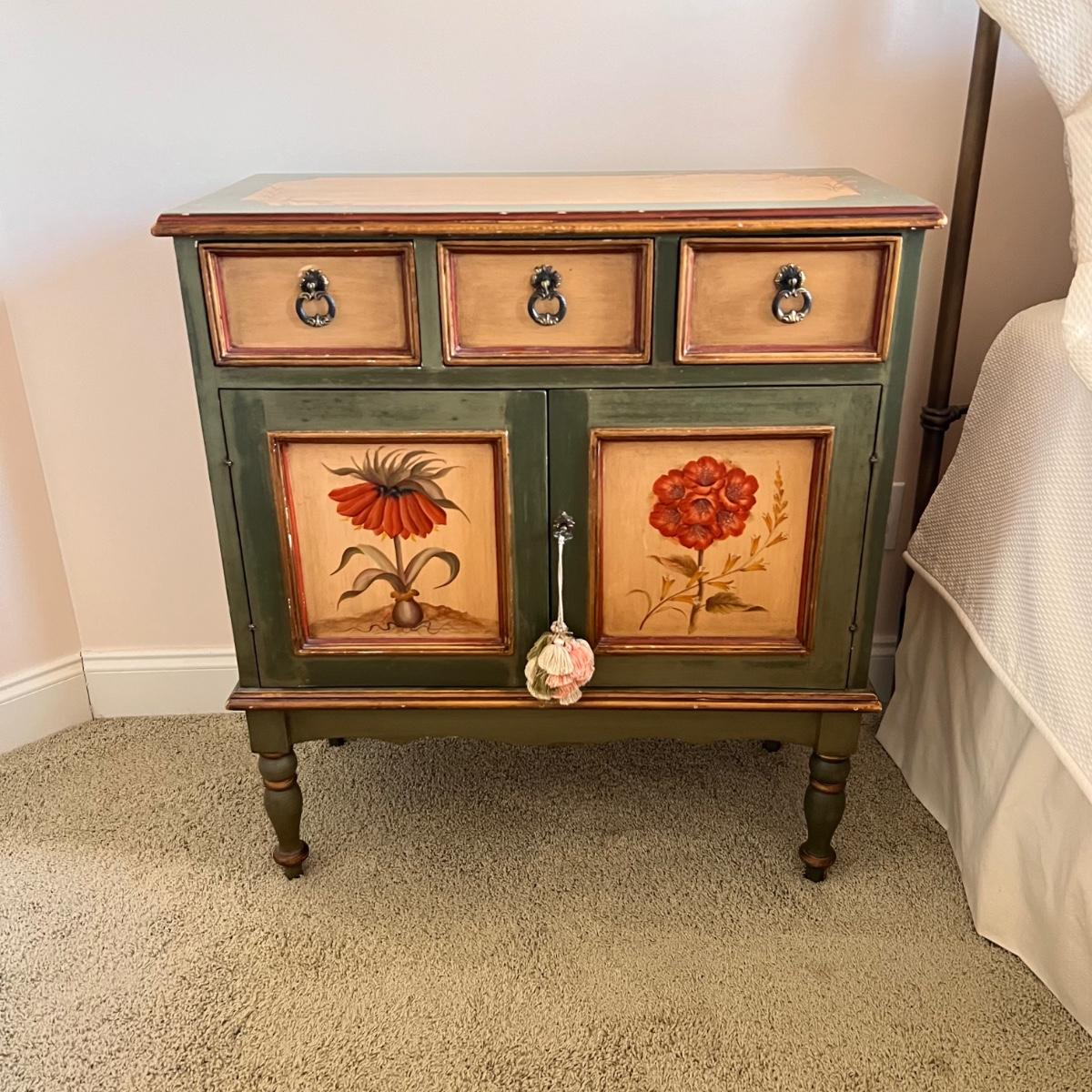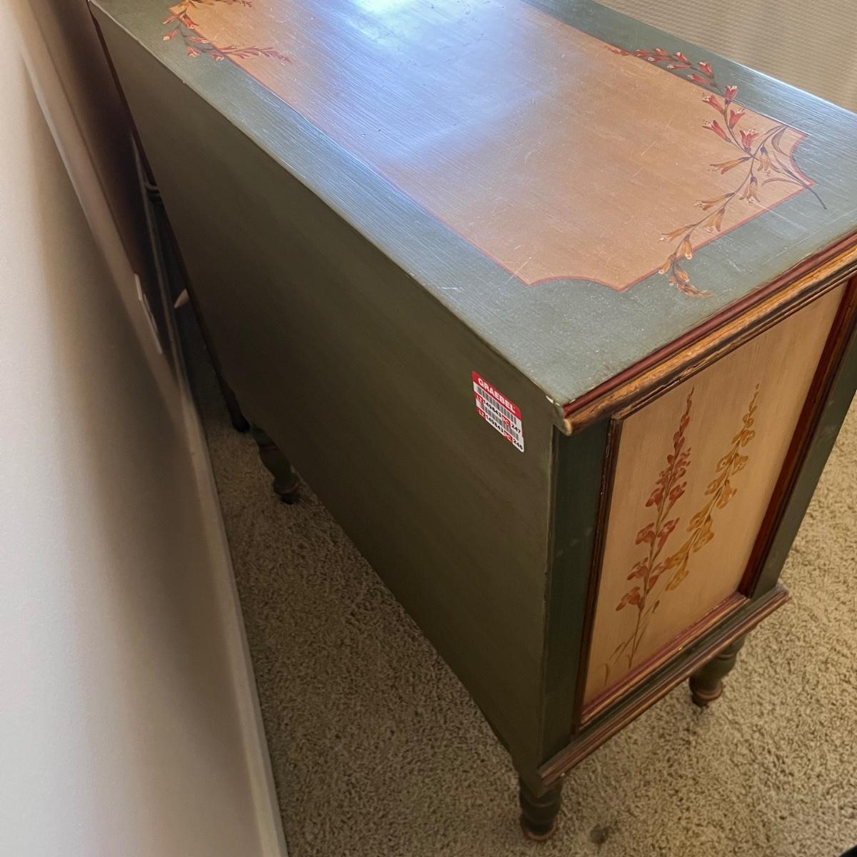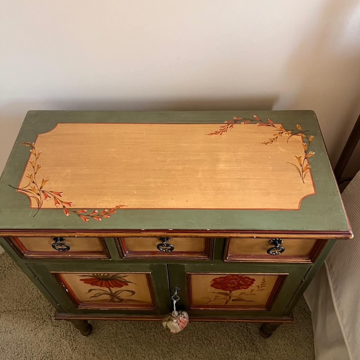 This pretty cabinet appears to be hand painted. It comes with key that is hung off a cute fabric pompom. It has three drawers with a one shelf cabinet below. Hardware is an aged brass colored metal. The front right leg is loose; it can be glued into place but note there is a split in the wood above the leg, see pic.