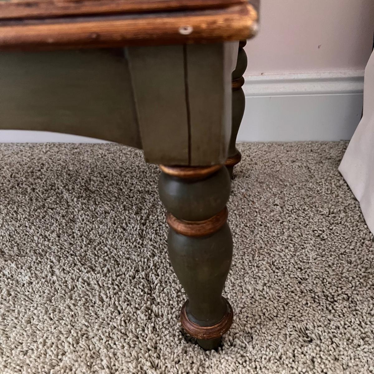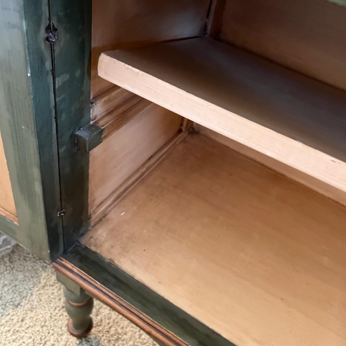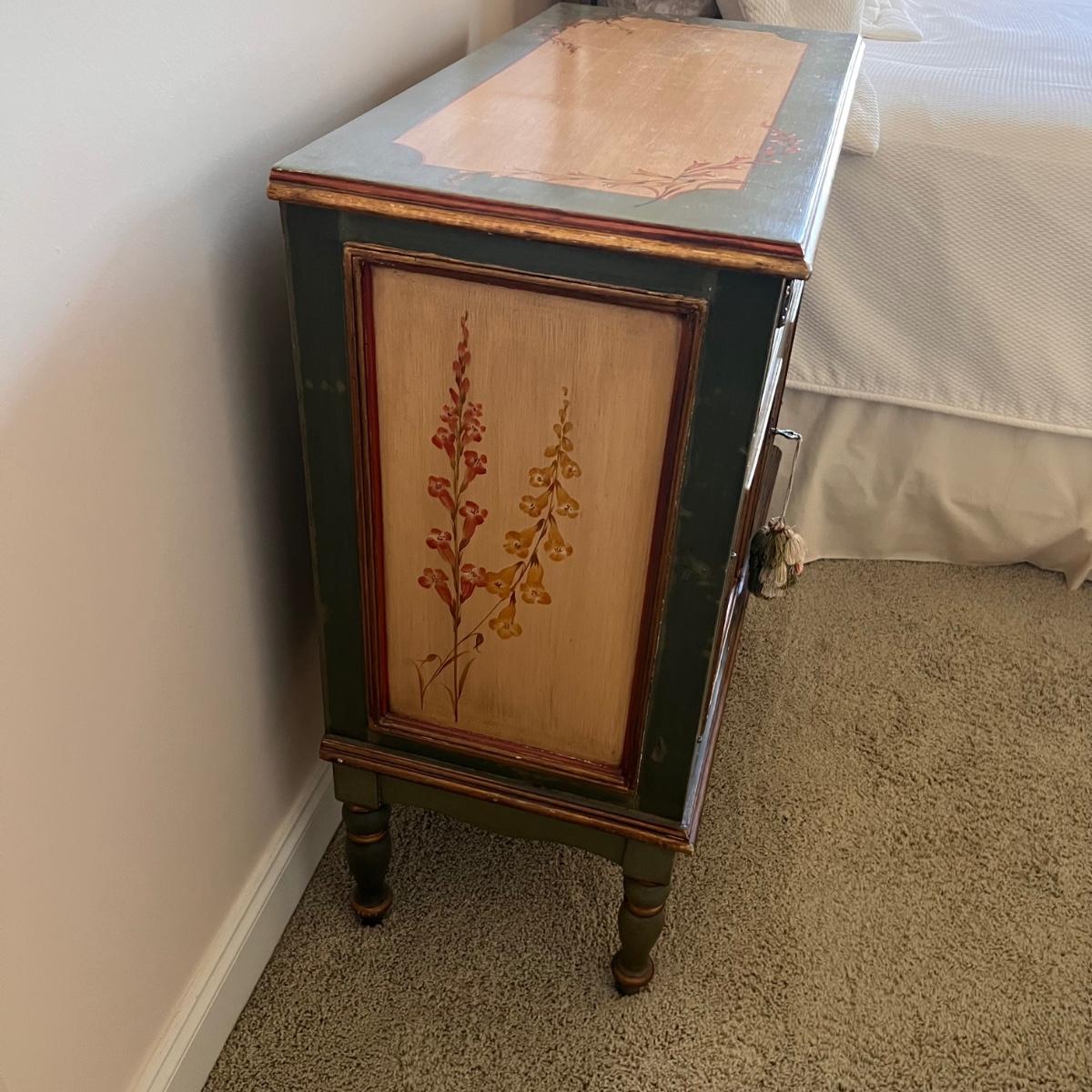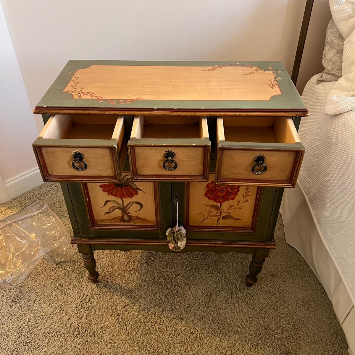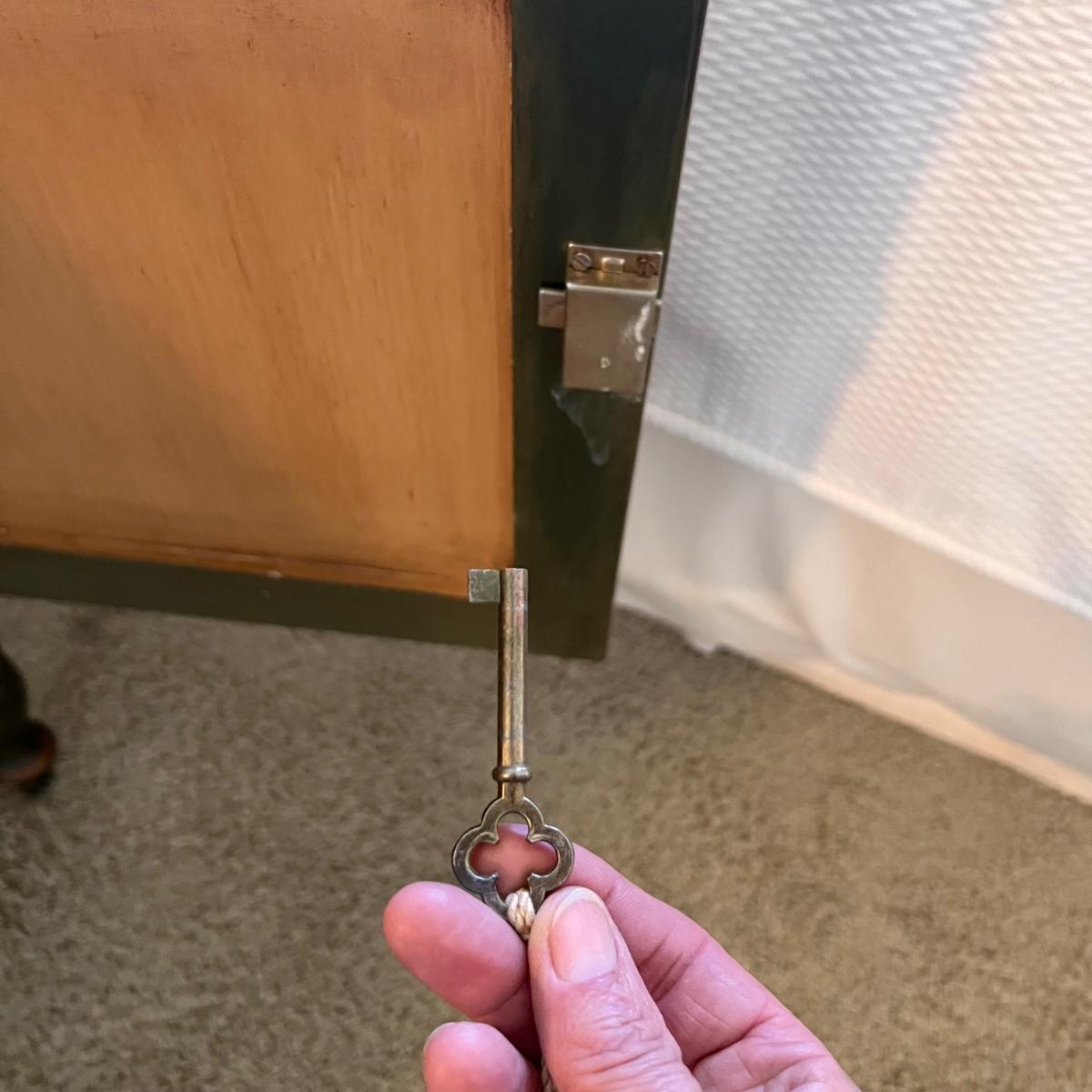 This pretty cabinet appears to be hand painted. It comes with key that is hung off a cute fabric pompom. It has three drawers with a one shelf cabinet below. Hardware is an aged brass colored metal. The front right leg is loose; it can be glued into place but note there is a split in the wood above the leg, see pic.