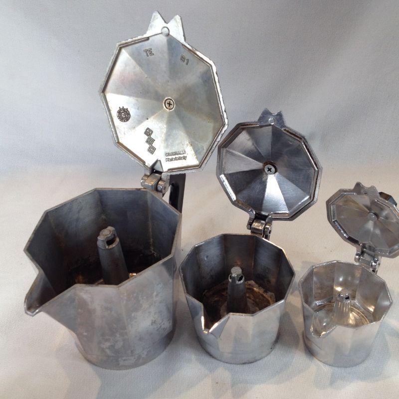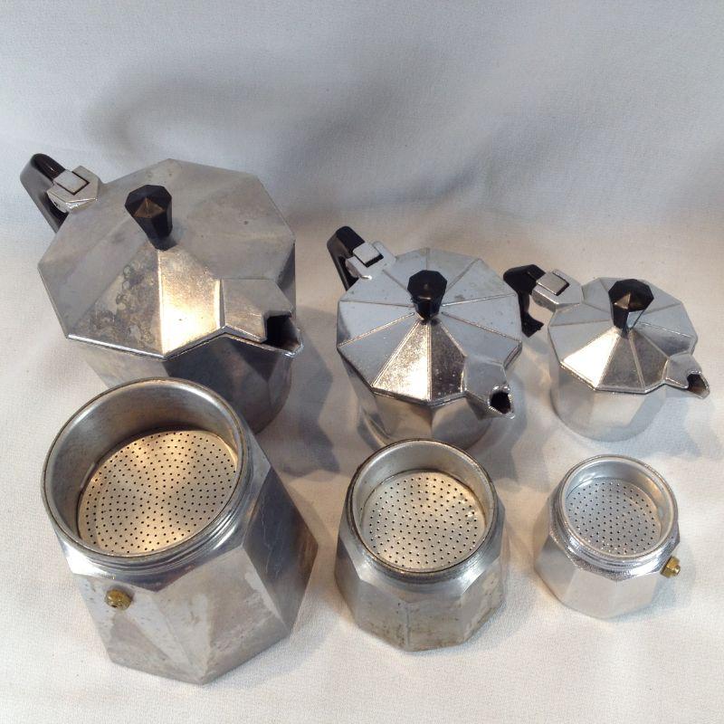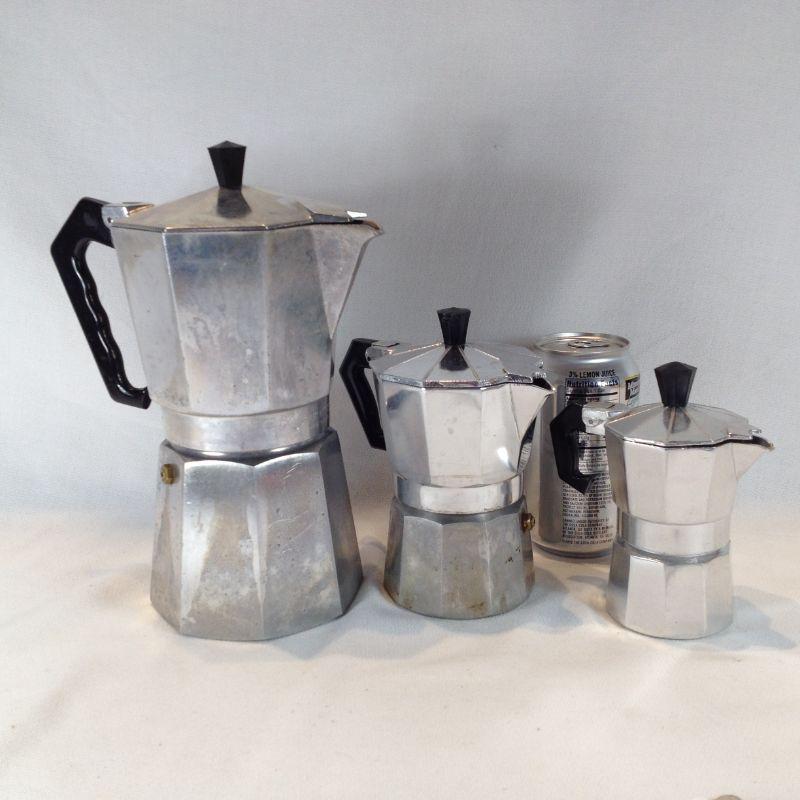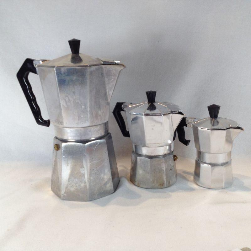 This is a grouping of 3 sizes of Stove-Top Espresso Makers - made in Italy. They are non-electric, made to work on a hot plate. Folks who know say they make the best "cuban-style" coffee. They are marked Cubana and one says Junior Express. All are complete with metal filters and are in very good condition.