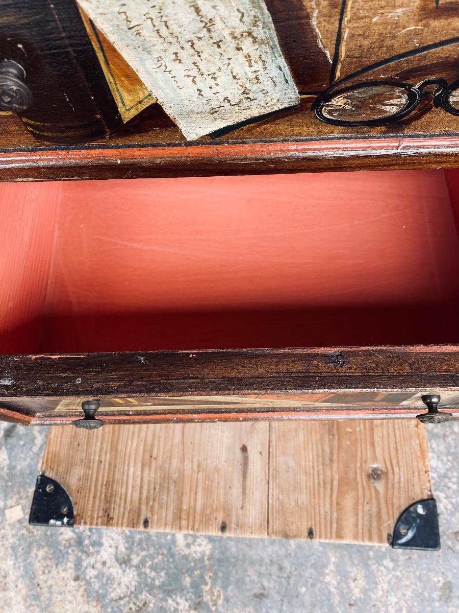 Italian Small 2-Drawer Trompe L'oeil Chest, has 2 drawers . On the smaller size. 18Hx 11x 17.5W. some slight wear on top.