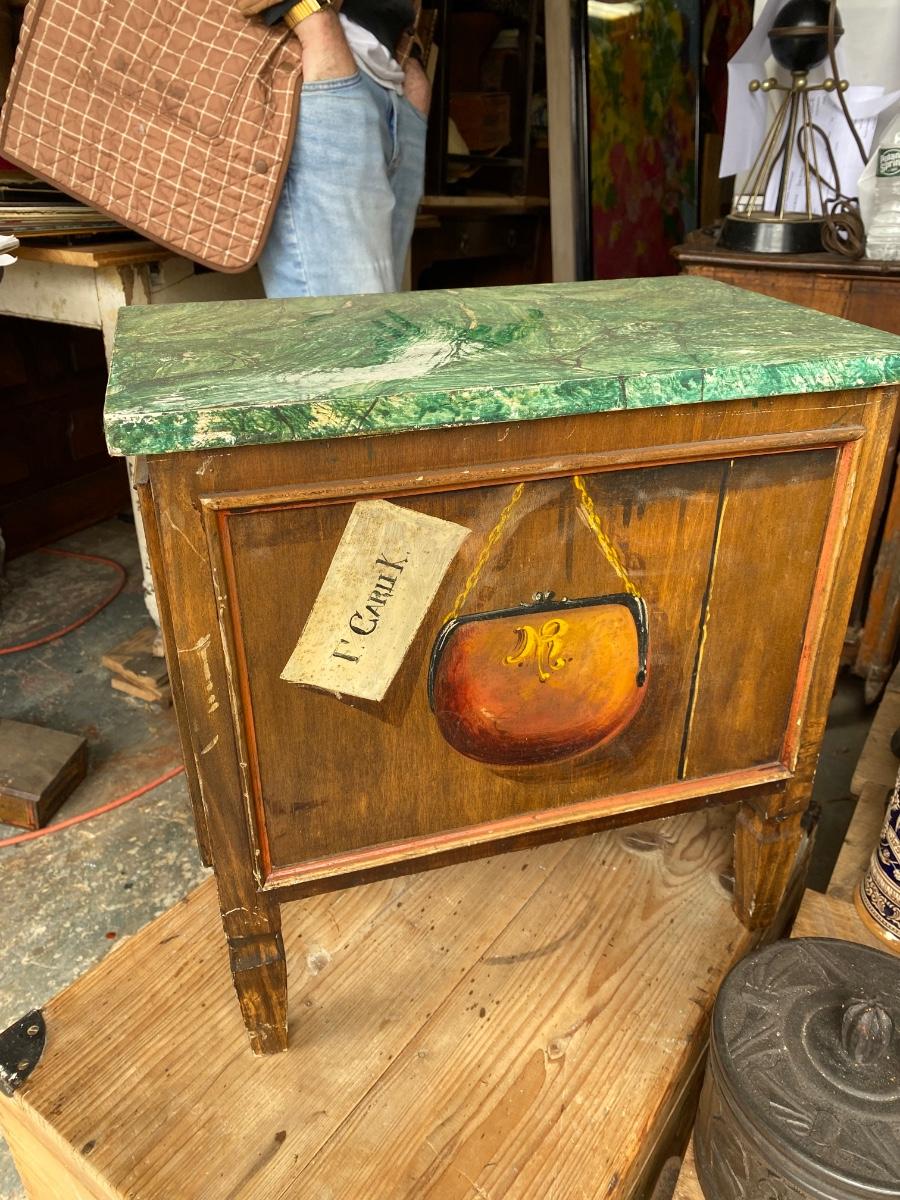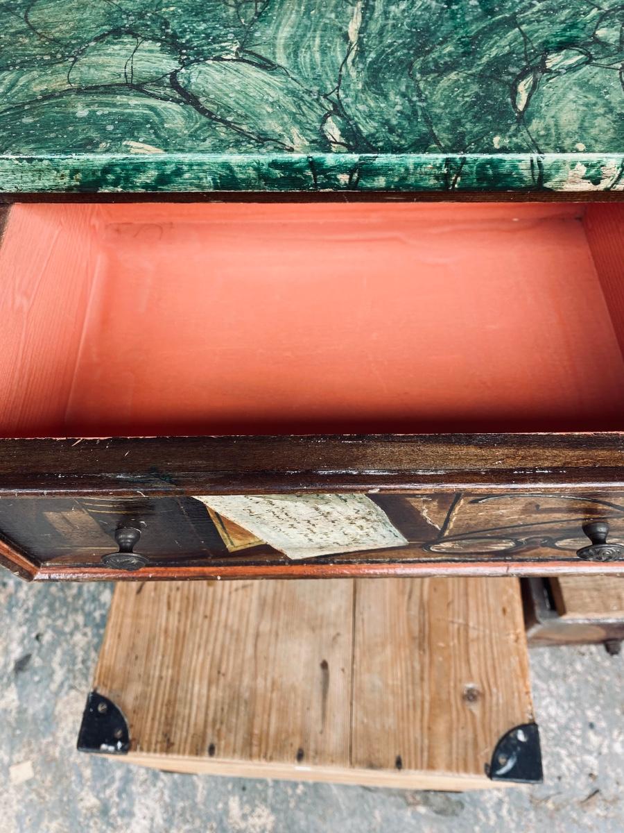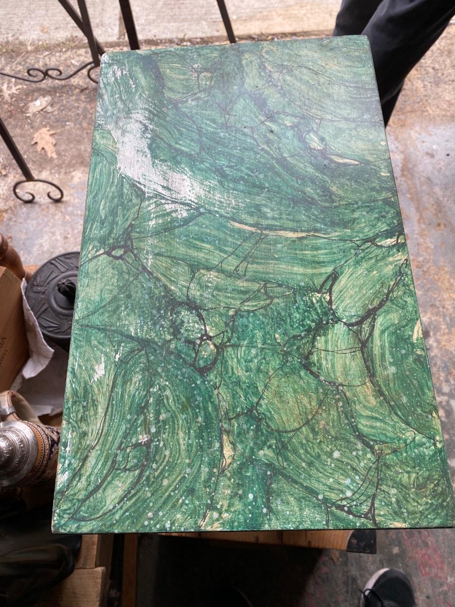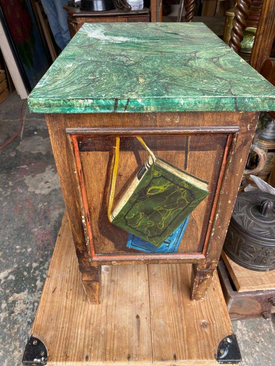 Top is painted to look like green marble. Sides are painted to look like open shelves full of interesting objects!
