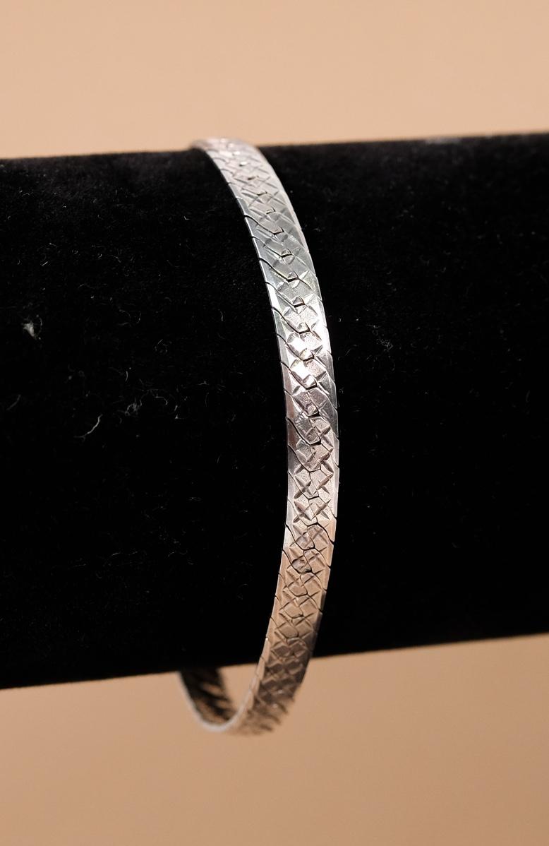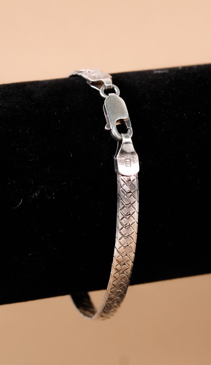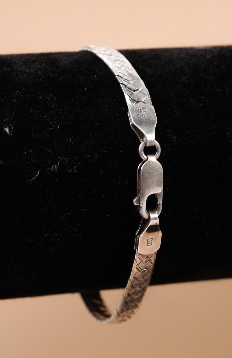 Italian sterling herringbone bracelet with double x engravings. Stamped ITALY 925 with "M" hallmark. Measures approx. 7" length with a 4.78 mm width. Weighs approx. 7 grams.