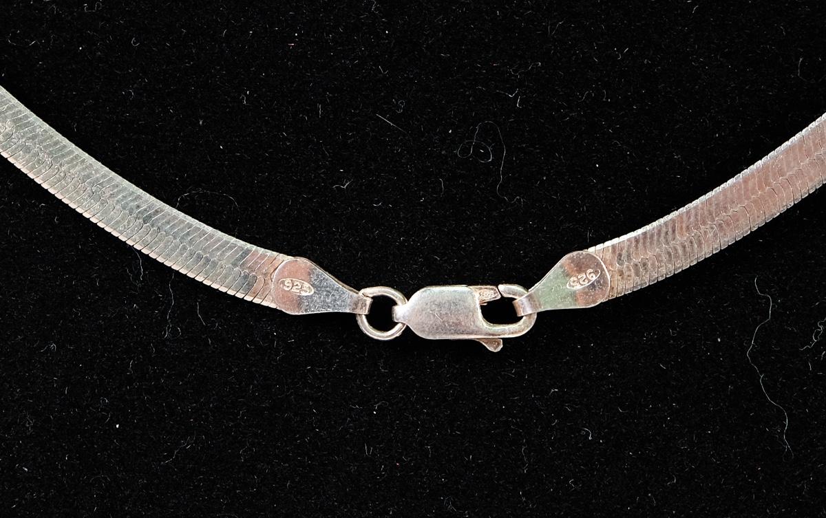 Italian sterling herringbone chain necklace. Stamped 925 MADE IN ITALY. Measures approx. 16.25" with a 4.78 mm width. Weighs approx. 9.3grams.