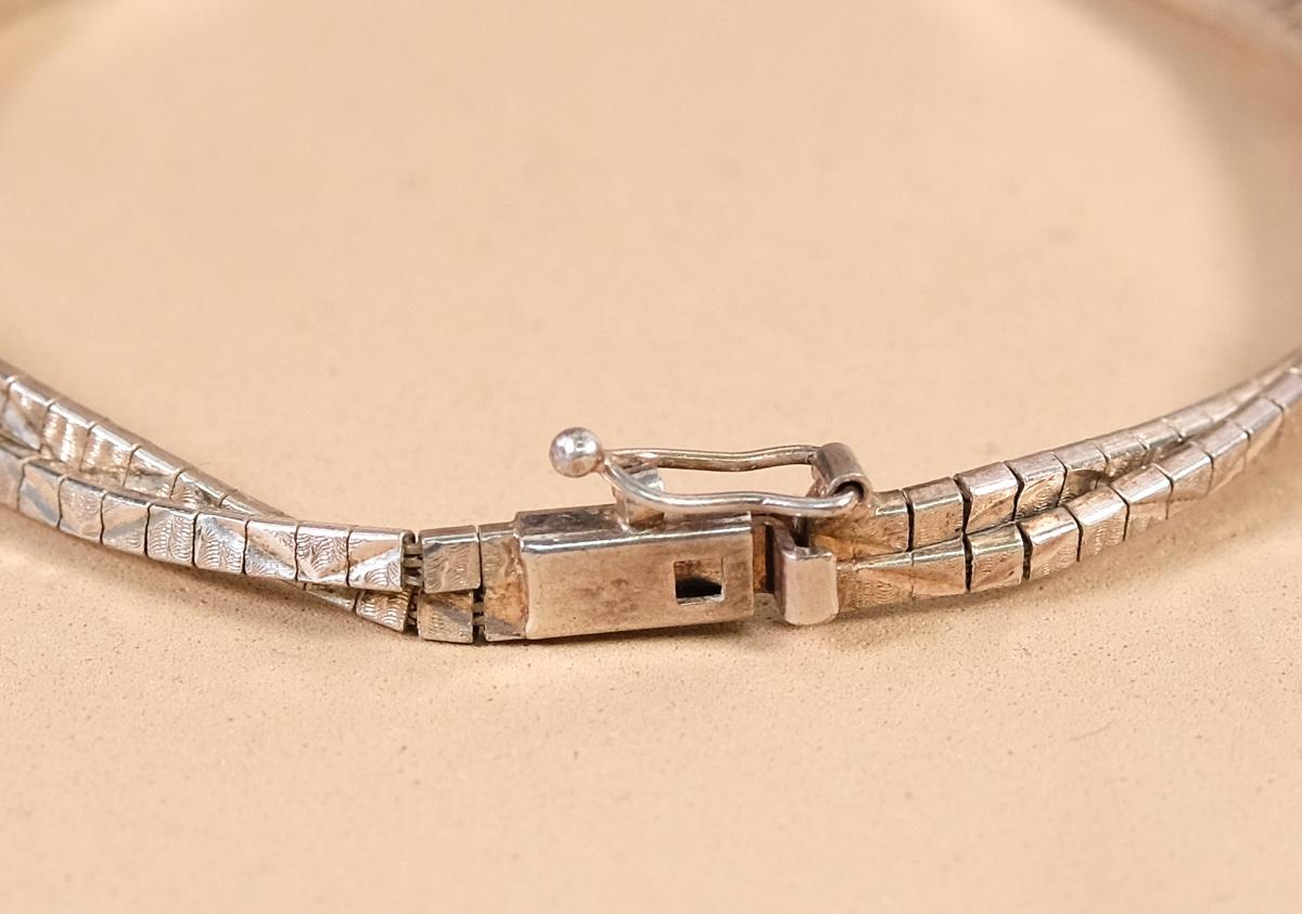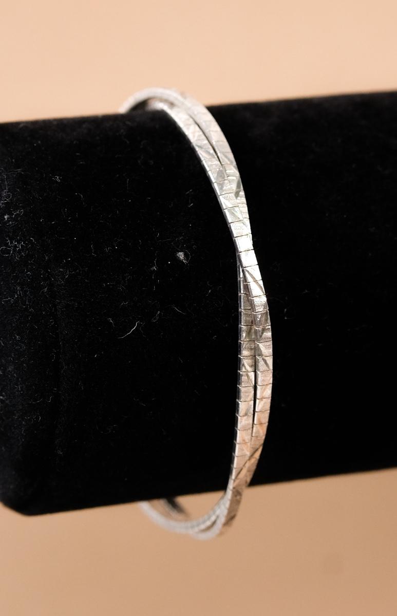 Italian sterling intertwined bracelet with box clasp and safety latch. Stamped ITALY 925 on clasp. Measures approx. 7". Weighs approx. 10 grams.