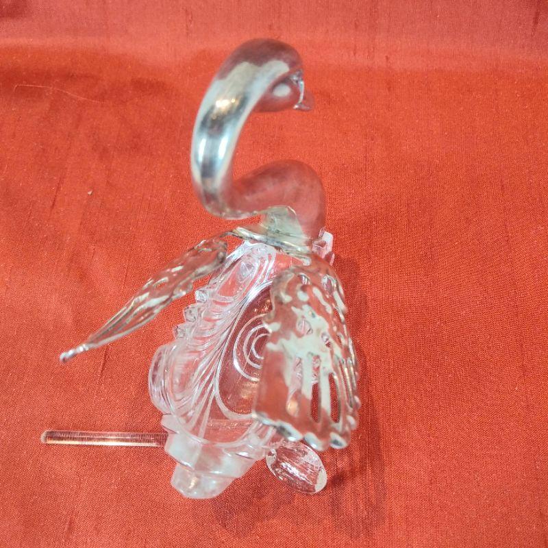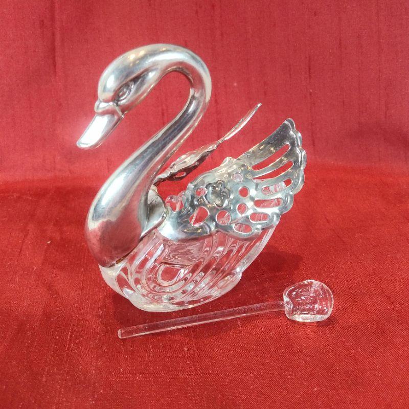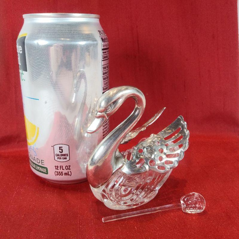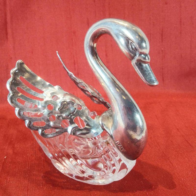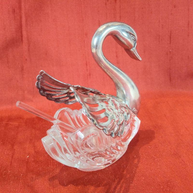 This auction lot is for a beautiful Italian Swan Salt Cellar and Spoon. The swan has silver plated head, neck and wings on a glass body. Wings open slightly for filling. The spoon is glass. The swan is marked Italy. Perfect gift for a salt cellar collector or to keep just for your won amusement and use.