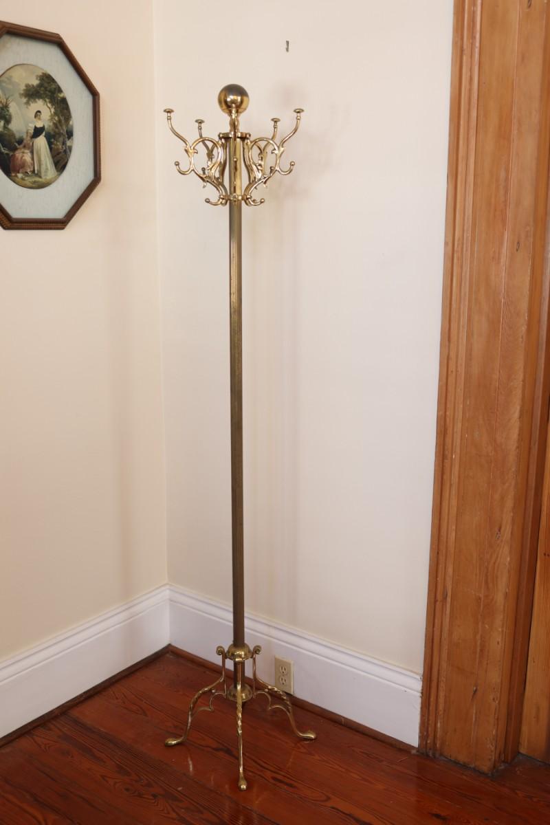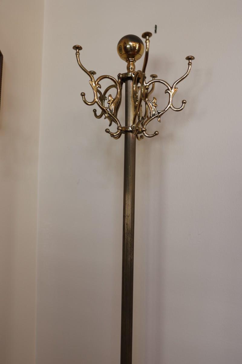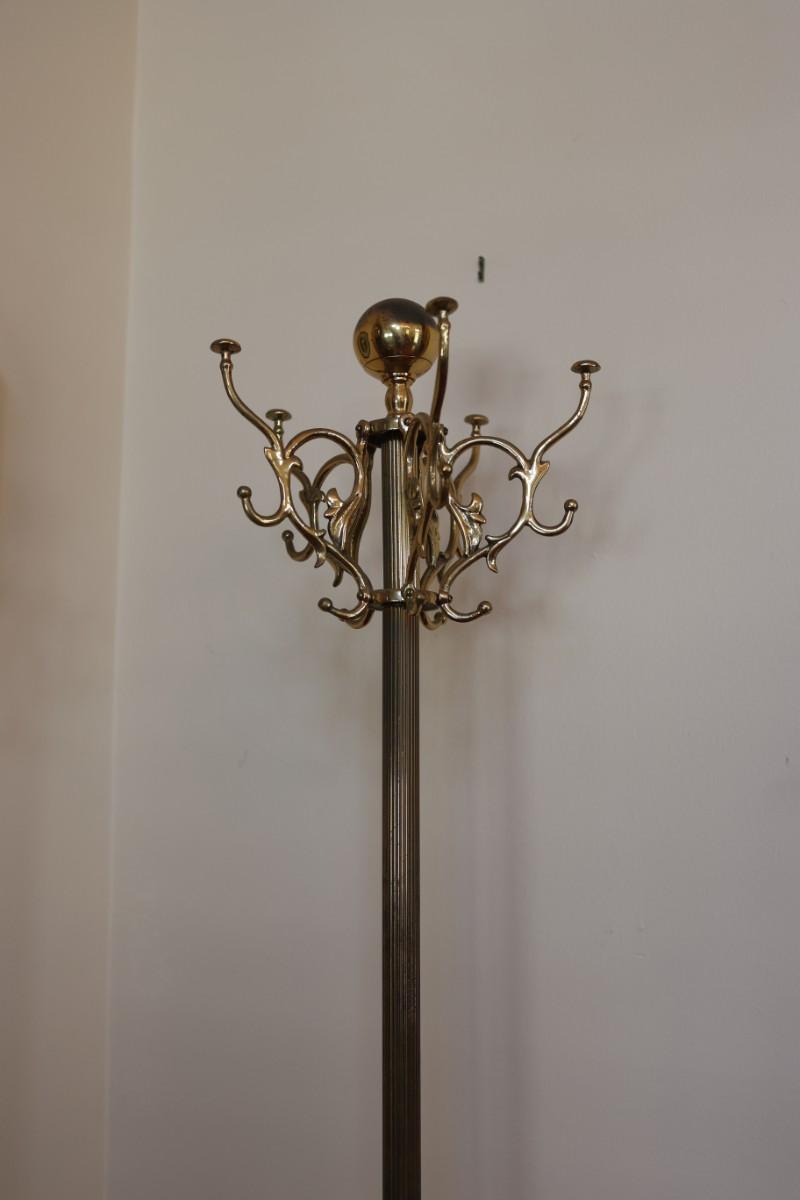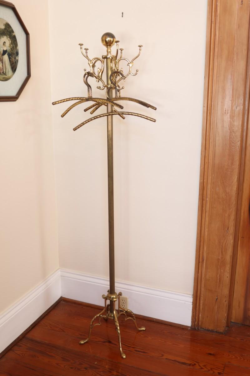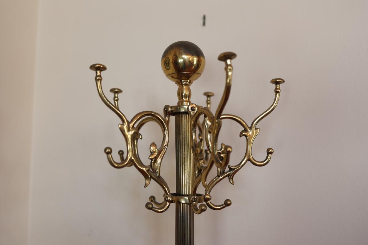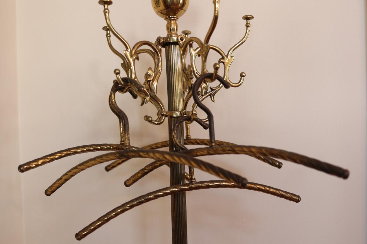 This brass coat rack features an ornate crown with five sets of double hooks, each topped with a small knob for hats. The central ribbed stalk leads to four splayed legs with scrolled, twisted detailing. Comes with 5 brass hangers.
