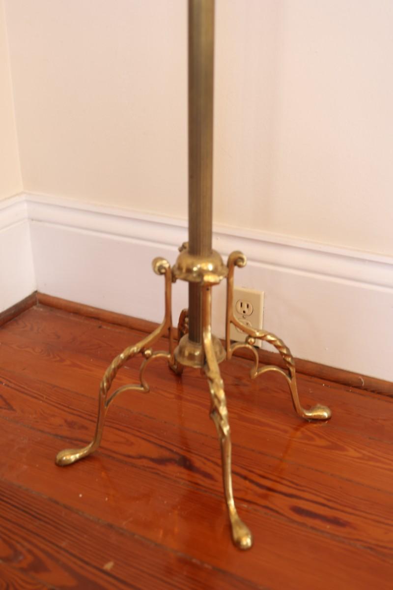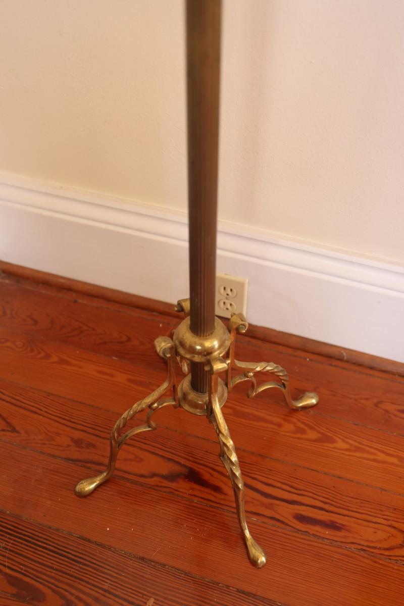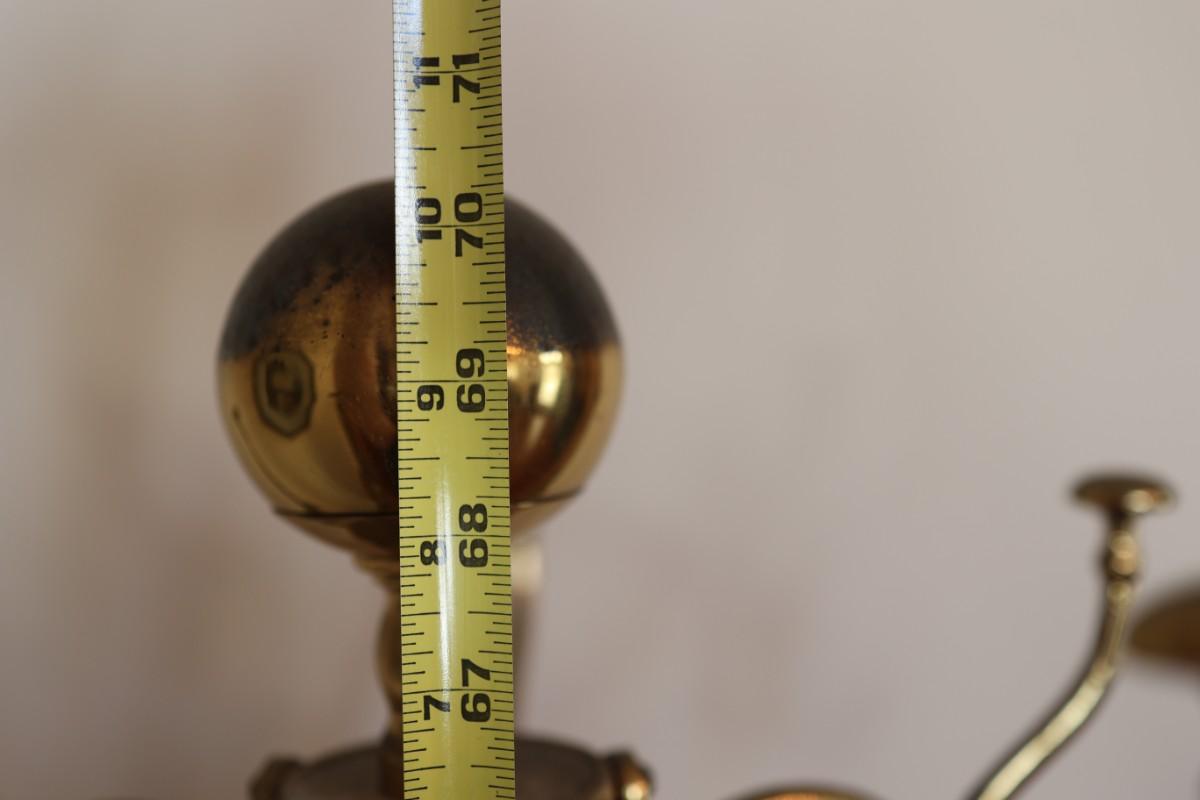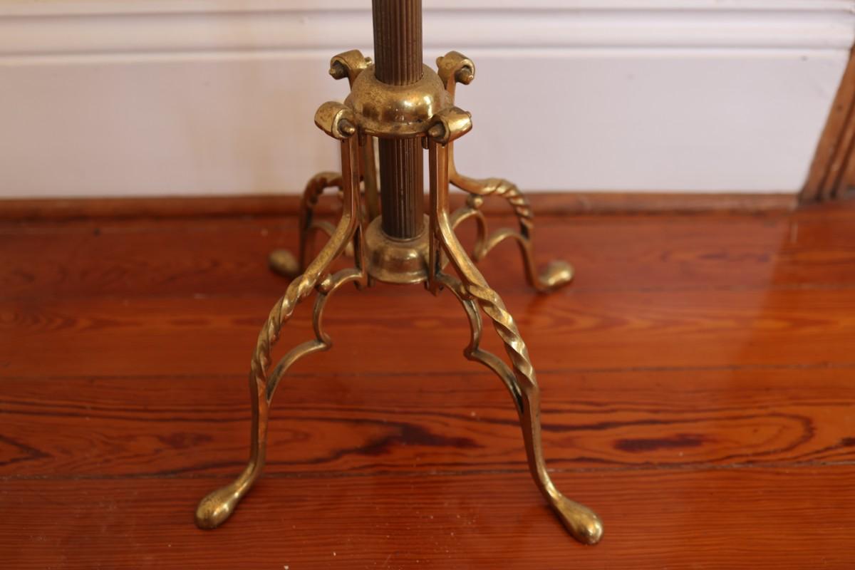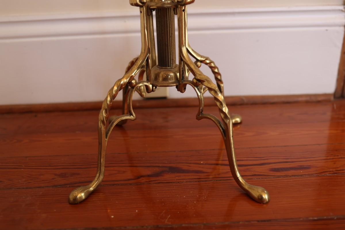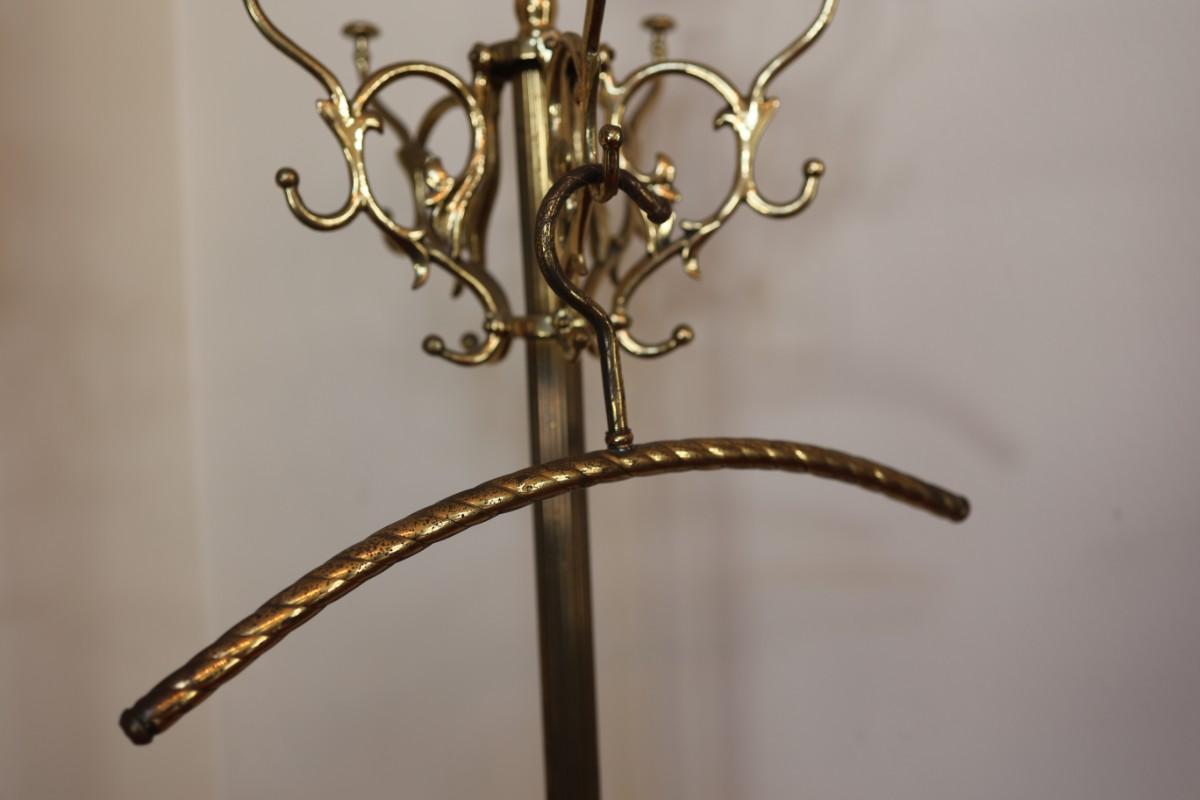 This brass coat rack features an ornate crown with five sets of double hooks, each topped with a small knob for hats. The central ribbed stalk leads to four splayed legs with scrolled, twisted detailing. Comes with 5 brass hangers.