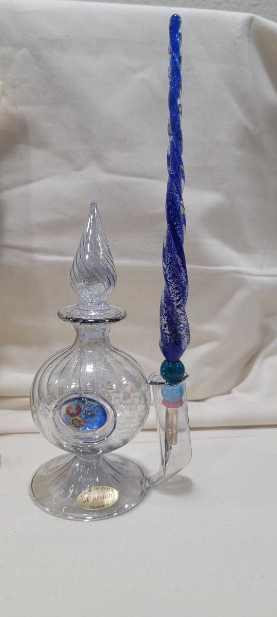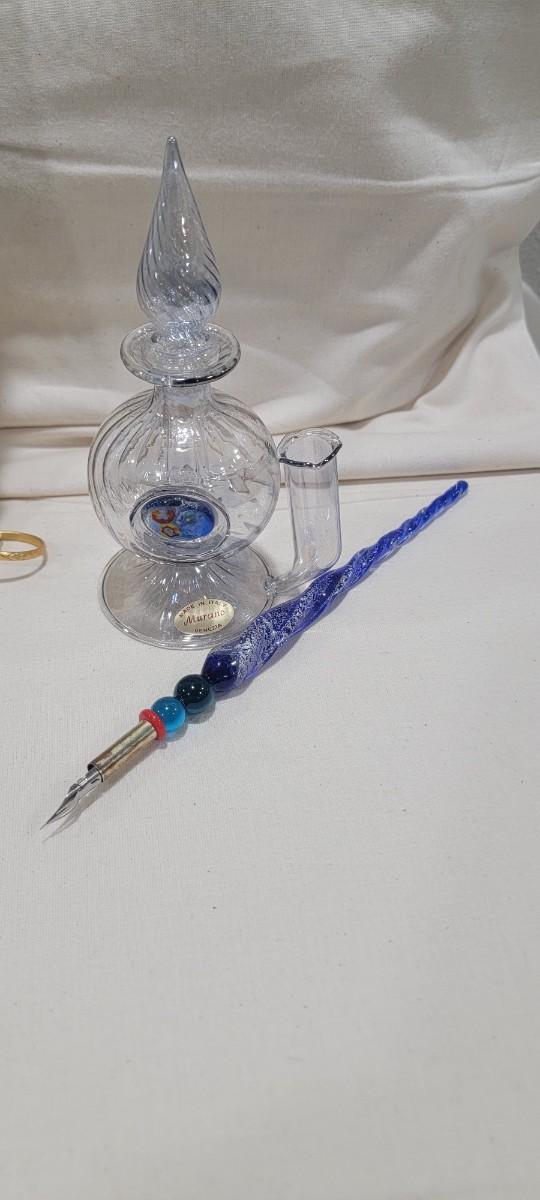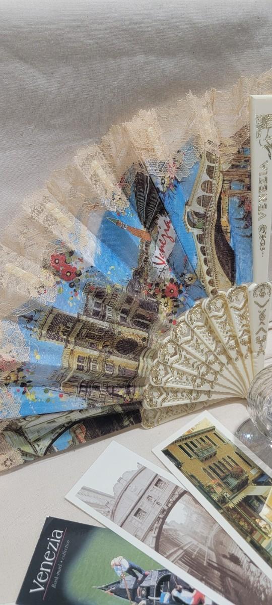 A taste of Venuce! A Murano ink well, decorative hand fan, and bookmarks.
