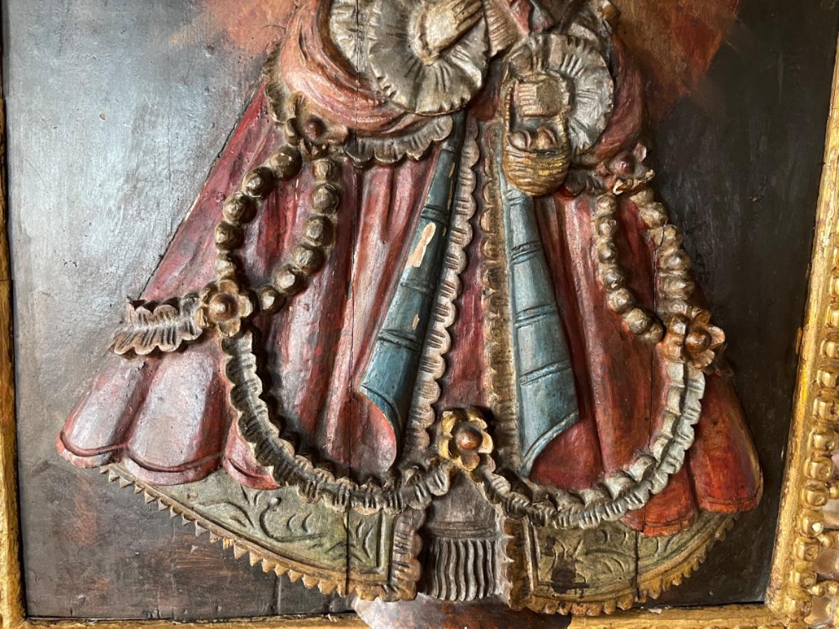 Item 1. RARE Tabladilla Virgin of Guápulo, painted carved relief in wood, Madonna and child. Circa 1700.