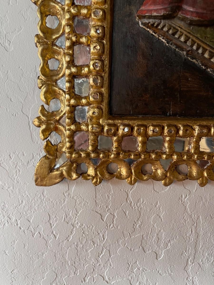 RARE Tabladilla Virgin of Guápulo, painted carved relief in wood, Madonna and child. Circa 1700. She has an ochre sunburst behind her head and is dressed in red robe over a white gown. She holds the child dressed in blue, they are on a dark background. She is adorned with a crown and floral sashes down her robes. Country of origin is Peru, styled in the Cuzco school. Panel is mounted in and antique gilded and carved wood frame with embedded mirrored insets. Overall size is 29”H x 24”L, frame is 4” W all around, panel is 21 1/2”H x 16 1/2”L.