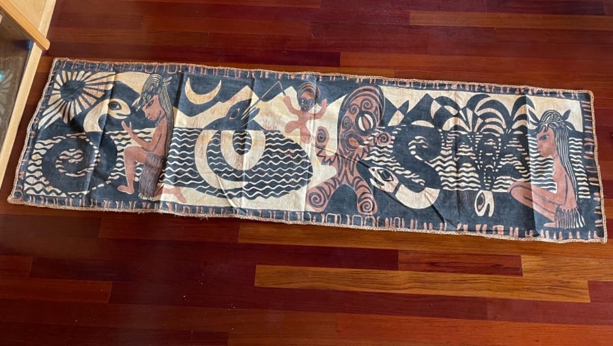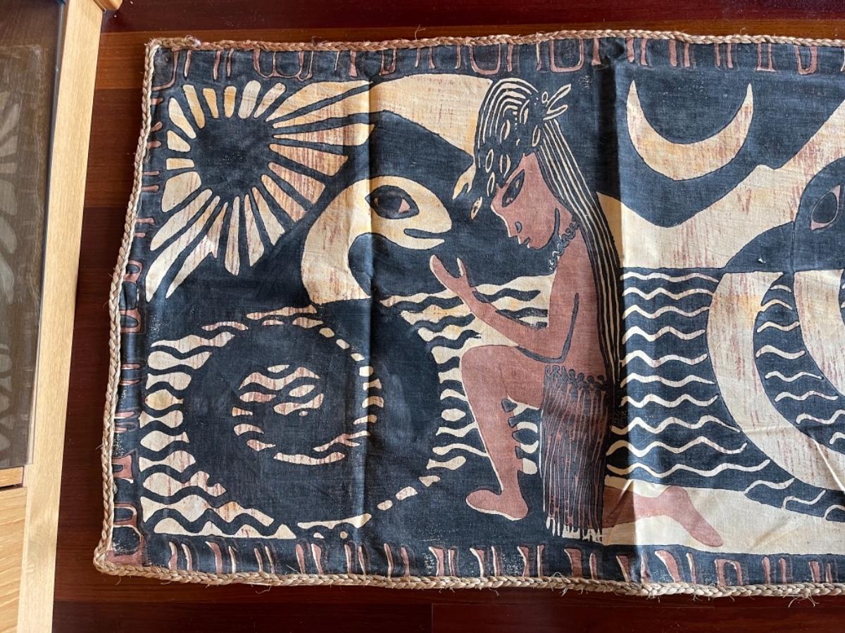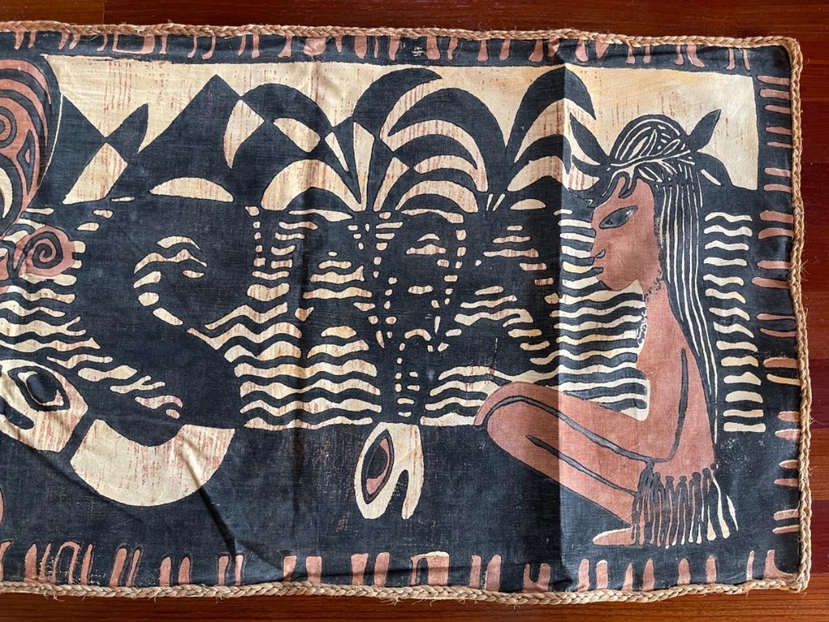 Thai Batik, 1950’s, handmade, cotton and braided jute border. Brown, cream, black colors. Decorated with figures , plants, snakes, fish and water scene with a border of braided jute edging. Size 26”W x 92”L