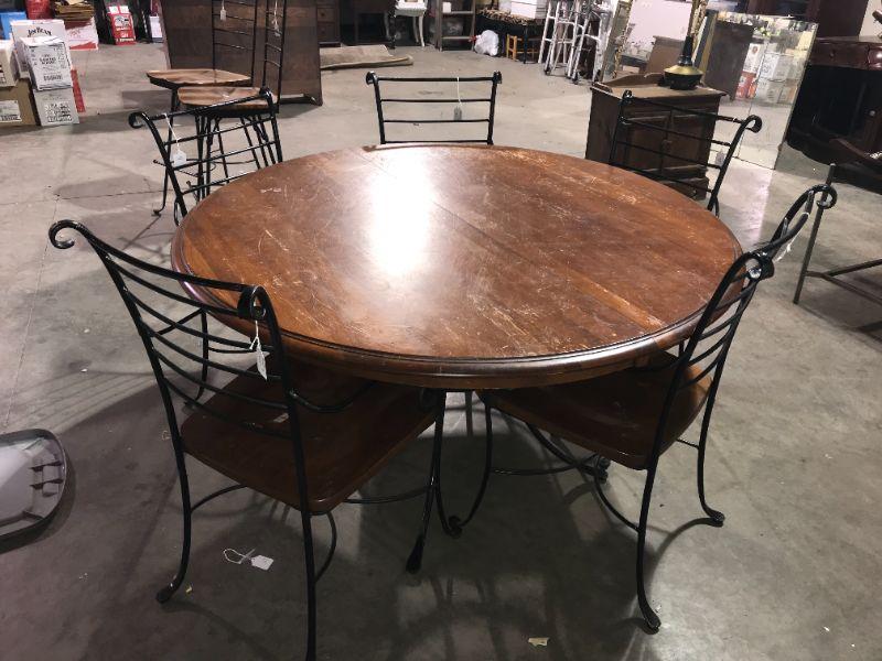 Kitchen Dining Room Wood Wooden and Wrought Iron Table and 5 Chairs - 54" diameter and 31" Tall - (item #106)
