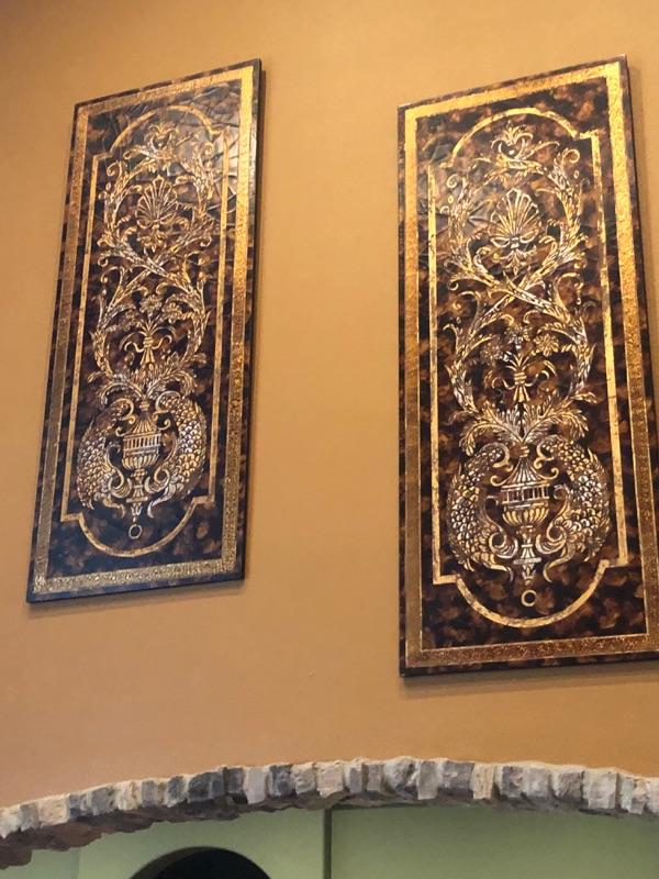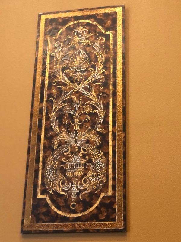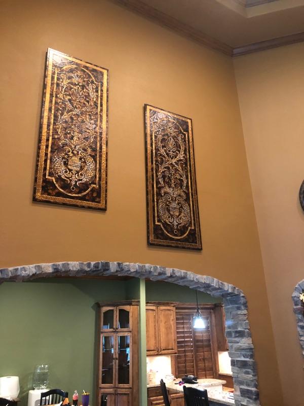 Gold, Brown, Black wall hangings on wood