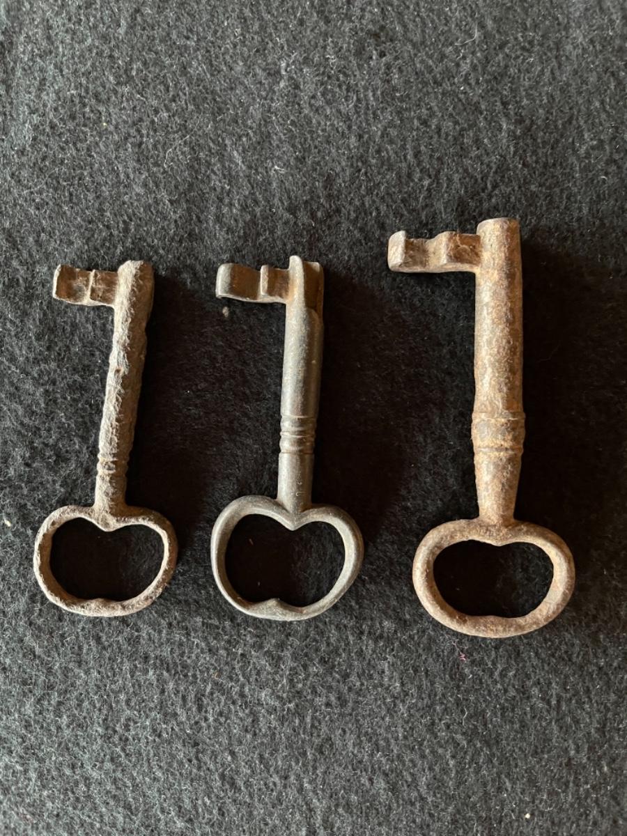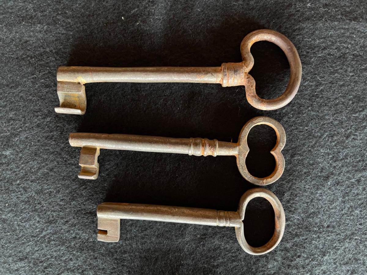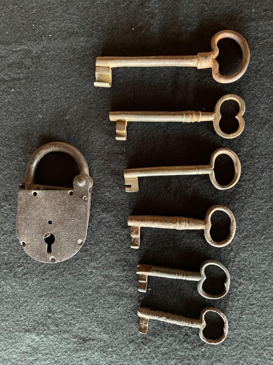 Peruvian keys and lock, Iron, circa 17th-18th century. Six keys made of iron in varying sizes from 3” L to 7”L. One lock made of iron size 6”T x 3 1/2”W.