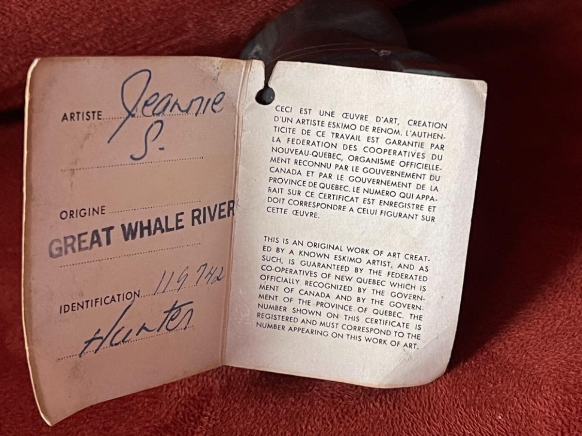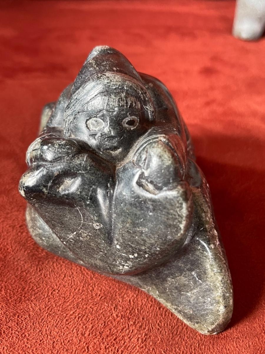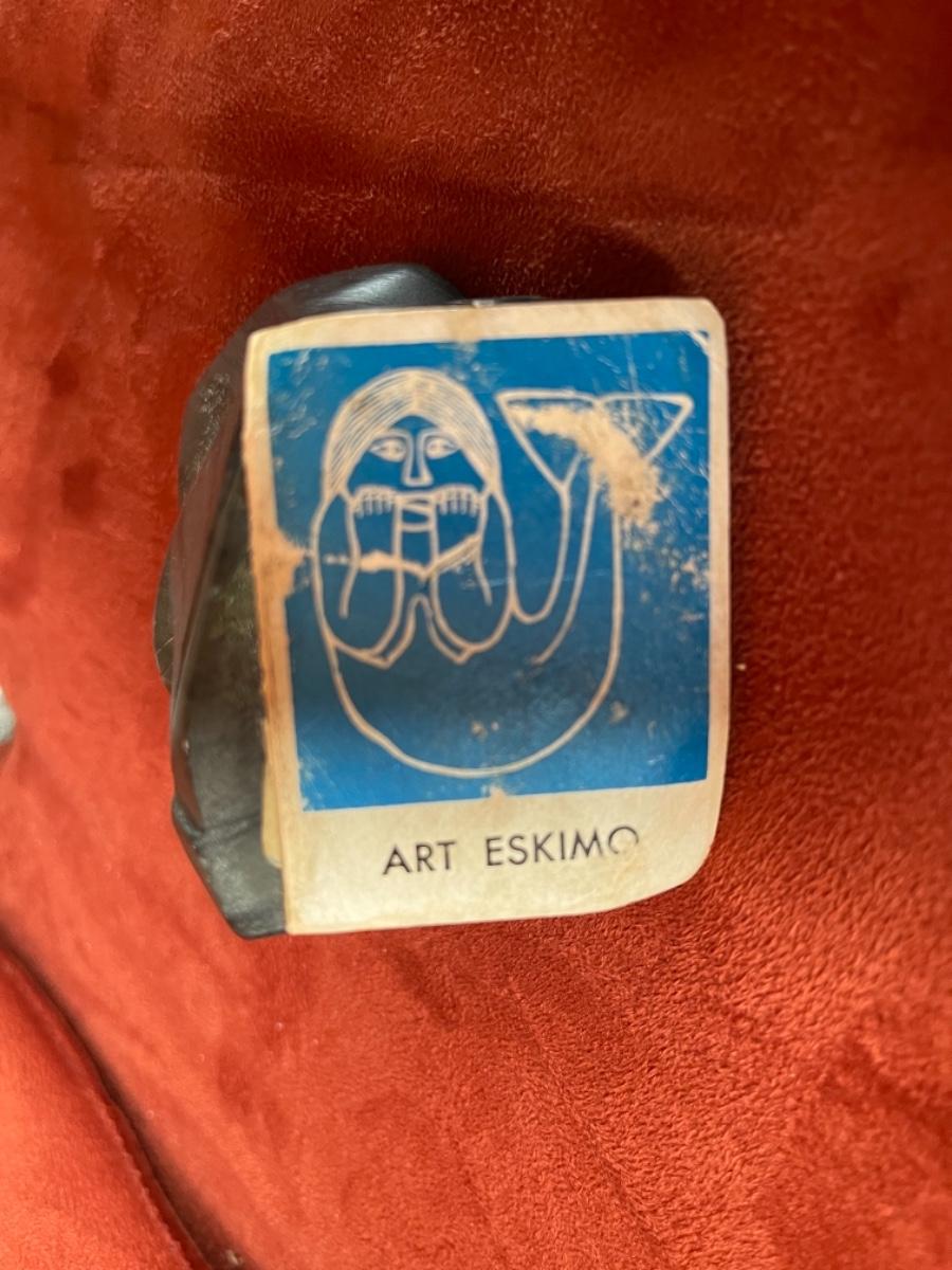 Carved people in black soapstone, Inuit, signed by artists, 1950’s. Three figures in various poses. A) figure crouching behind rock, with hood and mittens, fringe bangs and carved face give this sculpture character. Signed and part of tag is still attached to bottom. Size 3”L. B) Man with jacket and mittens kneeling. Titled “Hunter”, from Great Whale River, Artist name is Jeanie S. Size 3”T. C) Man Standing in jacket with hood, arm raised. No tag, not signed. Size 5”T.