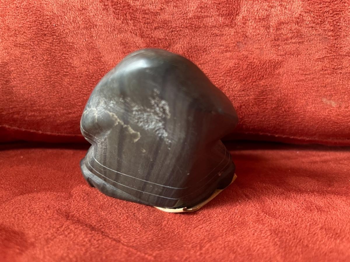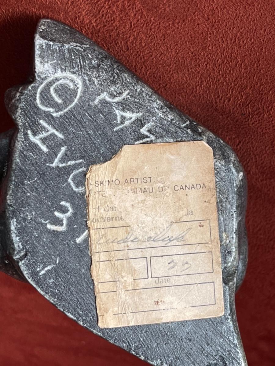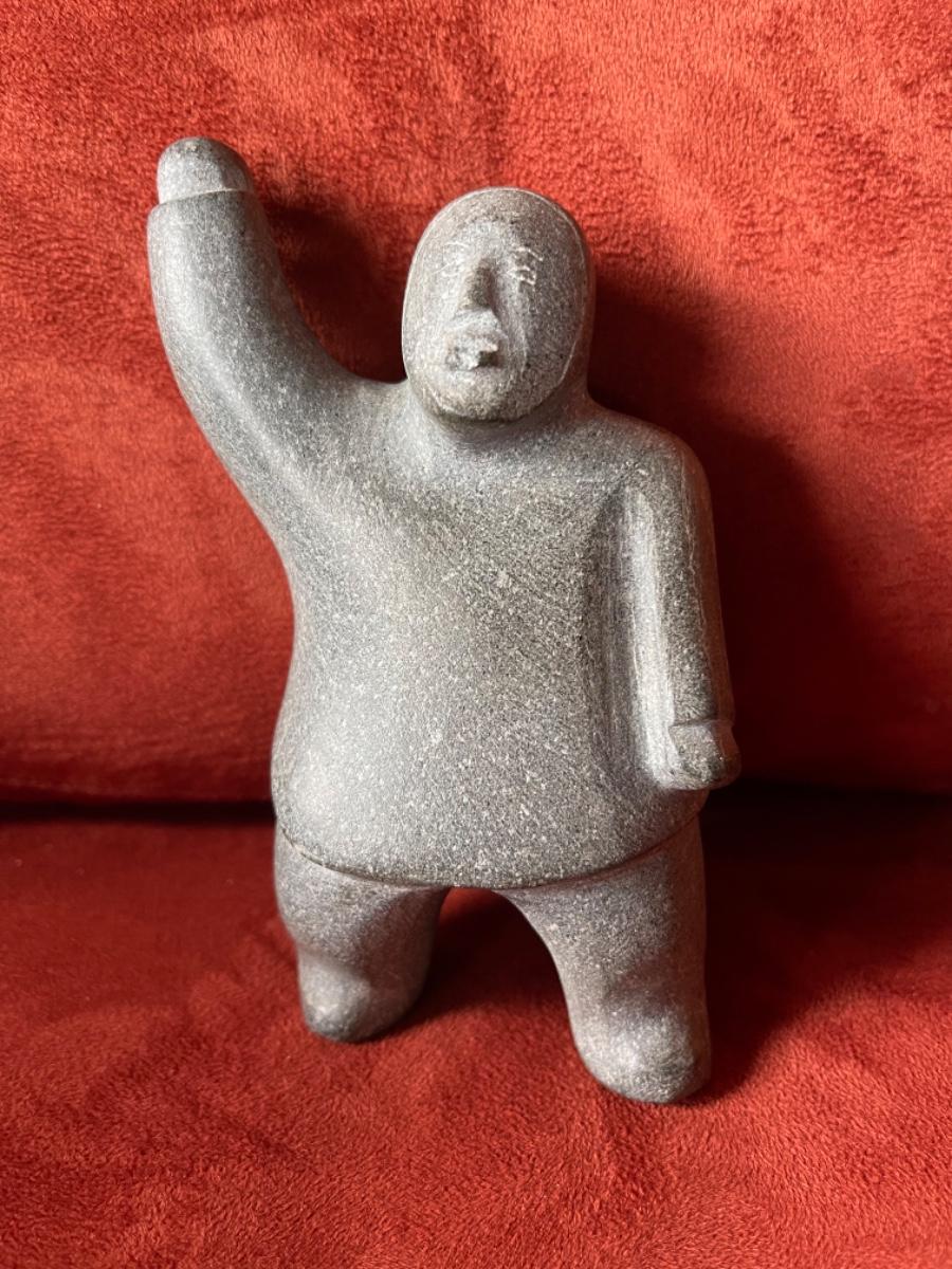 Carved people in black soapstone, Inuit, signed by artists, 1950’s. Three figures in various poses. A) figure crouching behind rock, with hood and mittens, fringe bangs and carved face give this sculpture character. Signed and part of tag is still attached to bottom. Size 3”L. B) Man with jacket and mittens kneeling. Titled “Hunter”, from Great Whale River, Artist name is Jeanie S. Size 3”T. C) Man Standing in jacket with hood, arm raised. No tag, not signed. Size 5”T.