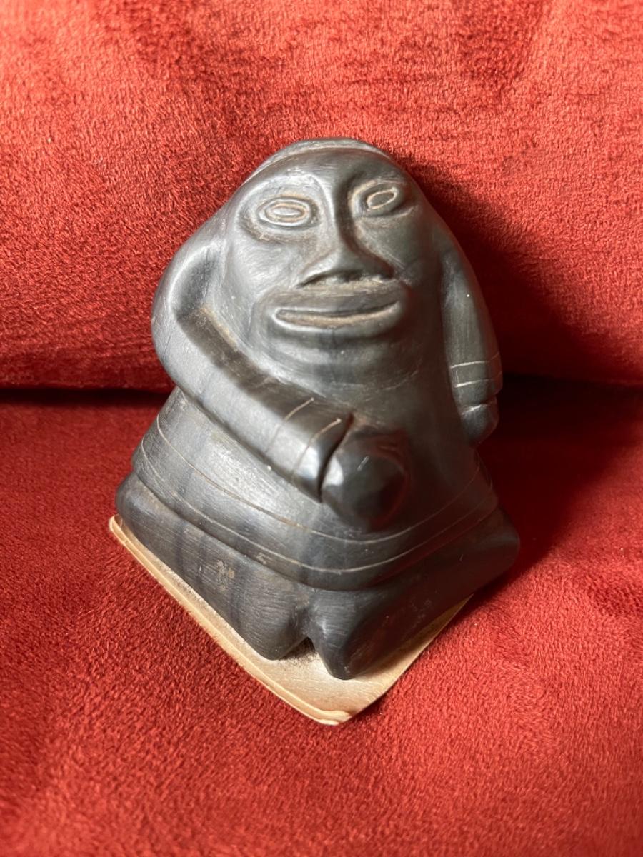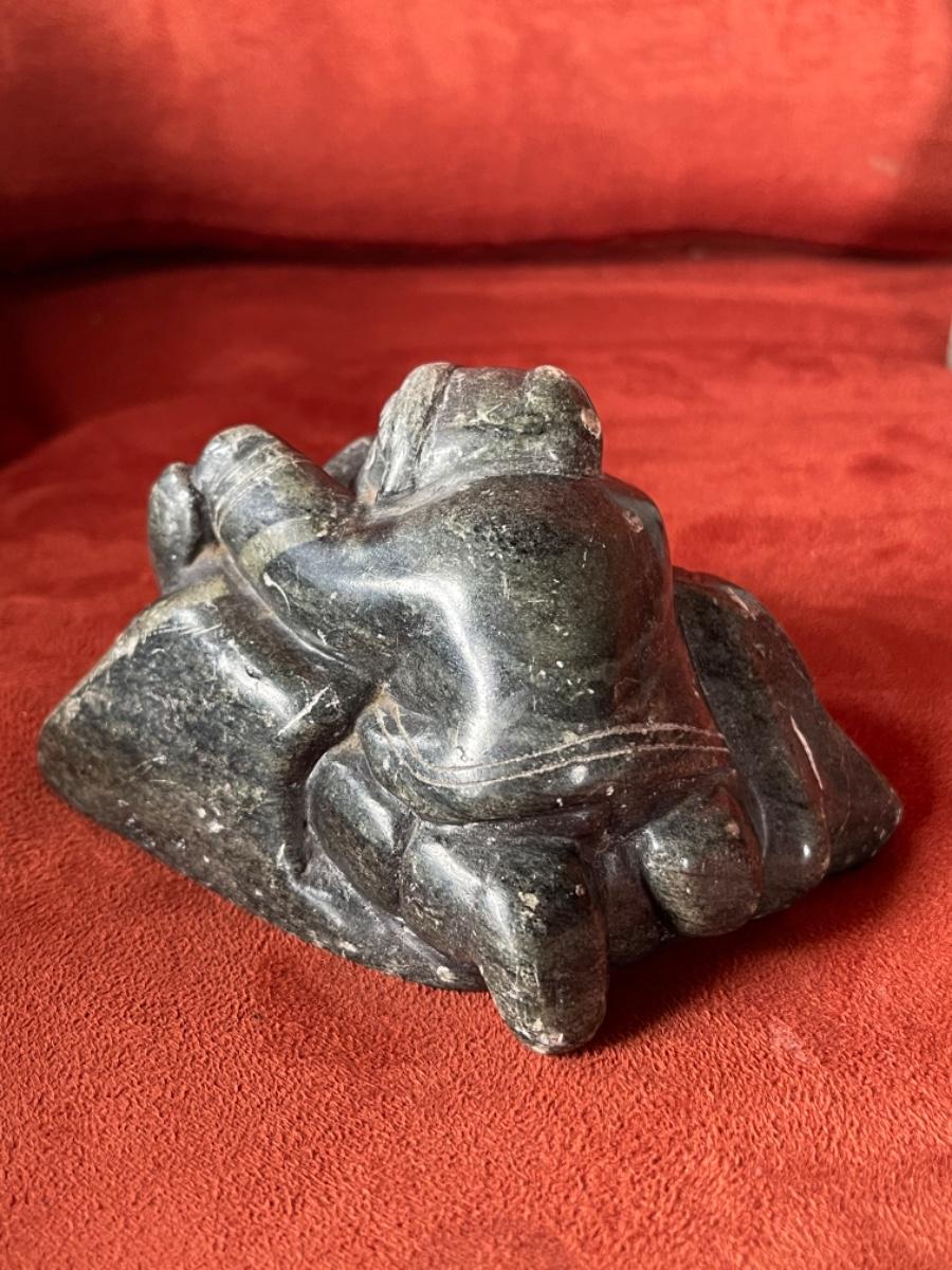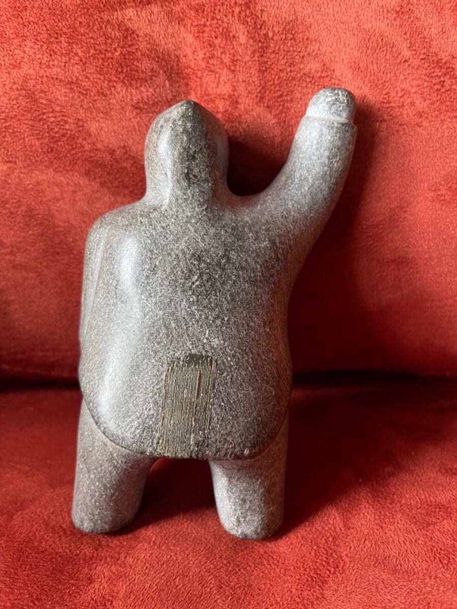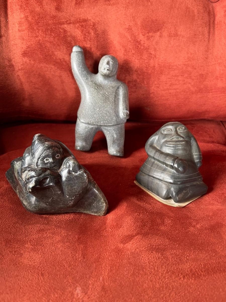 Item 19. Carved people in black soapstone, Inuit, signed by artists, 1950’s. Three figures in various poses.