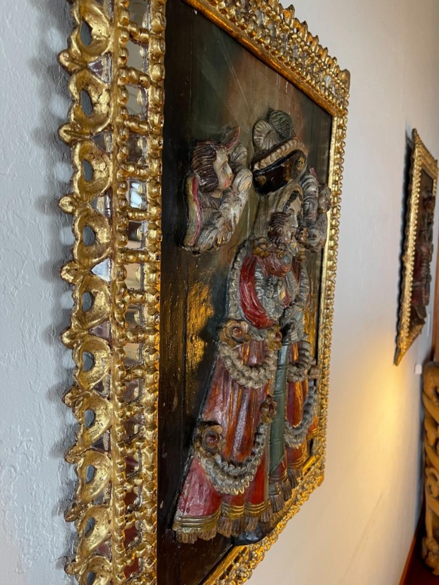 RARE Tabladilla Virgin of Guápulo, with angels, painted carved relief in wood, Madonna and child. Circa 1700. She has a sunburst behind head and angels in clouds guarding from above in each corner. The Virgin is dressed in red robe and holds the child dressed in red robe over white gown, they are set on a dark background. She is adorned with a black crown and 3 feathers. She has floral sashes draping down her robes. Country of origin is Peru, styled in the Cuzco school. Panel is mounted in and antique gilded and carved wood frame with embedded mirrored insets. Overall size is 29”H x 23”L, frame is 4” W all around, panel is 21”H x 16”L. This piece of art is museum quality and can only be found in Peruvian Museum and Churches. They are no longer allowed to be exported. It was gifted to the estate holder in the 1960’s.