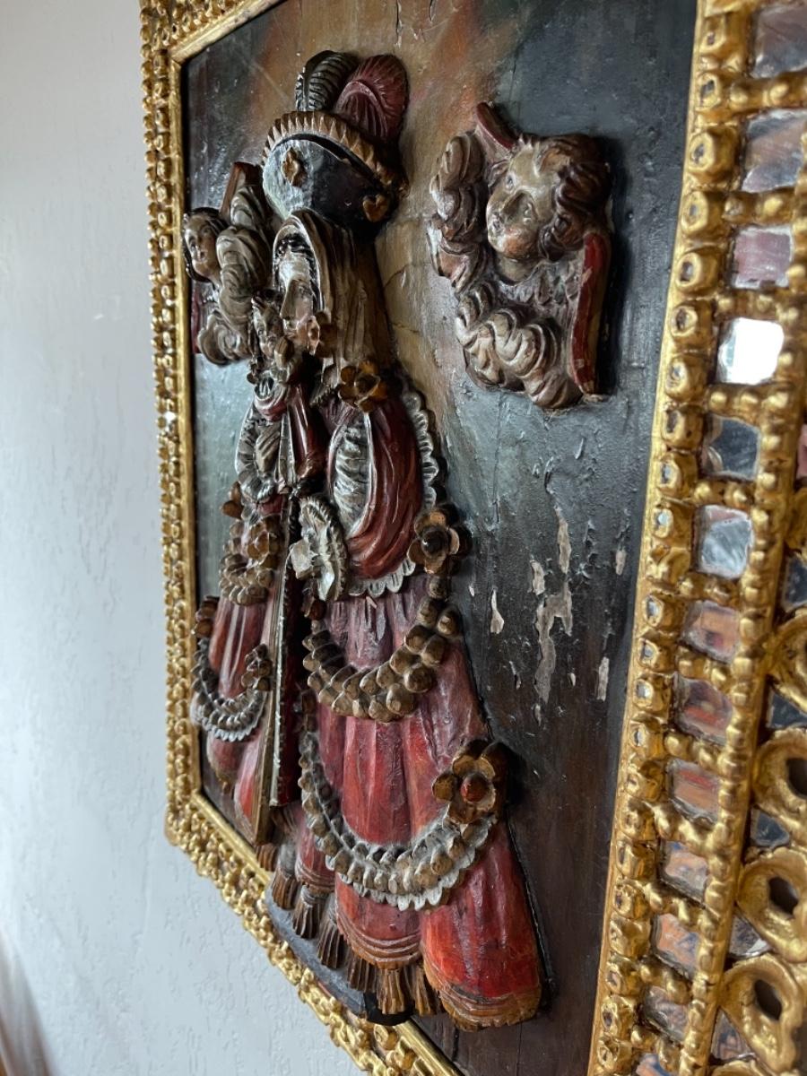 Item 2. RARE Tabladilla  Virgin of Guápulo, with angels, painted carved relief in wood, Madonna and child. Circa 1700.