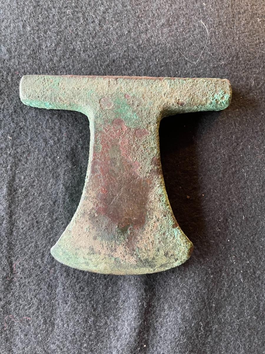 Pre-Colombian Incan tools, iron, copper alloy, Moche (Mochica) period, 200BC - 600BC Early Intermediate period, all with original patina, heavy in weight. A) Chisel, Size 8”L B) Chisel with label dating it 1,500 years old, Size 8”. C) Ax head with label dating it 1,500 years old, Size 5”W x 6”L. D) Solid spherical medallion with hole through top, Size 2” round. E) Spear / Spike, round on top, angular at bottom, Size 20”.