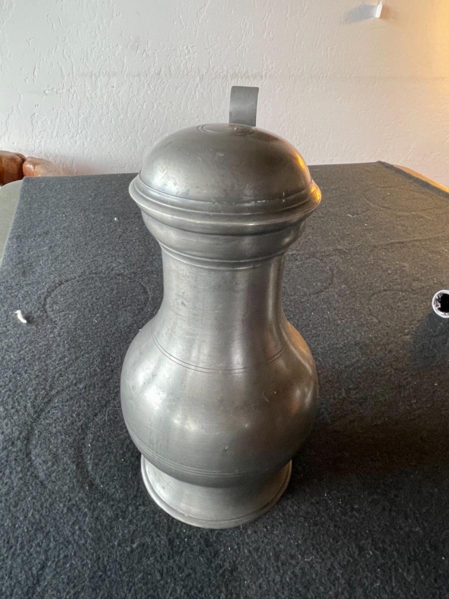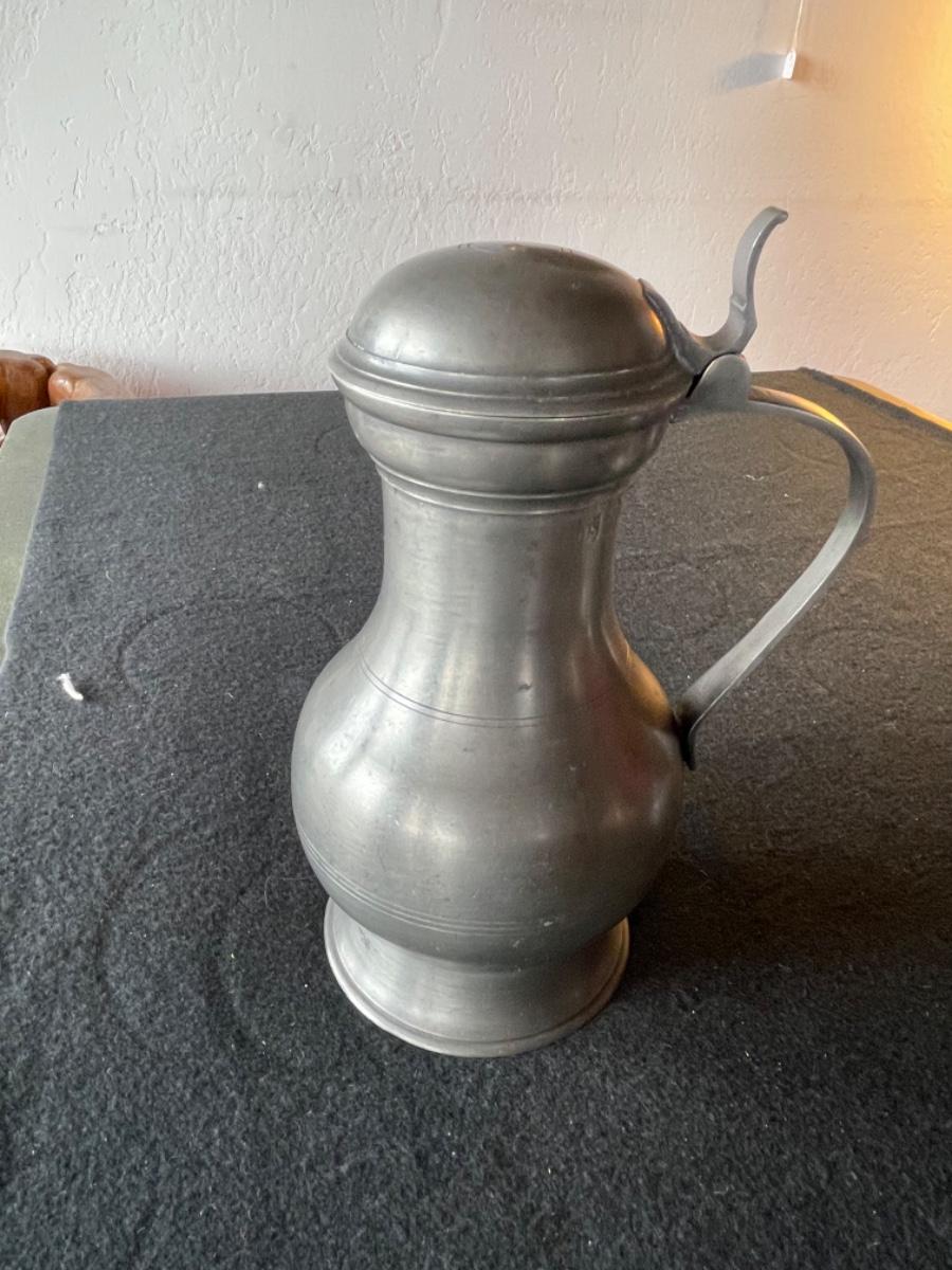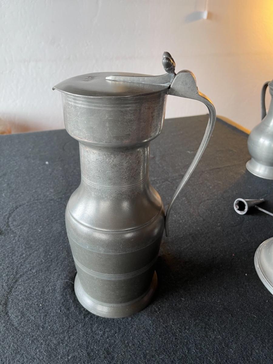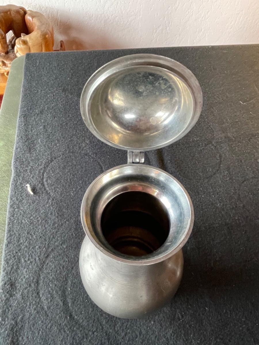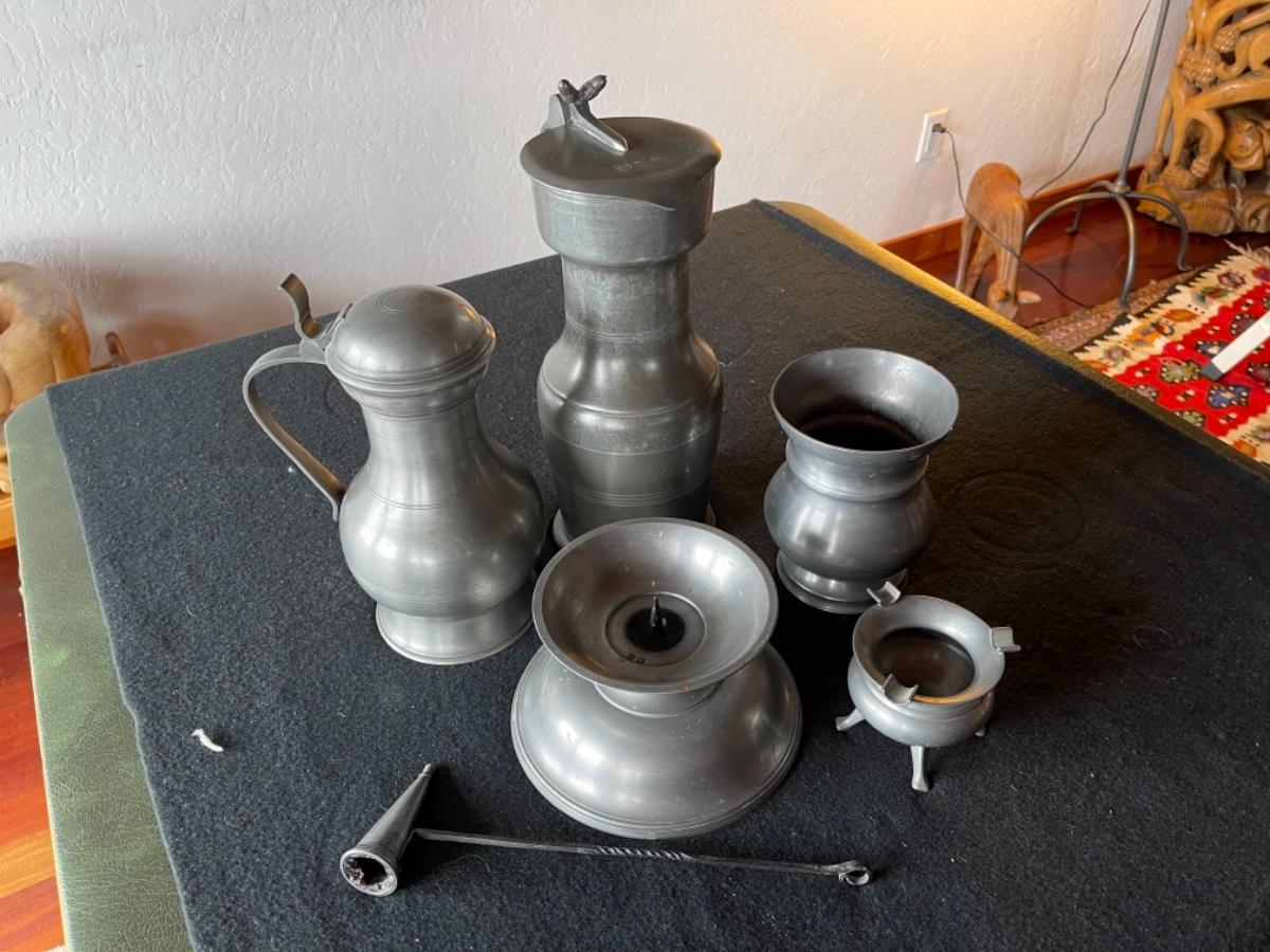 Brazilian Pewter, Brazil, Circa 1970, handmade, Signed, 3 John Summers stamped JS x MG, 1 Uormeb S.N., 1 Liarte, 1 unmarked. A) John Summers tall tankard/pitcher with lid, two acorns on lid handle, hallmarked JS X MG. Size 12” T. B) Tall tankard/pitcher with lid, unmarked. Size 10”T. C) Pedestal pillar candle holder with spike, marked JS MG, size 7”Round x 6”T. D) Small Vase, hallmark UORMEB S.N. S.U. DEL. REL. MG, Size 6”T. E) Small footed ashtray, hallmarked and stamped LIARTE MADE IN BRASIL, SIZE 3”T X 3”R. F) Candle snuffer, twisted handle, cone shape end, marked JS MG, size 10”L.
