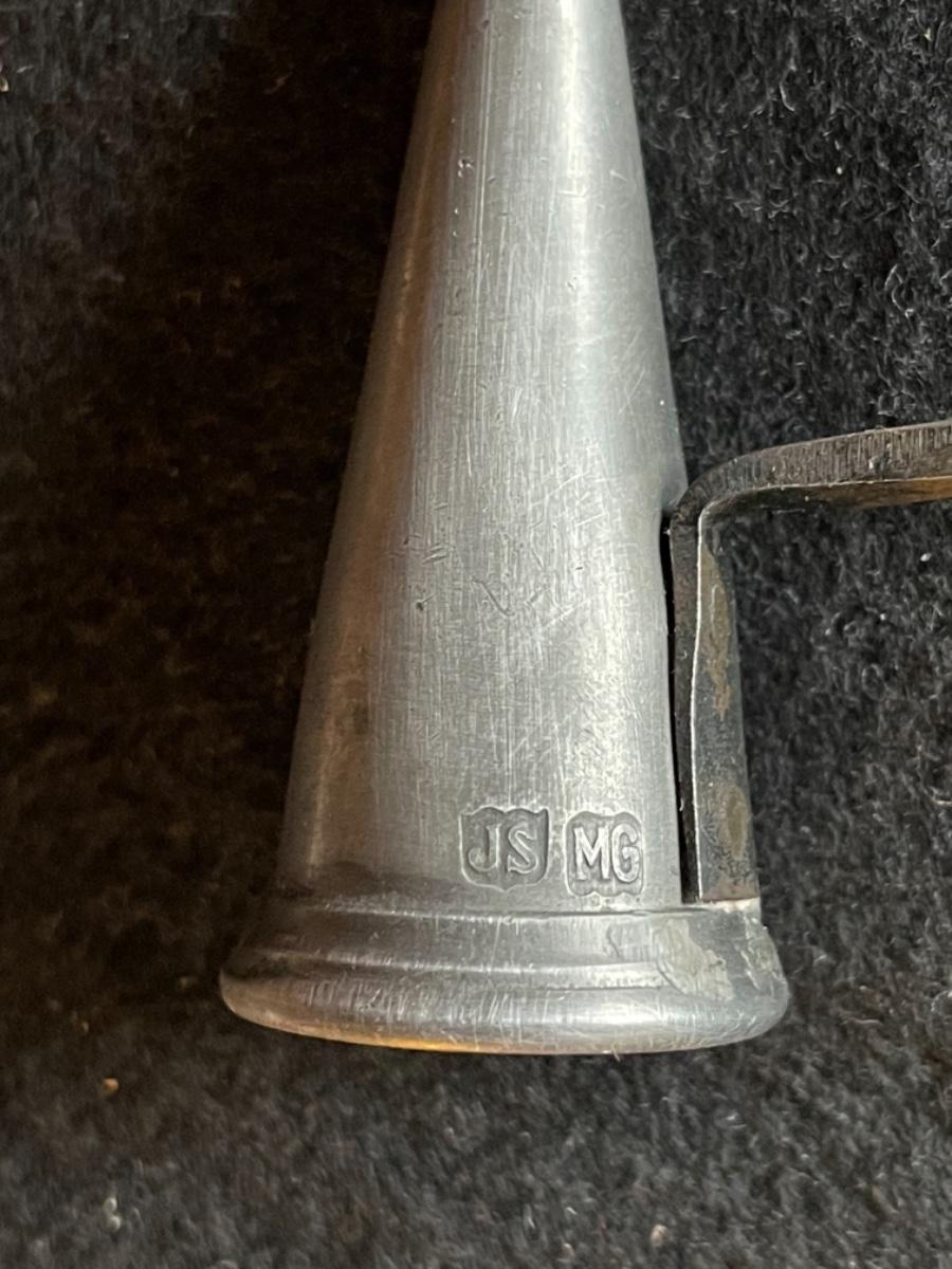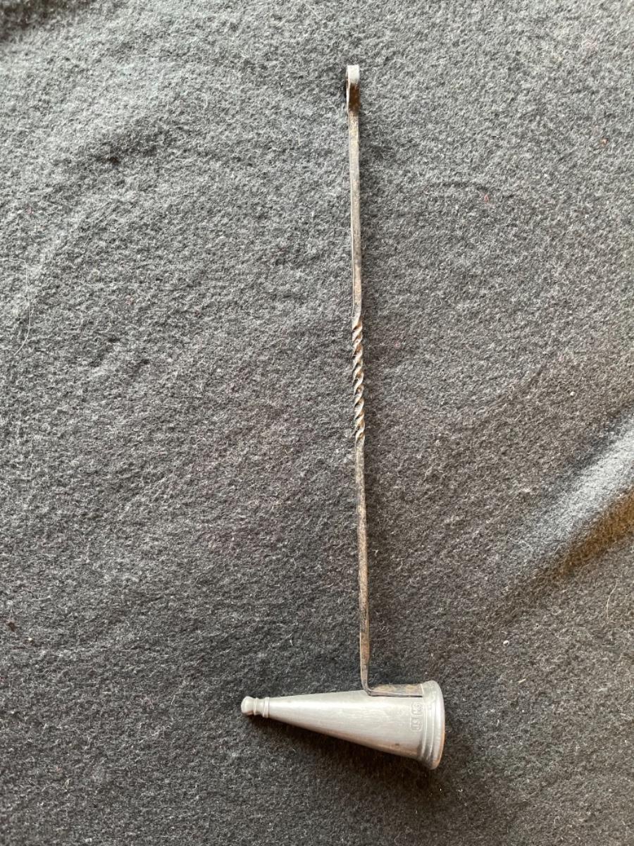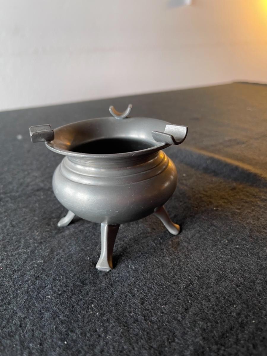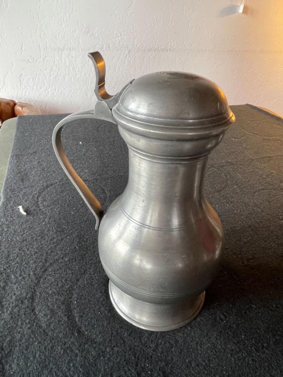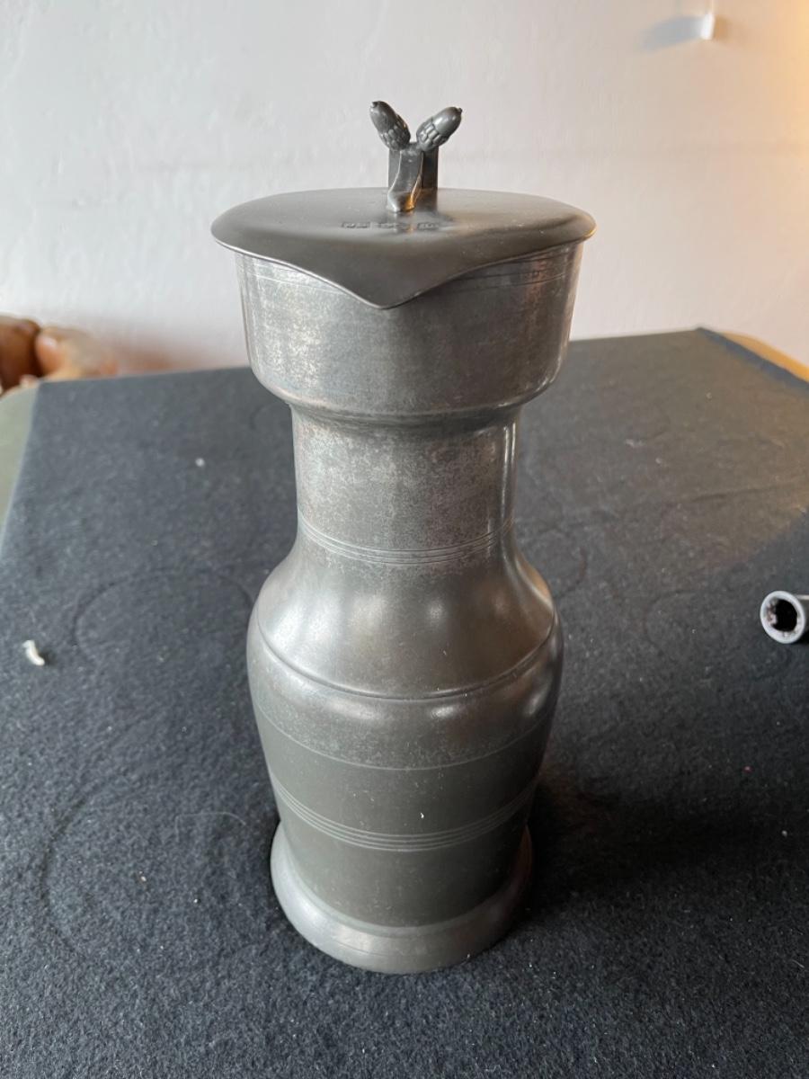 Brazilian Pewter, Brazil, Circa 1970, handmade, Signed, 3 John Summers stamped JS x MG, 1 Uormeb S.N., 1 Liarte, 1 unmarked. A) John Summers tall tankard/pitcher with lid, two acorns on lid handle, hallmarked JS X MG. Size 12” T. B) Tall tankard/pitcher with lid, unmarked. Size 10”T. C) Pedestal pillar candle holder with spike, marked JS MG, size 7”Round x 6”T. D) Small Vase, hallmark UORMEB S.N. S.U. DEL. REL. MG, Size 6”T. E) Small footed ashtray, hallmarked and stamped LIARTE MADE IN BRASIL, SIZE 3”T X 3”R. F) Candle snuffer, twisted handle, cone shape end, marked JS MG, size 10”L.