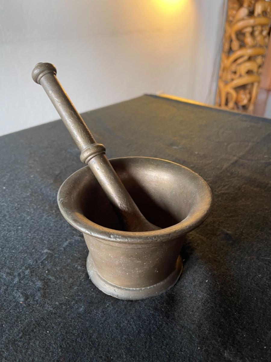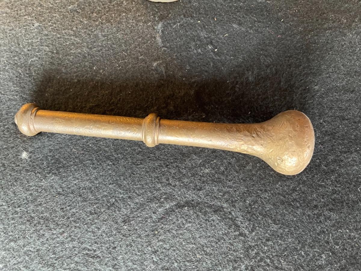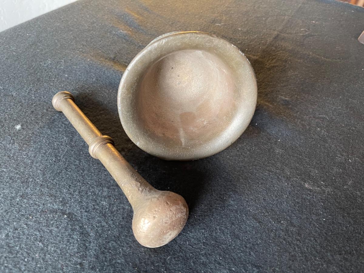 Mortar and Pestle, Brass and copper, heavy, country of origin Peru, circa 1800’s. Mortar size 3 1/2”T x 5” Diameter. Pestle size 8 1/2” L x 3/4” Diameter.
