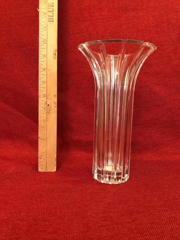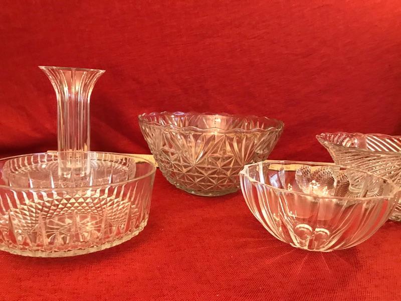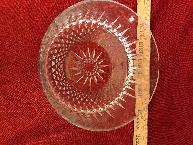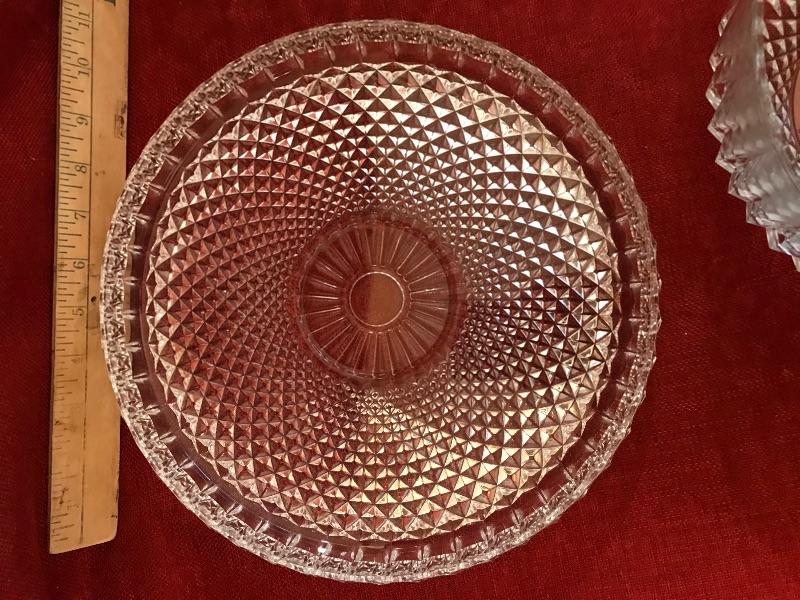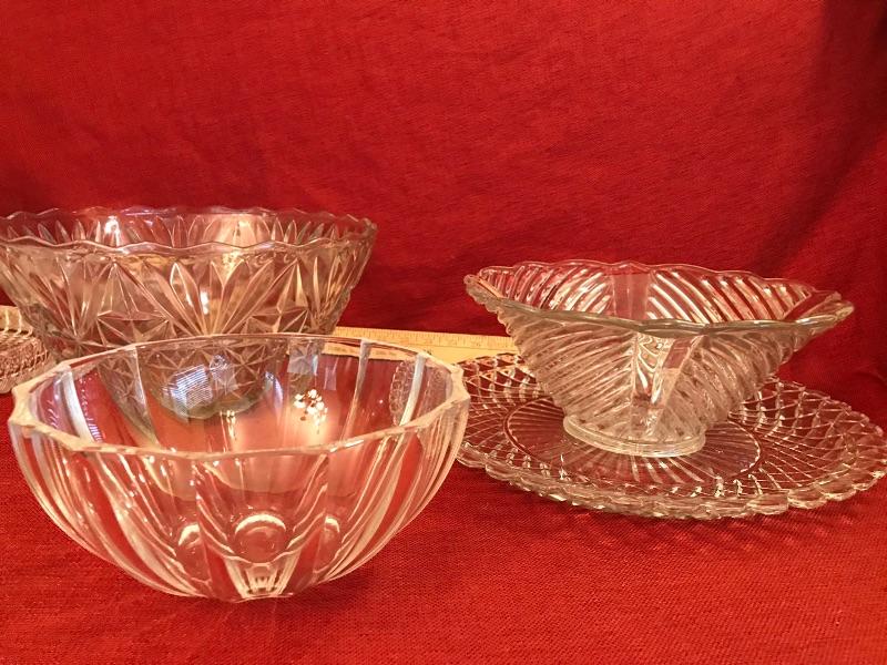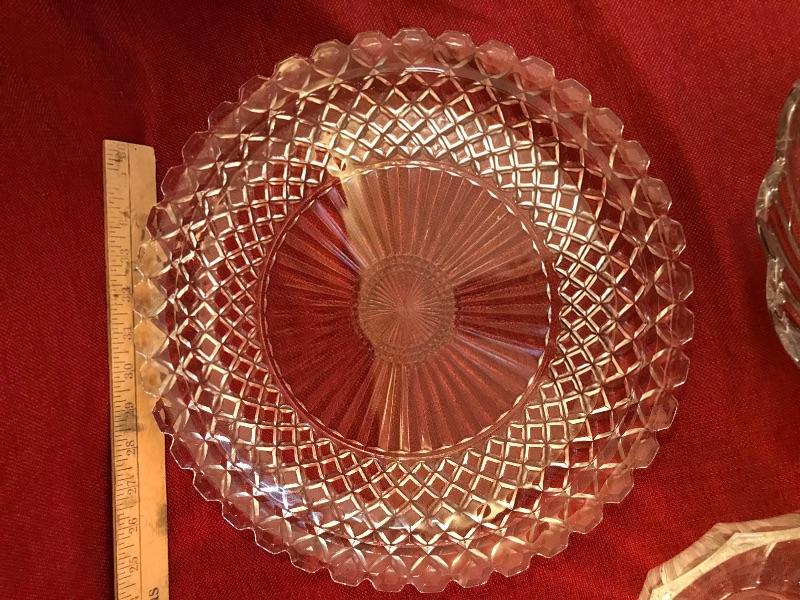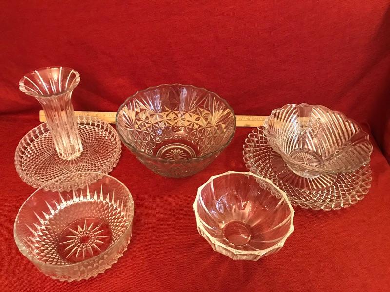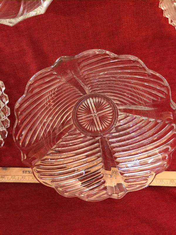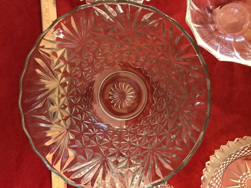 7 pieces of cut glass, leased, platters, vase, bowls.