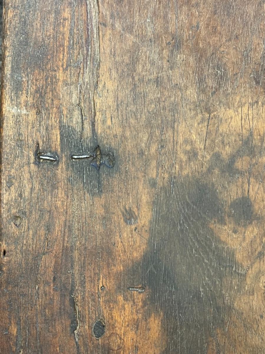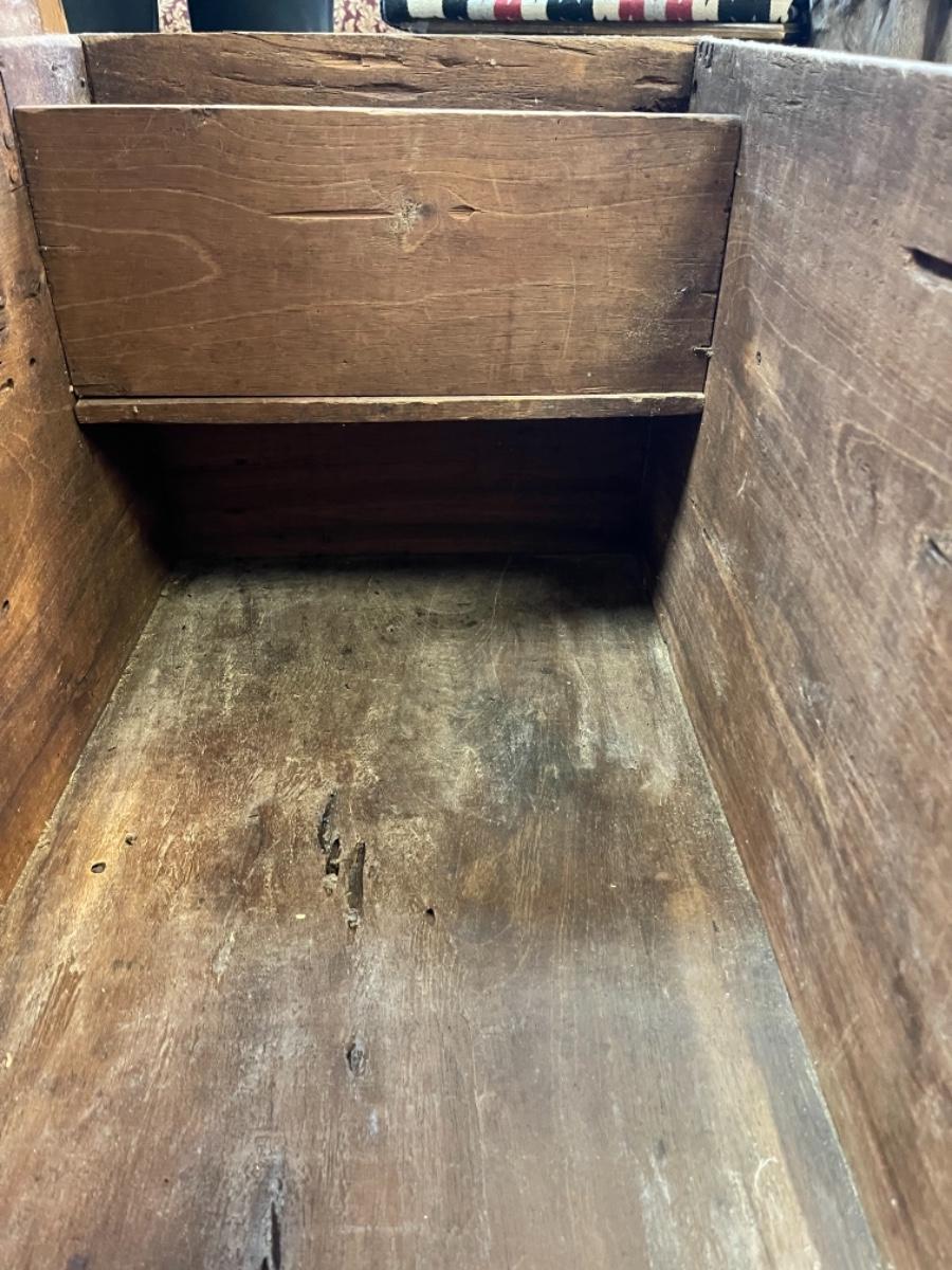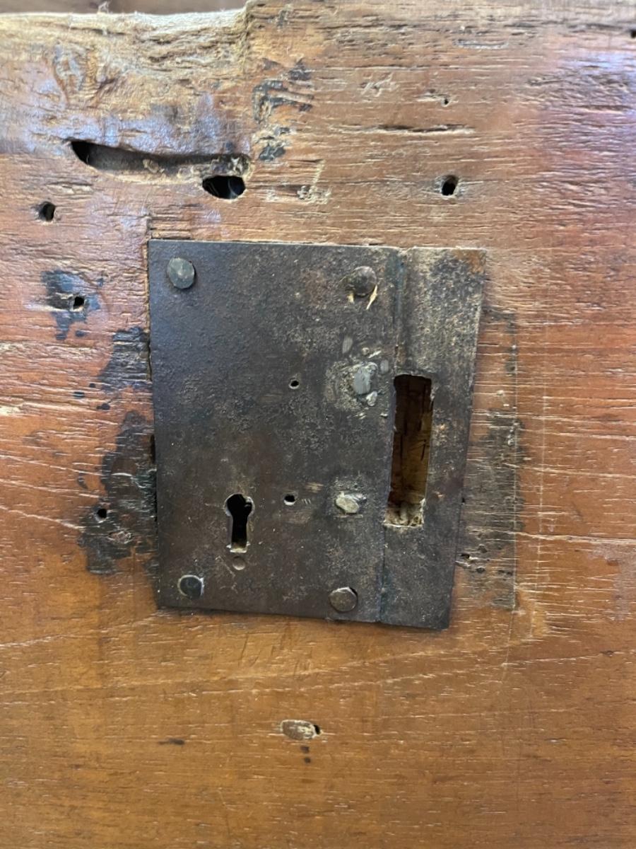 Large Antique 17th-18th Century Brazilian Voyage / Sea / Officers Trunk, footed, large dovetail, iron hinges, iron lock and key, possibly walnut or dark pine, sold planks, small tray on one side, measures 51”L x 20 1/2”D x 24 1/2”T. The chest inside is 17” Deep and the small tray is 6” W x 8 3/4” D. It is in great condition for it’s age. The only nails used are hand forged ones for the hinges and locks. There are some iron staples embedded on the lid, see photos. This trunk was purchased in 1960’s Brazil in the Historical city of Tiradentes in the state of Minas Gerais and shipped to the US by the owners.