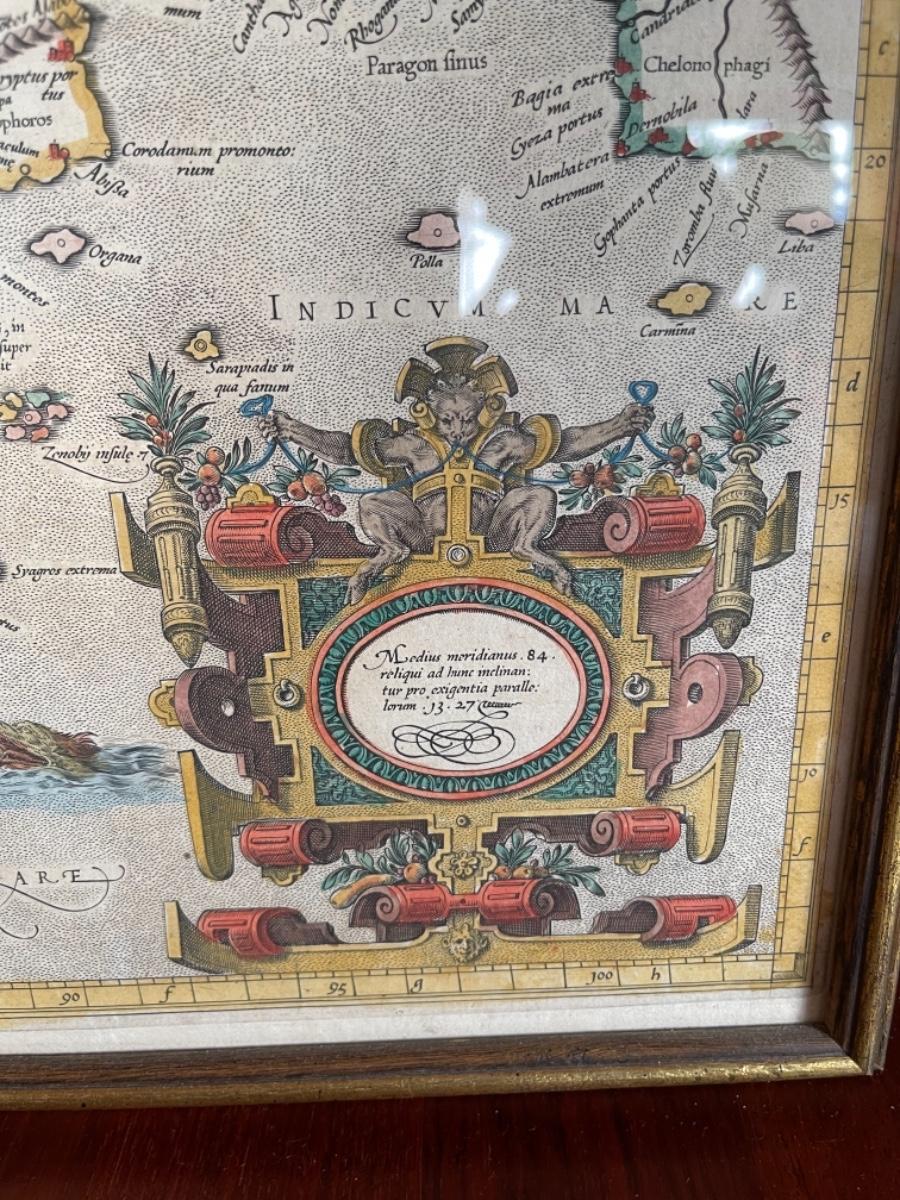 Hand drawn and colored map of Arabia, circa 1719, custom frame. Cartouche has beast with hooves holding ribbons and fruit. Size 14”H x 19”L, with frame 16”H x 20”L.