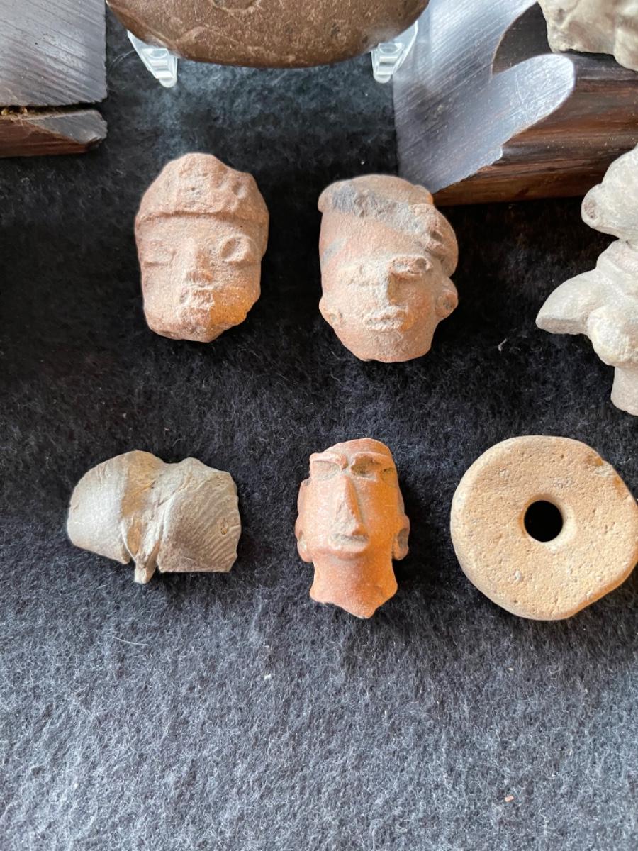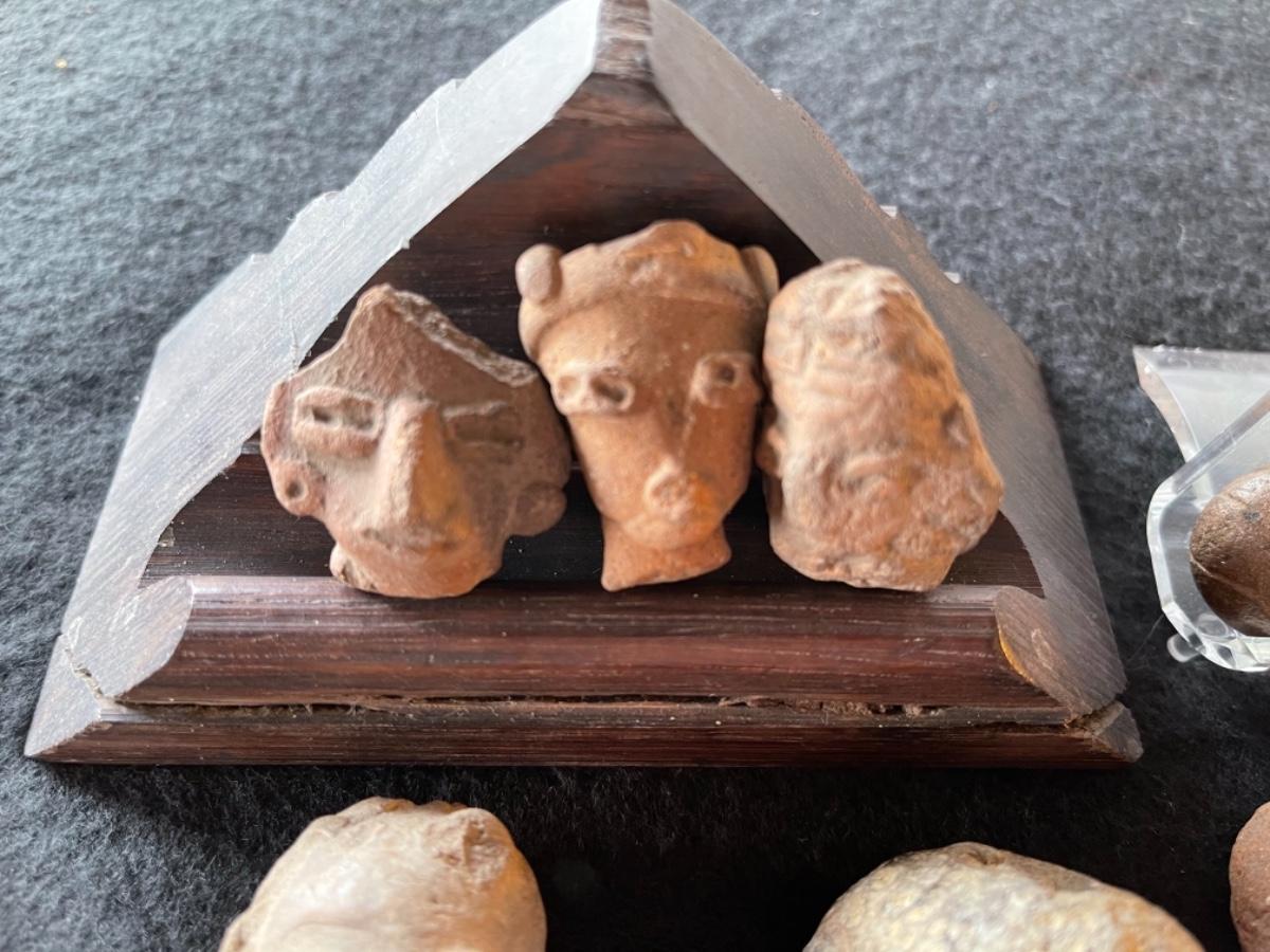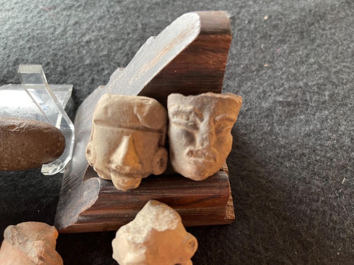 Pre-Colombian pottery fragments: figurine heads, disk, rock carving, fossil, bone, metal ball. Provenance and age unknown.