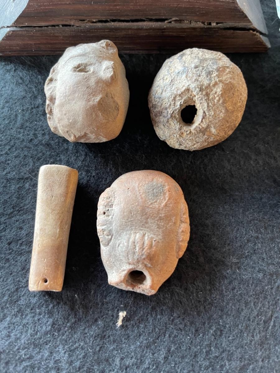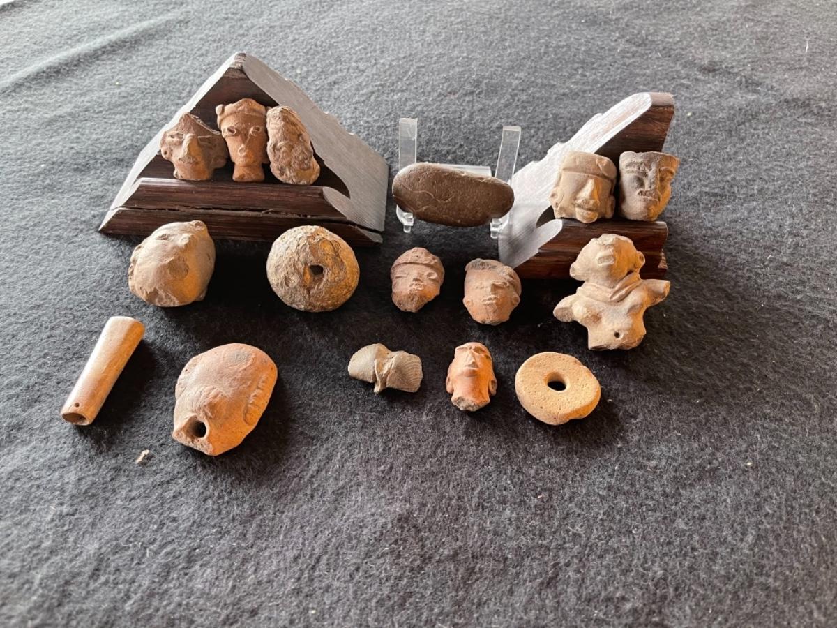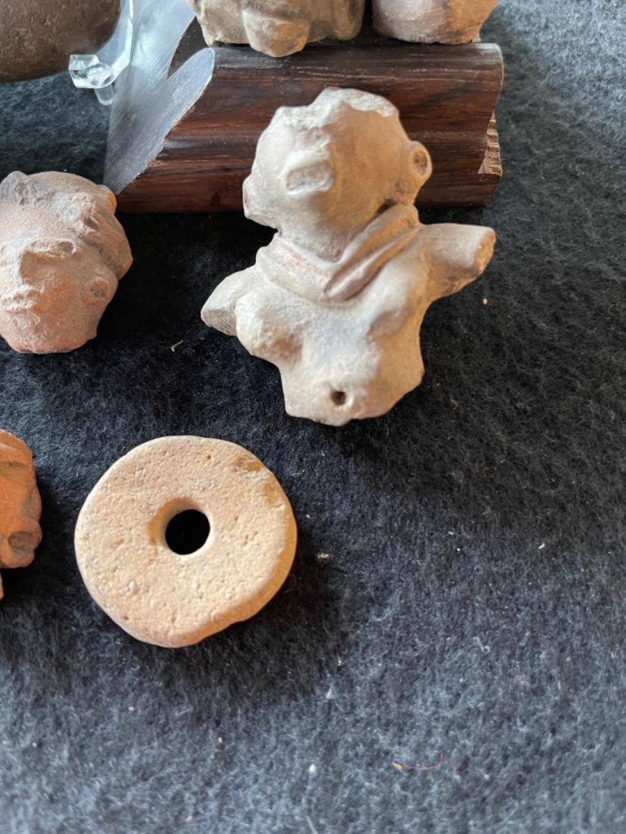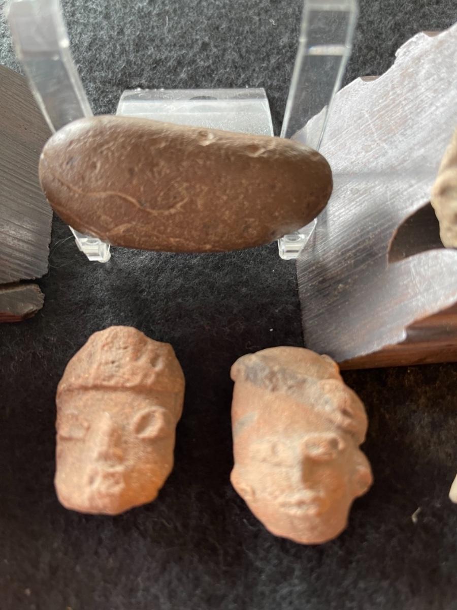Pre-Colombian pottery fragments: figurine heads, disk, rock carving, fossil, bone, metal ball. Provenance and age unknown.
