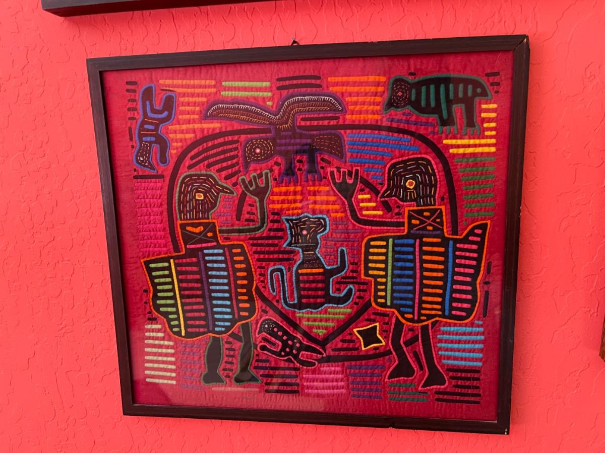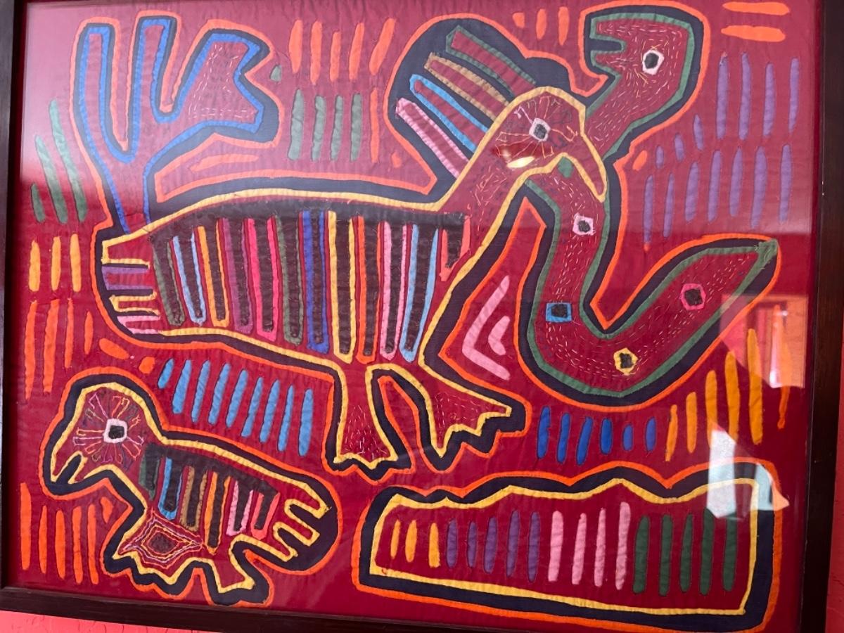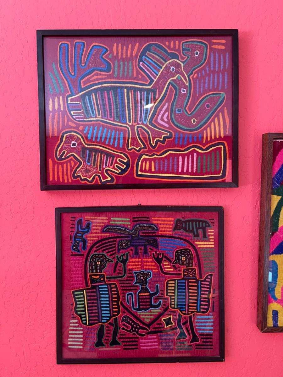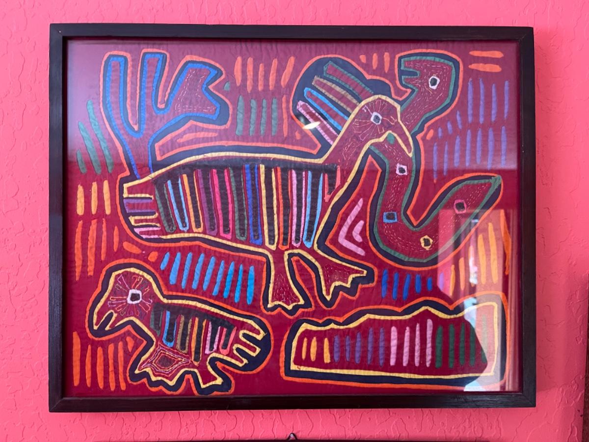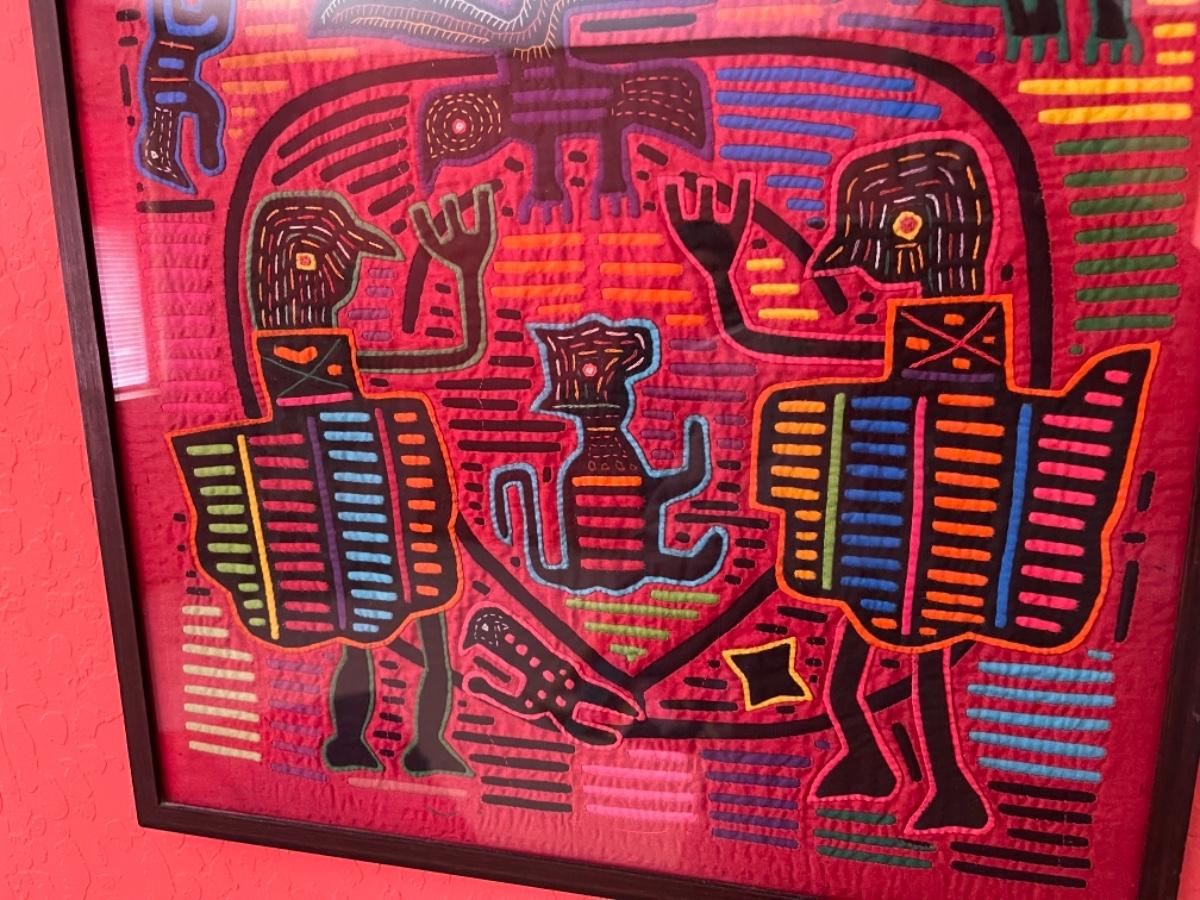 Item 36. Pair of Peruvian framed Kuna Mola textile art panels, bird scenes. Circa 1970s,
