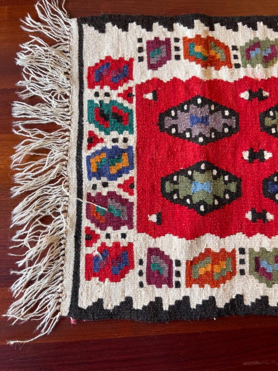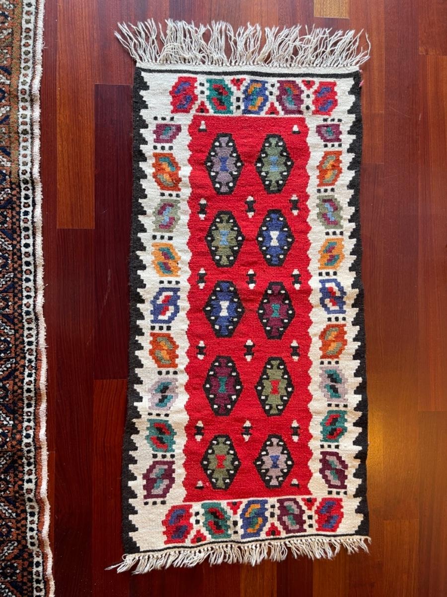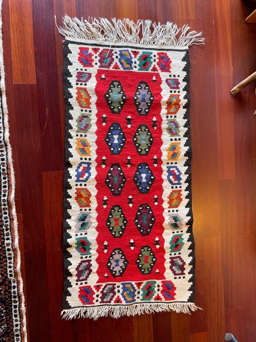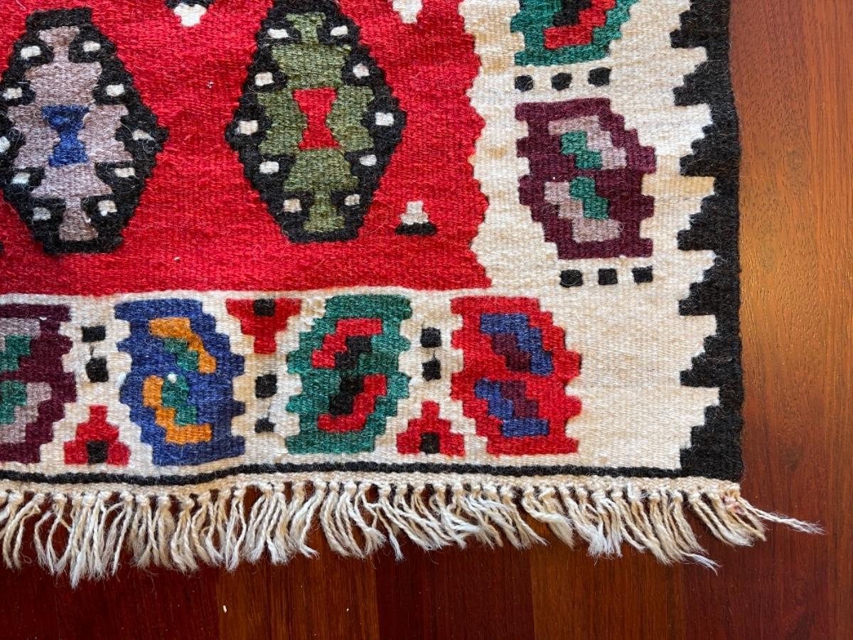 Turkish Rug, 1960s, hand woven, wool, white border with red center and multicolored diamond motifs, odd rectangular shape, white fringe. Size 20”W x 42”L. $102