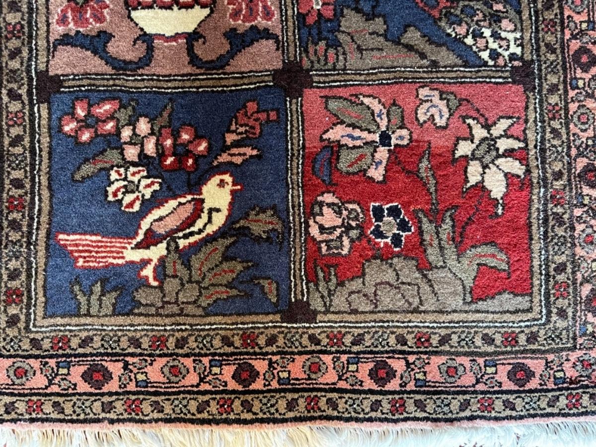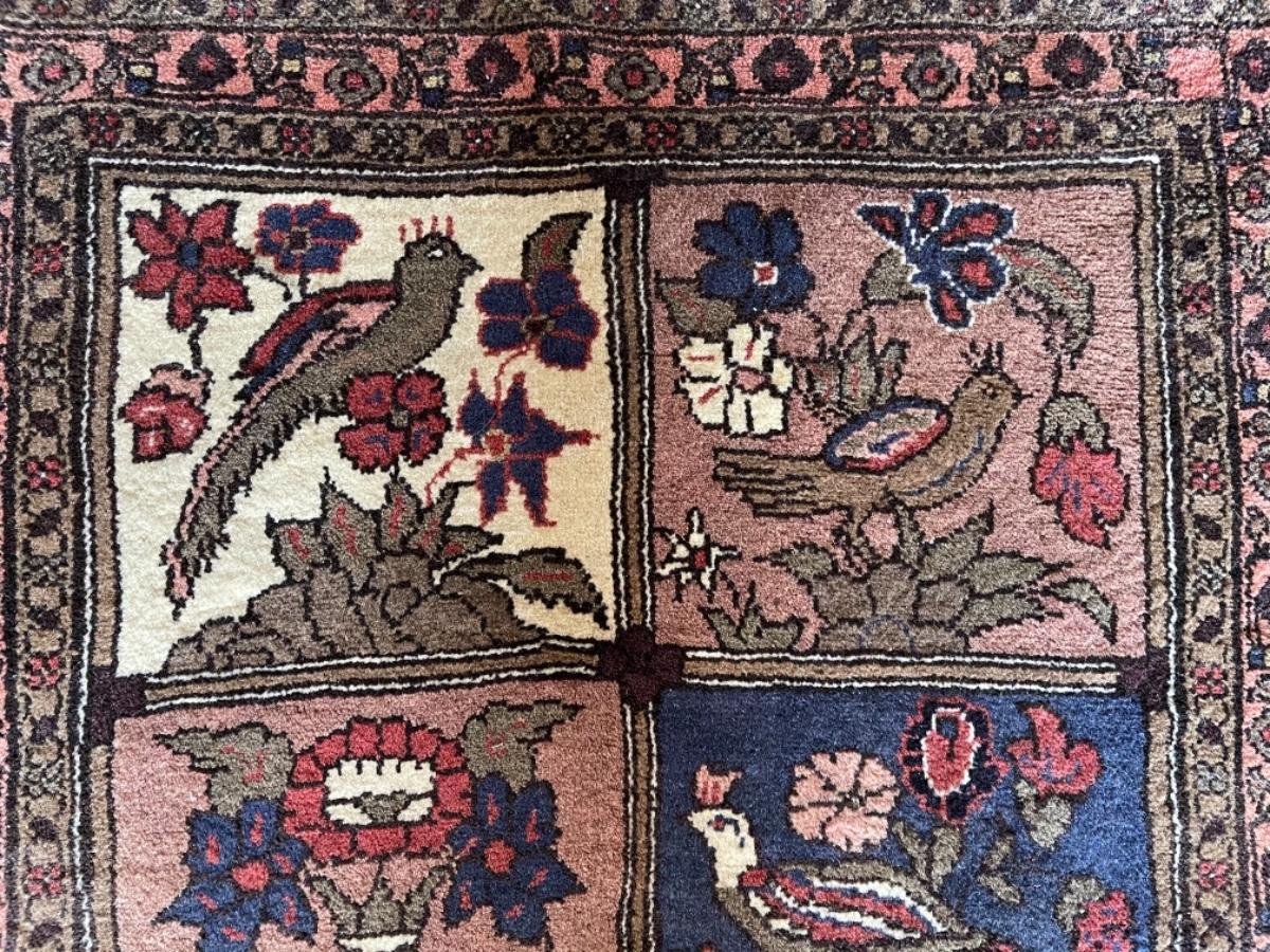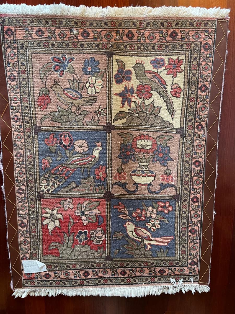Persian Rug, 1960’s, hand woven, wool, taupe and rose floral boarders with bird and flower Motifs in squares of navy and maroon, cream and mauve background, white fringe. Label on back of rug, size 29”W x 38”L.